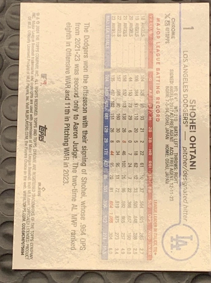 The product is a topps chrome baseball trading card featuring Shohei Ohtani from the Los Angeles Dodgers. This specific card is a 2024 Topps Chrome #1 Sepia Refractor, making it a valuable buy back for collectors. The card is part of the base set for the 2024 season and showcases Ohtani as a standout player in Major League Baseball.