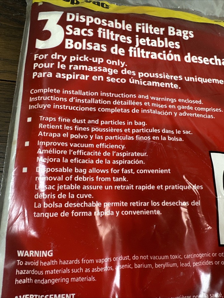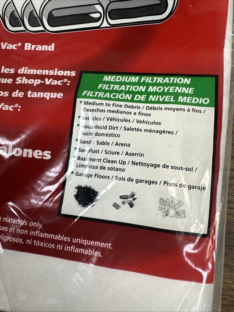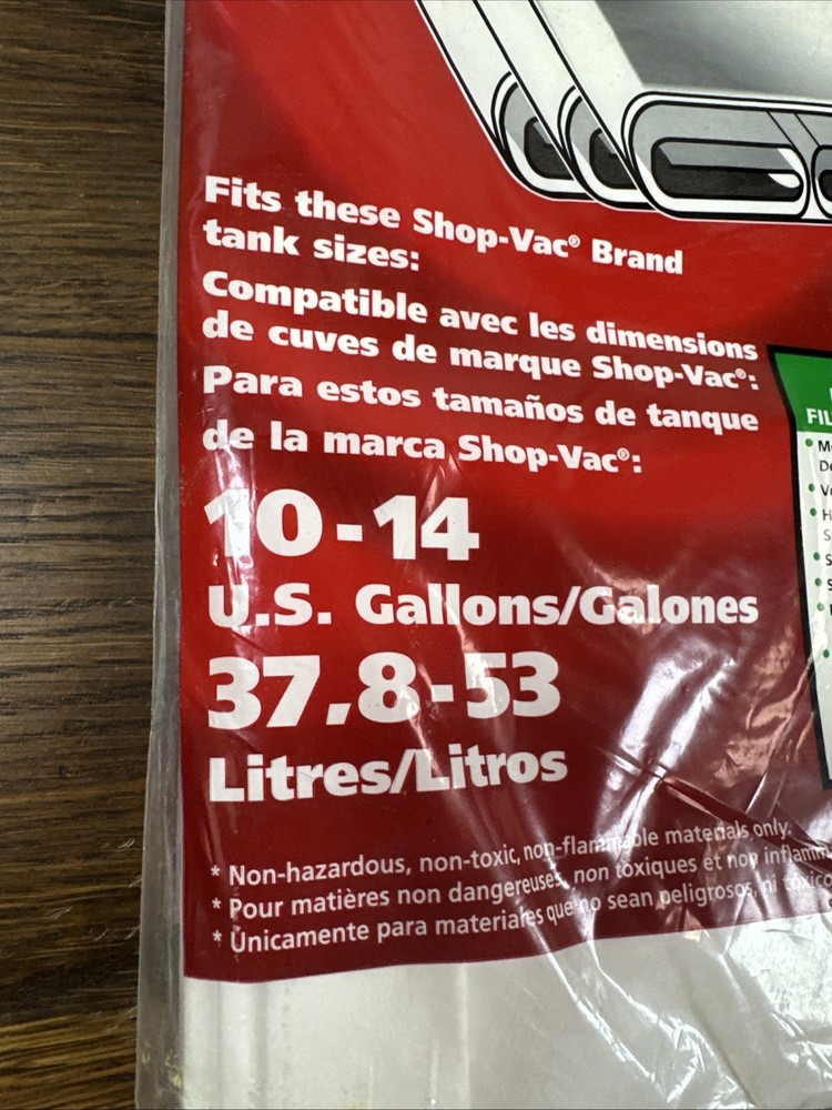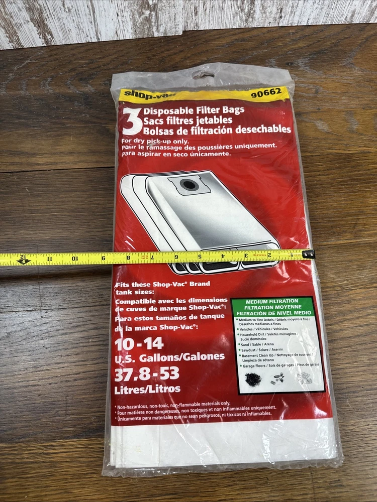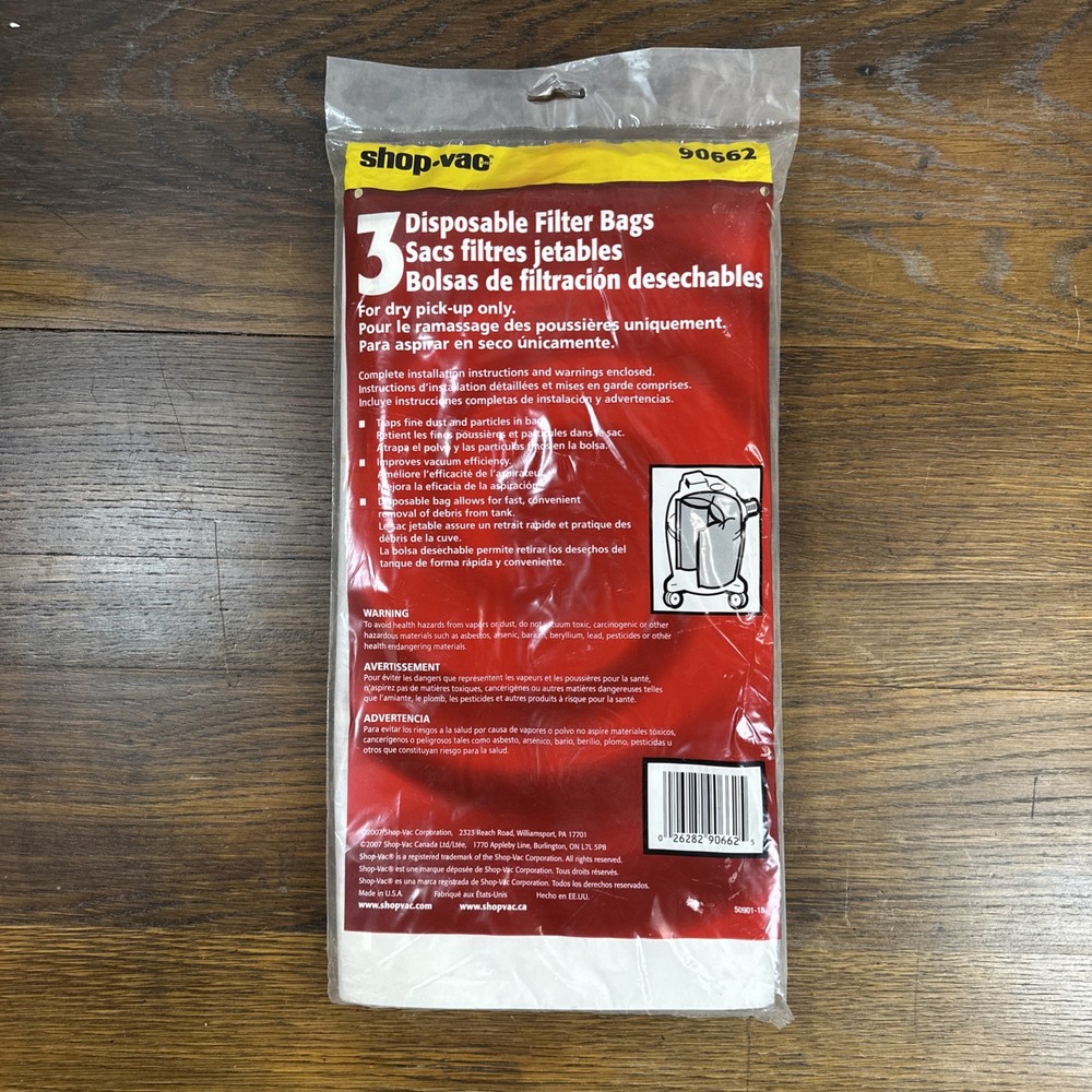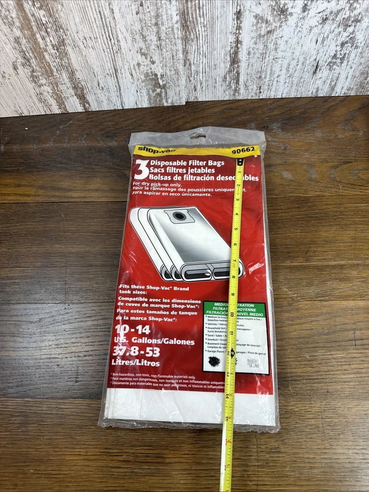 New – Factory sealed. Packaging shows minor storage wrinkles but bags are unused and sealed inside. 📦 Item Specifics • Brand: Shop-Vac • Model: 90662 • Type: Disposable Filter Bags • Quantity: 3 Bags • Tank Compatibility: 10–14 Gallon • Liters: 37.8–53L • For Dry Pick-Up Only • Filtration: Medium Genuine Shop-Vac 90662 Disposable Filter Bags – 3 Pack. Designed for dry pick-up applications including sawdust, household dirt, garage debris, and fine particles. Fits Shop-Vac brand 10–14 gallon tanks. Factory sealed. Packaging may show light storage wear and wrinkles from shelf life, but contents remain unused. Perfect replacement set for shop, garage, or workshop maintenance. Ships securely packaged.