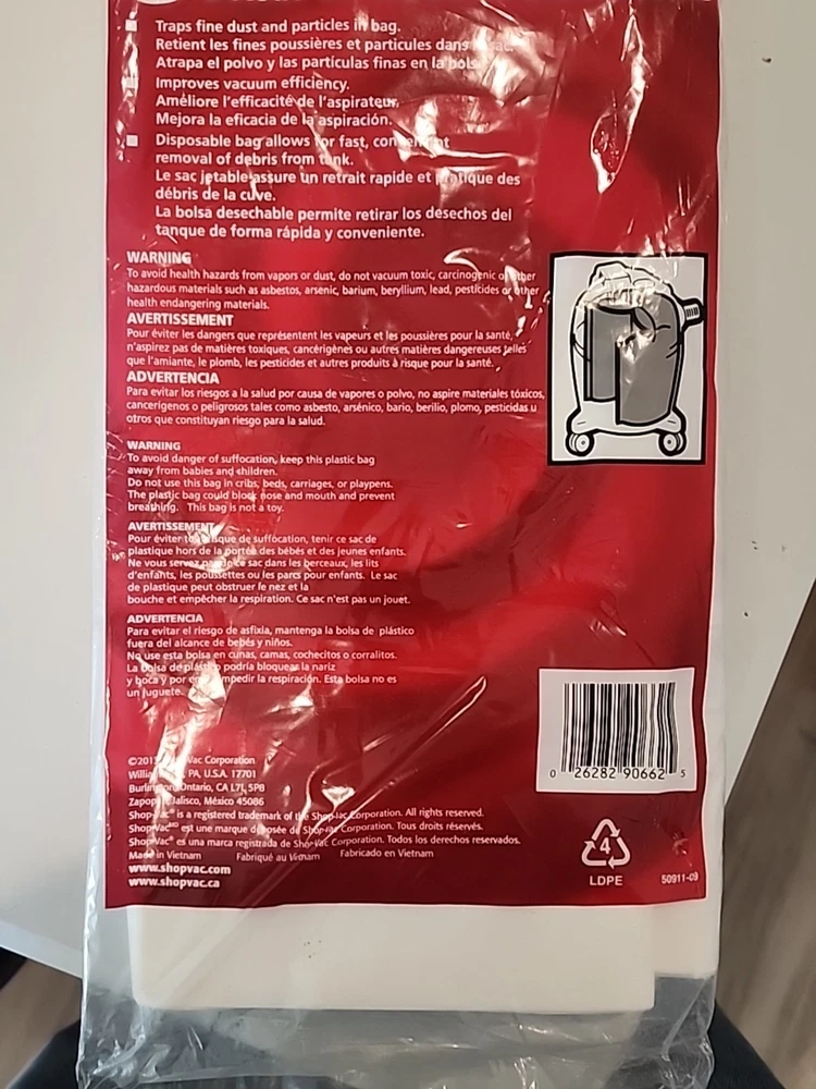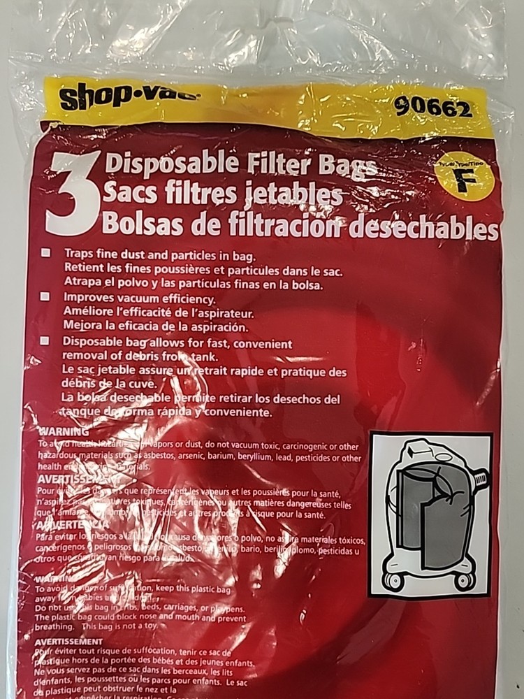Features: Disposable UPC: 0026282906625 Number in Pack: 3 Compatible Brand: Universal Brand: Shop-Vac MPN: 9066200 Type: Vacuum Cleaner Bags gtin13: 0026282906625 Number of Items in Set: 3 Compatible Model: Universal
