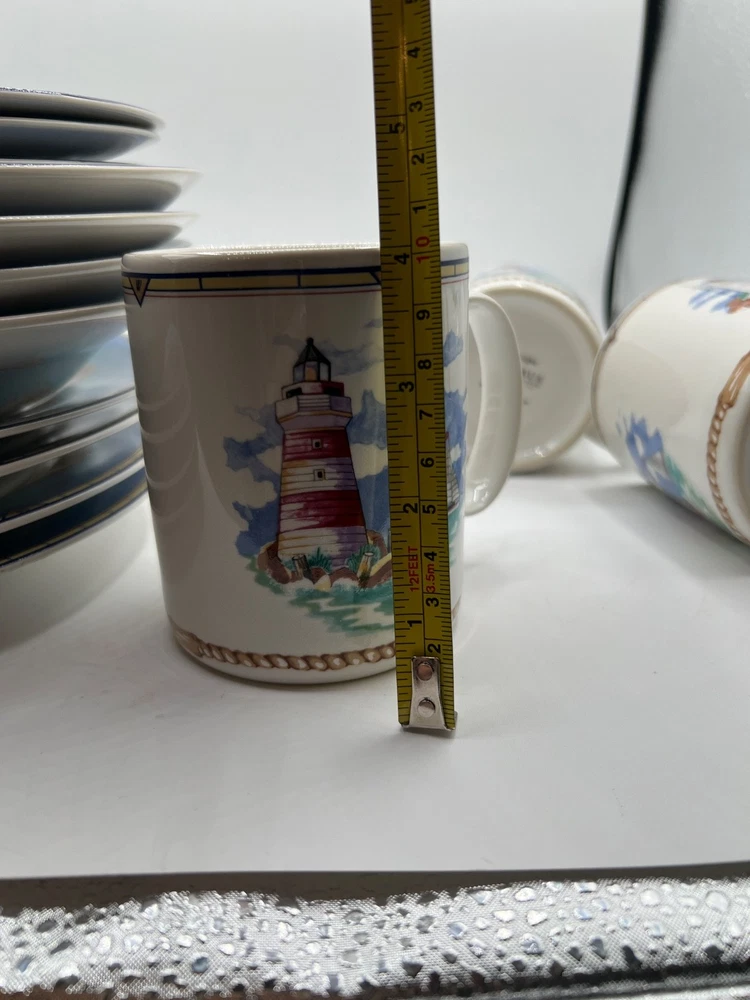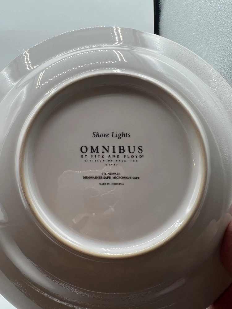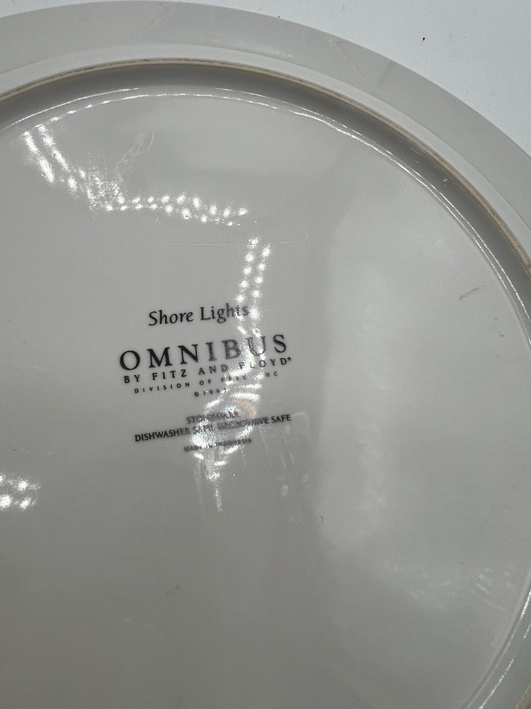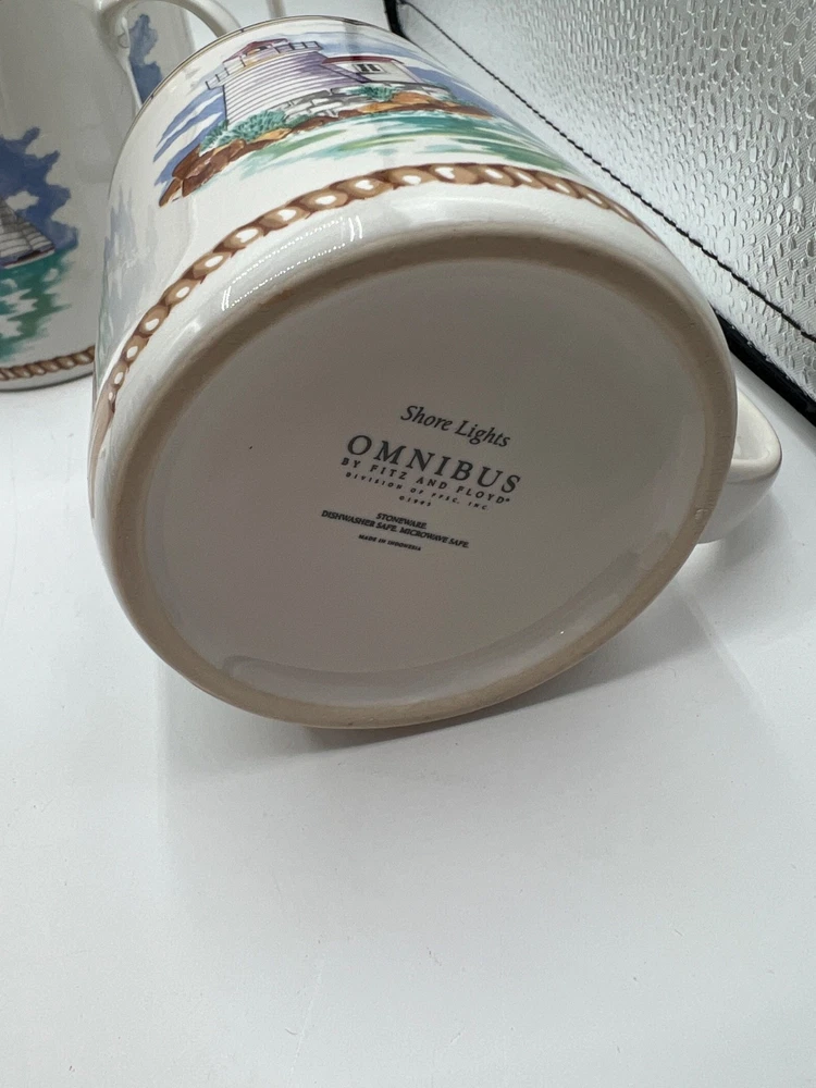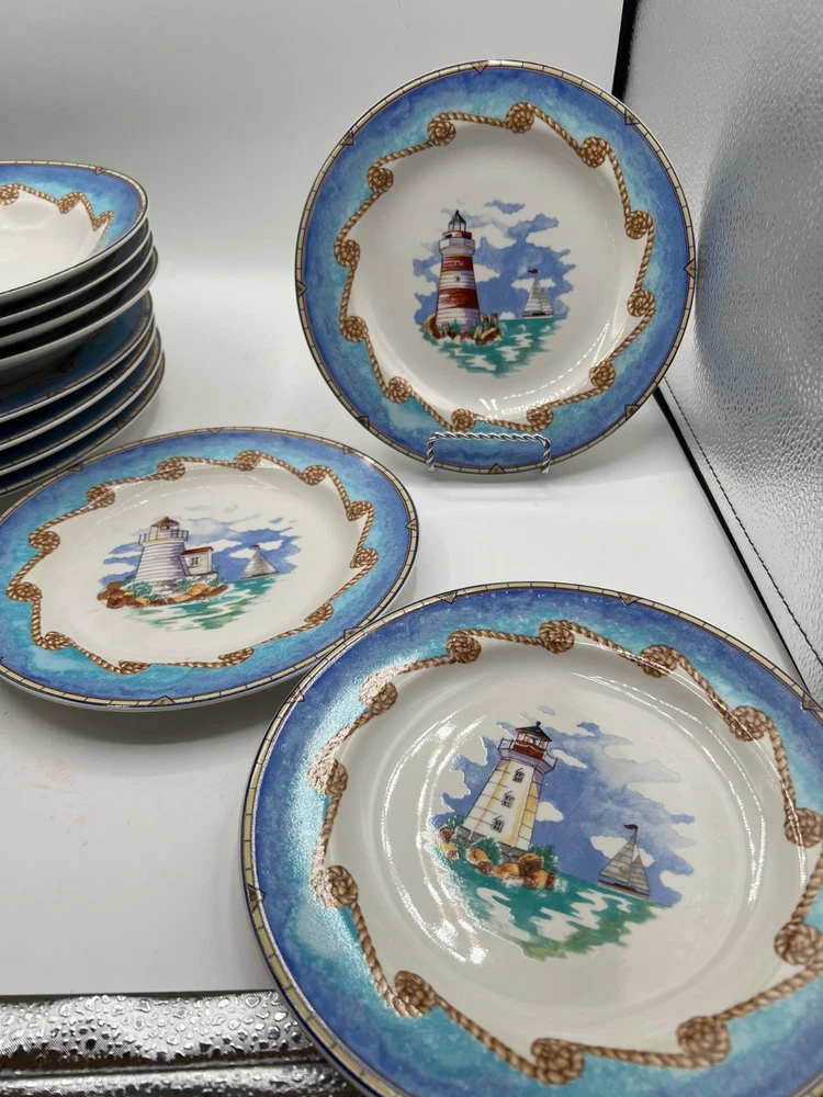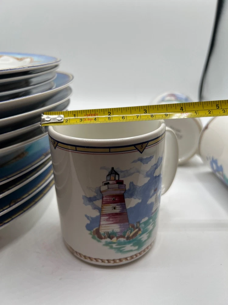 The Shore Lights Omnibus by Fitz & Floyd Stoneware service set of 4 includes dinner, salad plates and 4 soup bowls, and 3 coffee mugs all featuring a nautical theme in a multi-color design. Made of ceramic and porcelain, these original pieces are crafted with pottery in Indonesia, making them a unique and decorative addition to any collection. Perfect for serving up your favorite meals in style, this set is sure to be a conversation starter at any table setting.
