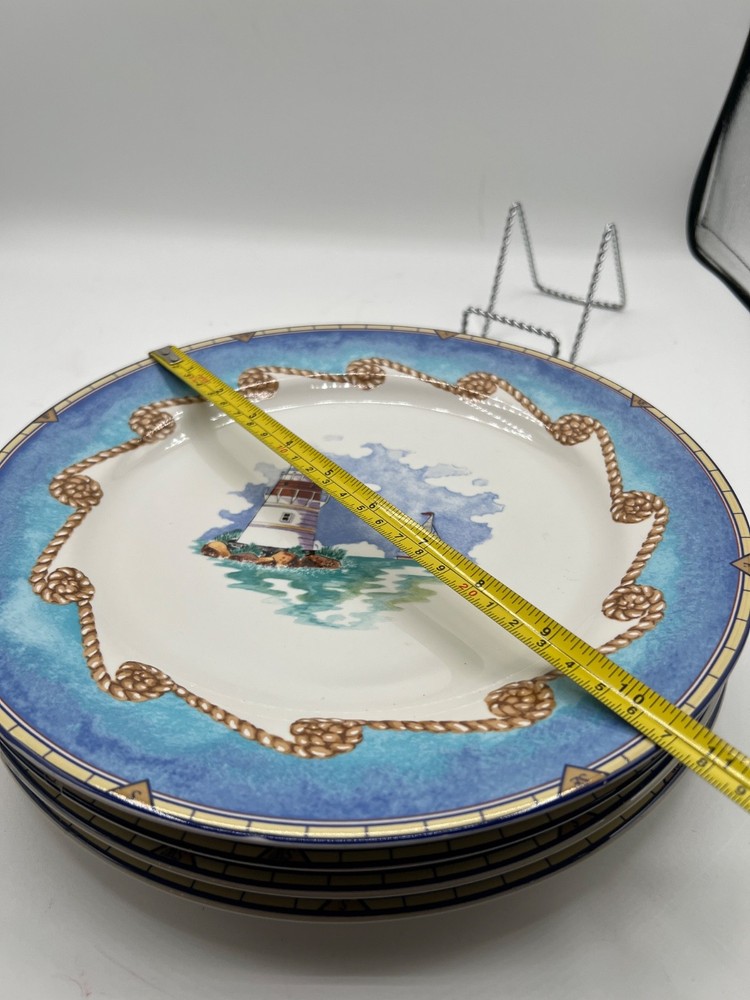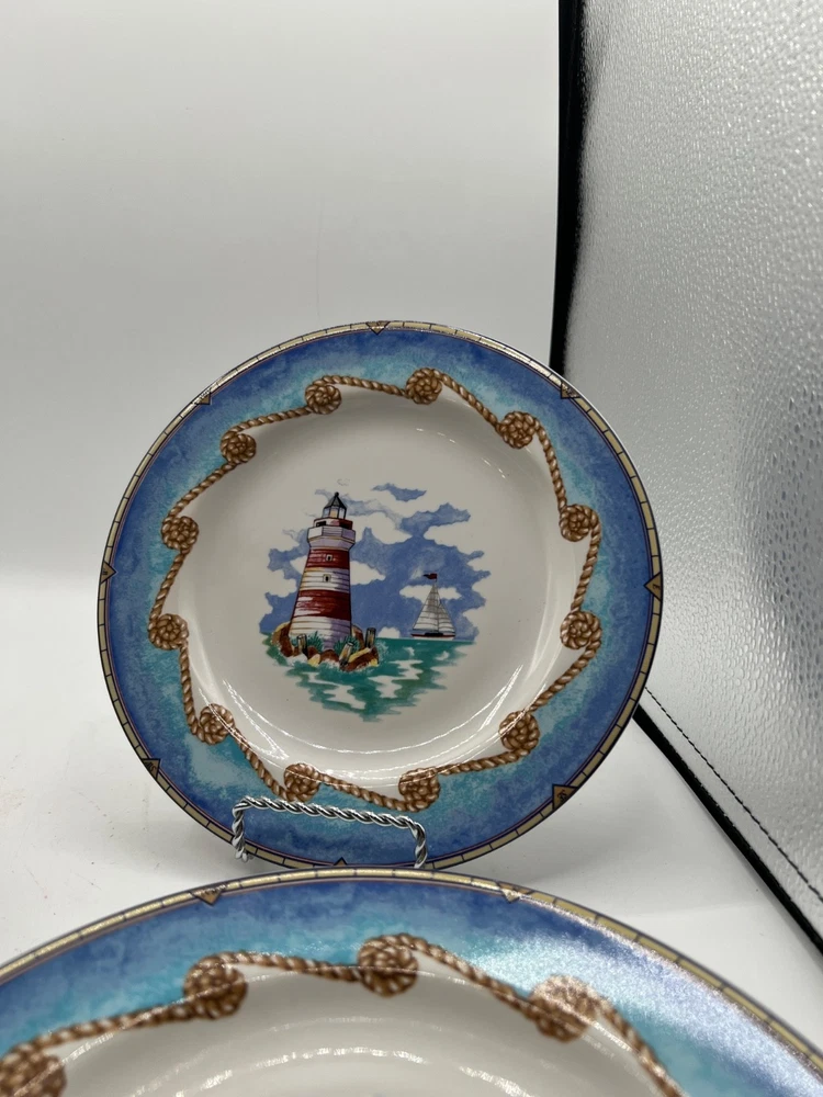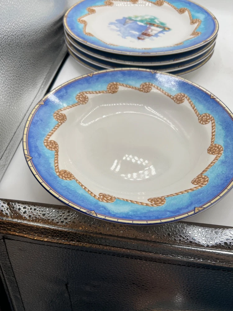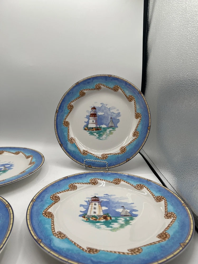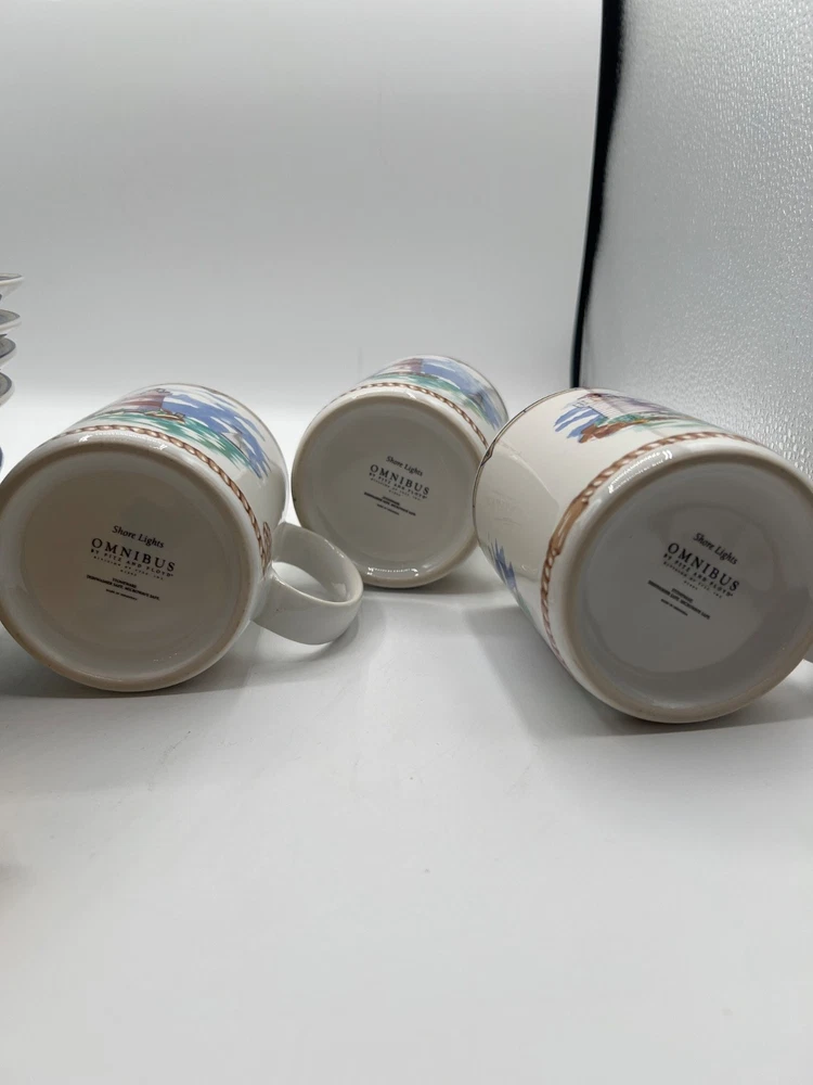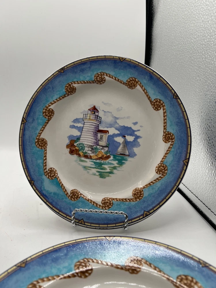The Shore Lights Omnibus by Fitz & Floyd Stoneware service set of 4 includes dinner, salad plates and 4 soup bowls, and 3 coffee mugs all featuring a nautical theme in a multi-color design. Made of ceramic and porcelain, these original pieces are crafted with pottery in Indonesia, making them a unique and decorative addition to any collection. Perfect for serving up your favorite meals in style, this set is sure to be a conversation starter at any table setting.