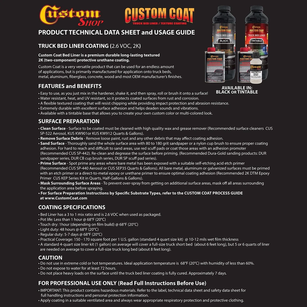 Professional Custom Coat Spray-On Truck Bed Liner 1 Quart Kit. Custom Tintable Color Kit Includes: 1 - 21 fl. oz. Cans of Tintable Truck Bed Liner Base, 1 - 8 fl. oz. Cans Custom Coat Standard Hardener and 1 - 3 fl. oz. Bottle of Basecoat Color Tint. Estimated coverage is 110 to 130 square feet @ 10 mils wet film thickness. Custom Coat Truck Bed Liner is a premium durable long lasting textured protective coating that can tolerate extreme climatic temperature conditions. It is heat, UV resistant and waterproof, so it protects coated surfaces from rust. Use it to help dampen sounds and vibrations. Custom Coat was developed to provide a great looking durable yet flexible textured surface and is a heavy duty 2 part urethane coating that is easy to apply. It provides the ultimate surface protection for almost any application. Unlike other protective and bed liner coatings Custom Coat is a flexible material that will resist chipping, while providing impact protection and abrasion resistance. These features and benefits make it perfect for its most popular application as a truck bed liner. Custom Coat is a very versatile product that can be used for endless amount of applications. Use it on truck beds, entire vehicle exteriors, chassis, bumpers, commercial vehicles, equipment and trailers. It's also great for home uses as non-skid coating for floors including garage floors, concrete, wood, steps, walkways, wood decks, docks, bath tubs, basement floors, walls, tool boxes and engine compartments. Easily achieve professional results with our DIY Custom Coat Kit Packages. Kits are available in various sizes from 1 quart to 2 gallon. Kits are also available with either a Spray Applicator Gun or a Paint Roller Application Set. Custom Coat also offers Urethane Tint Concentrate in over 50 colors, so you can choose either a single color or use different colors to create your own multi-colored custom look or use the colors that will make a great camouflage pattern.