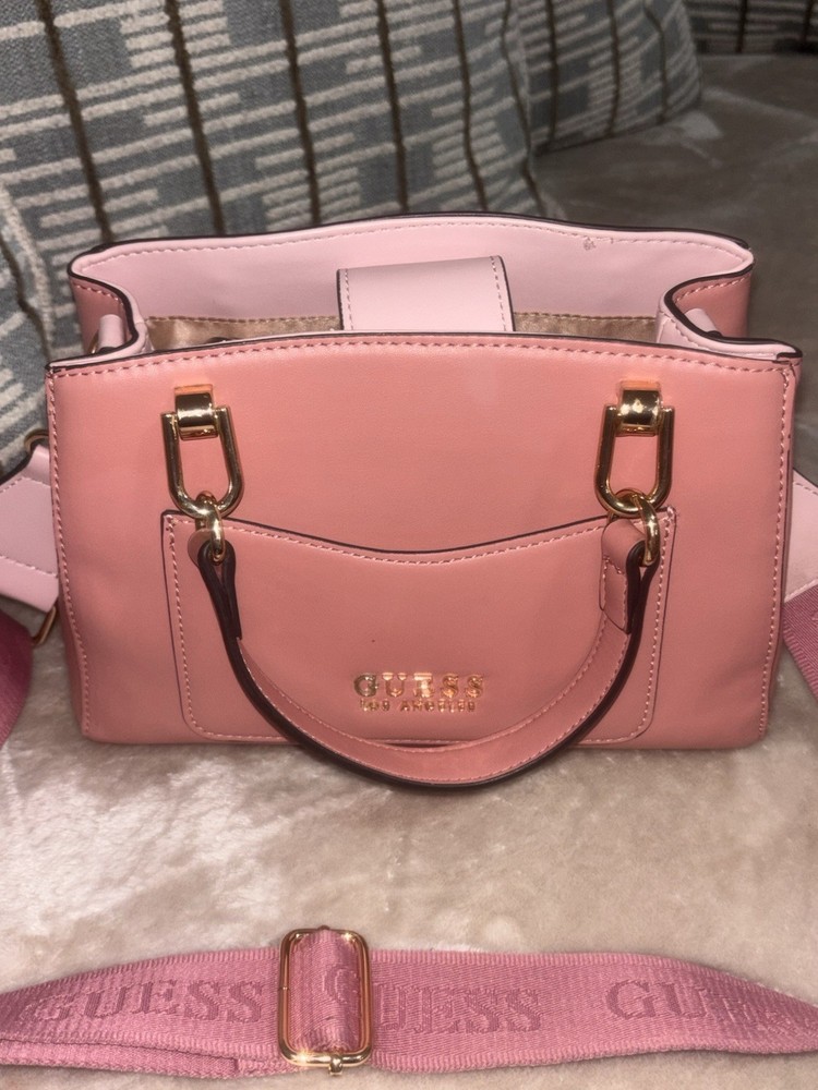 The product is a small rectangle shaped shoulder bag and handbag by Guess, featuring gold hardware and an adjustable shoulder strap. The exterior is made of faux leather in a pink color with silver hardware accents. The bag has a zip closure and is lined with fabric. It is not vintage and is designed for women who appreciate designer accessories. Perfect for carrying everyday essentials, this stylish bag combines fashion and functionality with its adjustable strap for added convenience.