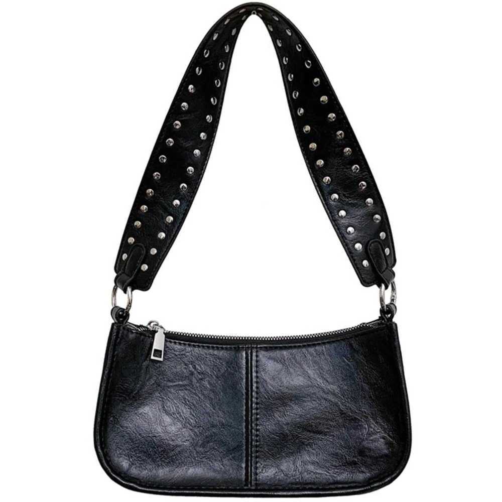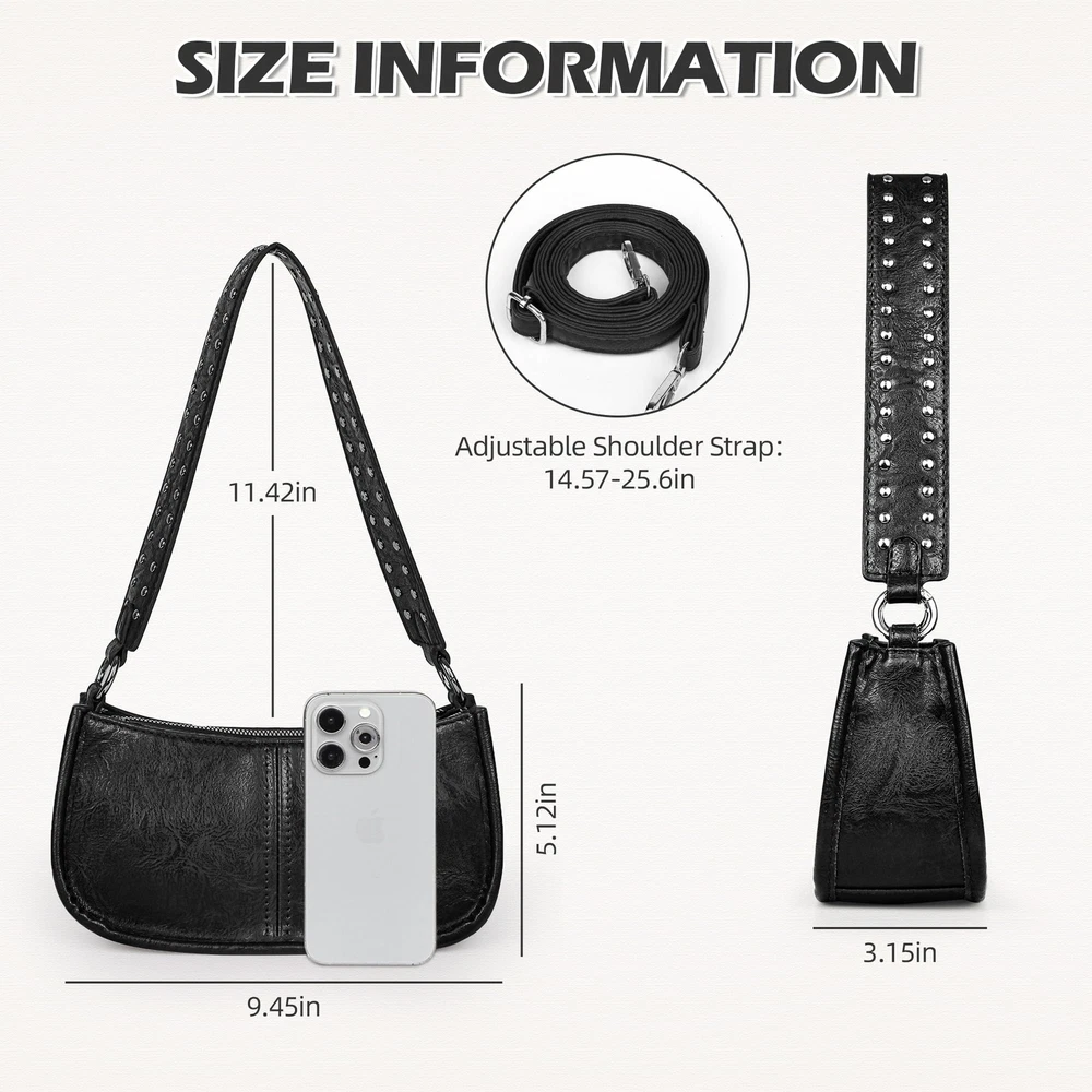 Premium material: This black shoulder bag is made of premium PU leather and polyester lining,which is comfortable to the touch while being easy to maintain.Besides,the custom wide shoulder strap with chic rivet decoration not only brings you a comfortable experience, but also makes this small womens black purse retro and stylish Size and Capacity: Black small shoulder purse measures: 9.45"(L)x5.12"(W)x3.15"(H). Includes one main pocket and one interior zip pocket.The vintage vegan leather small shoulder bag are roomy enough to fits your daily necessities, such as cellphone,lipsticks, keys, wallet,and other small necessities Fashion Y2K Purses: Womens shoulder bags designed with retro y2k style,which is cute,unique and fashionable.For those who like to pursue individual fashion, this chic black handbag have become a retro return fashion choice Versatile Purse: Equipped with a short wide shoulder strap and an adjustable long shoulder strap,this trendy purse for women can be used as a shoulder bag,handbag,underarm bag and crossbody bag according to your needs Occasion: This cute vintage 90s purse can match well with any outfits, which is perfectly meet your daily needs like working, dating, shopping, traveling,etc.Super cute 90s vibes all the way! You will get many compliments on this black women's shoulder handbag