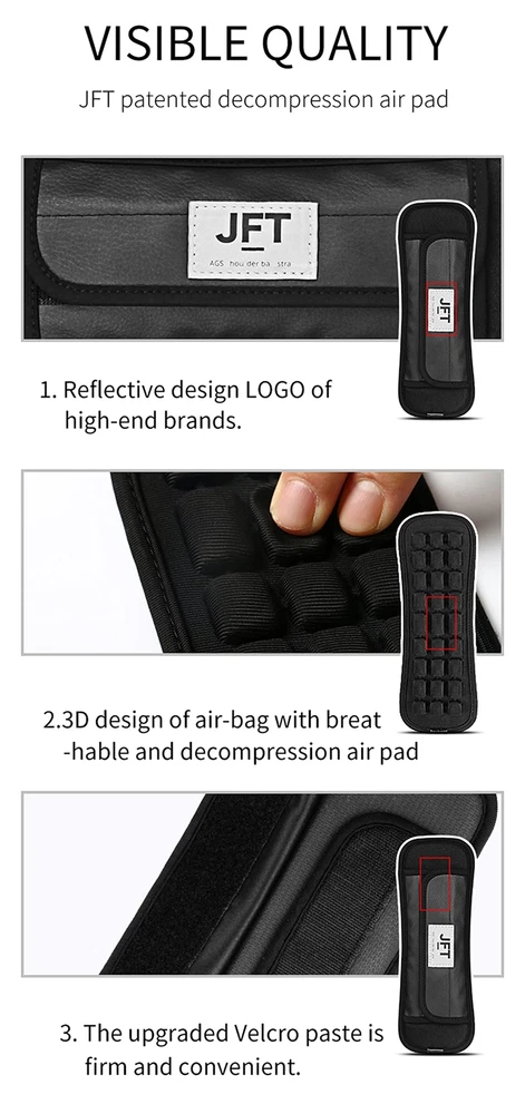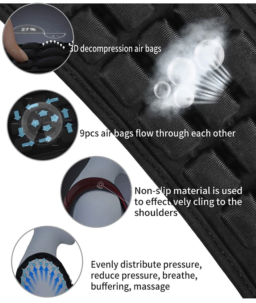Description 🏅When you need carry heavy bag for long times, please try this shoulder pads, which can relieve shoulder pressure and make you feel magically confortable. 🏅Patented and updated decompression design, air in one group airbags convecting, thereby distributing pressure automatically aim to complex stress conditions. Ensuring the largest contact surface and the best way to bearing force, therefore, alleviating shoulder pressure. 🏅 This adjustable pad is easy to attach to straps of different kinds of bags,such as: Computer Bags; Business Briefcase; Laptop Case; Travel Bag; Violin Case; Tool bag; Duffel bags; Rifle cases; Messenger bag; Kids car seat straps; Gym bag; Camera Bags; Roundup Spray Tank; Guitar Case; Golf Bag; Bowling Bag; Swiss Gear Bag; Hockey bag; Triple Trumpet Case; To hold sprayer; To cover worn backpack straps; And other shoulder bags. Modern design - Material: Lycra, TPU, Velcro - Max. Load: 36kg / 79lbs - Wash: Handwash only, don't bleach - Dry: Hang dry, don't tumble dry 🏅Decompression Design: three rows 3D air cushion in that 9 airbags as a group, using convection patented technology to reach anti-gravity effect and decompress more than 30%, very high level of comfort 🏅Non-slip and Easily Use: Anti-slip surface enhance the fastness between bag strap and the pad, velcro tape easily put on and taken off 🏅Soft and Comfortable: Gap between airbags accelerate the hot air flow out, effectively relieve the damp and heat sensation on the shoulders, manage the load to enhance comfort 🏅Widely Suitable: Adapt to any bag strap/belt from 1in to 2.9in (2.5~7.5cm) width, used for camera bag, Laptop bag, guitar belt, backpacks, etc 🏅High Quality and Long-Lasting: Durability 100,000 cycles under 330lbs (150kg), suitable for condition temperature from -20℃ to 65℃ (-4℉ to 149℉)