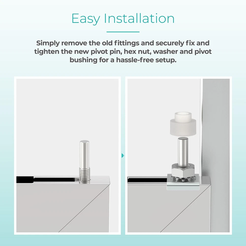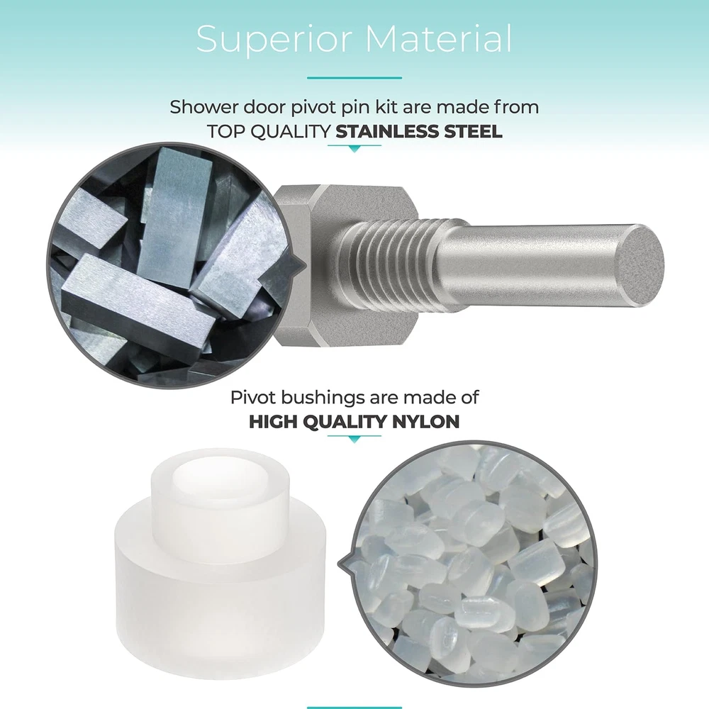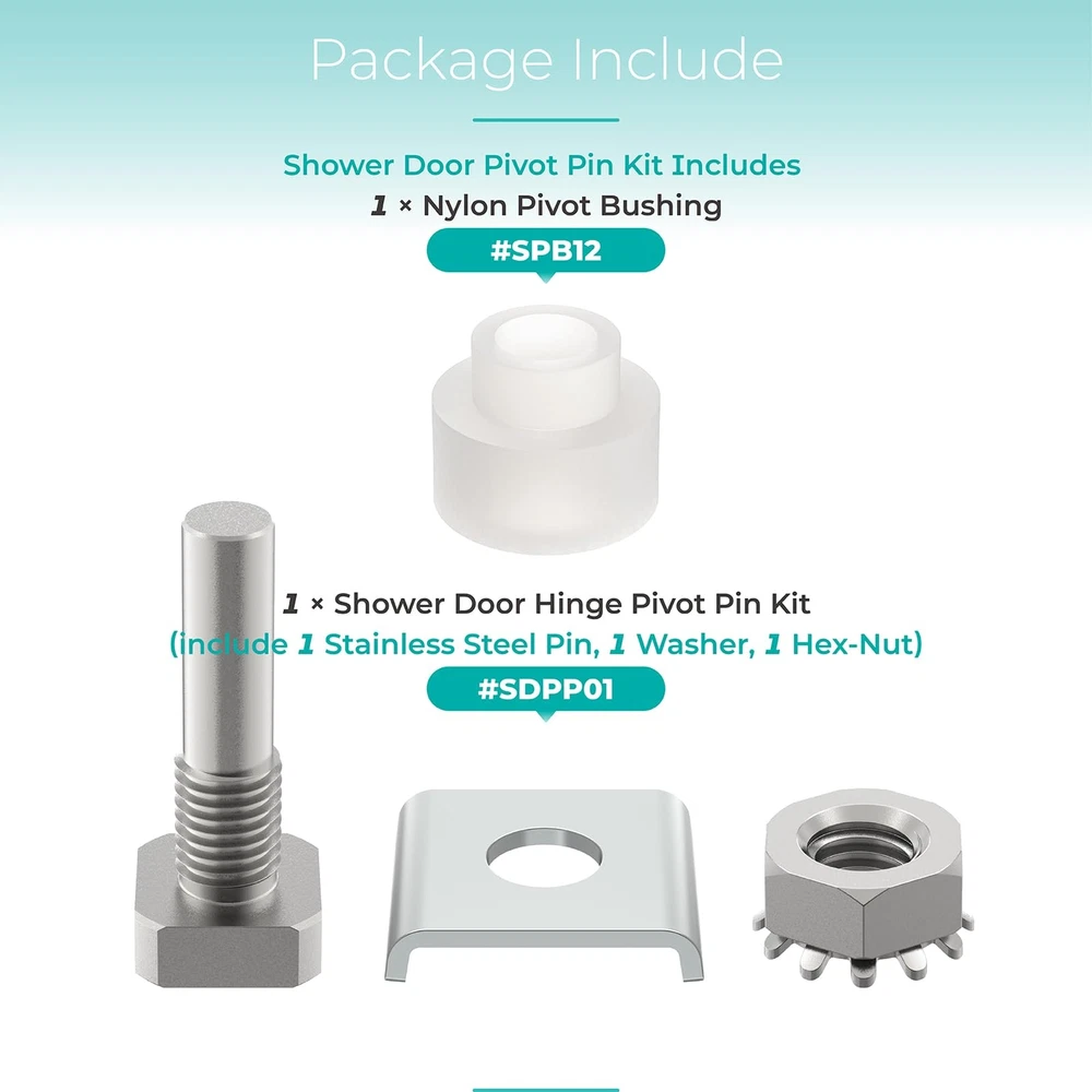Shower Door Repair Kits with Shower Door Pivot Pin Kit #SDPP01 and Pivot Bushing #SPB12, Glass Shower Door Parts for Framed Swing Shower Doors, Shower Door Parts Compatibility Glass shower door pivot hinge parts are designed to serve as versatile replacements for existing pivot pins in swinging pivot shower doors and frame swing shower doors. The shower door pivot pin kit fit for pivot shower doors, framed swing doors, glass swing doors. Package Include The shower door parts include: 1 × shower door hinge pivot pin kit #SDPP01(include 1× stainless steel pin,1× hex-nut,1× washer) 1 × Pivot Bushing #SPB12 Easy Installation The pivot shower door parts are easy to installation. Simply remove the old fittings and securely fix and tighten the new pivot pin, hex nut, washer and pivot bushing for a hassle-free setup. Gloves are recommended for installation to protect your hands. 【Compatibility】The shower door repair kits are designed to serve as versatile replacements for existing pivot pins in swinging pivot shower doors and frame swing shower doors. 【Superior Material】Our shower door pivot pin kit are made from top quality Stainless Steel and pivot bushings are made of high quality nylon, high strength, anti-corrosion and anti-rust, wear-resistant and impact-resistant, sturdy and durable. High precision and hardness ensure long term reliable service. 【Package Include】The shower door parts include shower door pivot pin kit #SDPP01(include stainless steel pin, hex-nut, washer) and #SPB12 pivot bushing. 【Easy Installation】The pivot shower door parts are easy to installation. Simply remove the old fittings and securely fix and tighten the new pivot pin, hex nut, washer and pivot bushing for a hassle-free setup. Gloves are recommended for installation to protect your hands. 【Quality Service】We are committed to providing every customer with quality service, if you encounter any problems when using shower door pivot hinge kits, you can send us an at any time, we promise to reply within 24 hours, and give you a satisfactory answer.