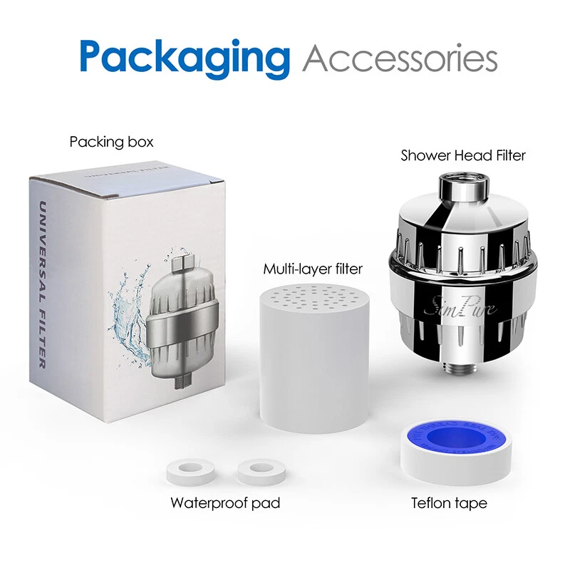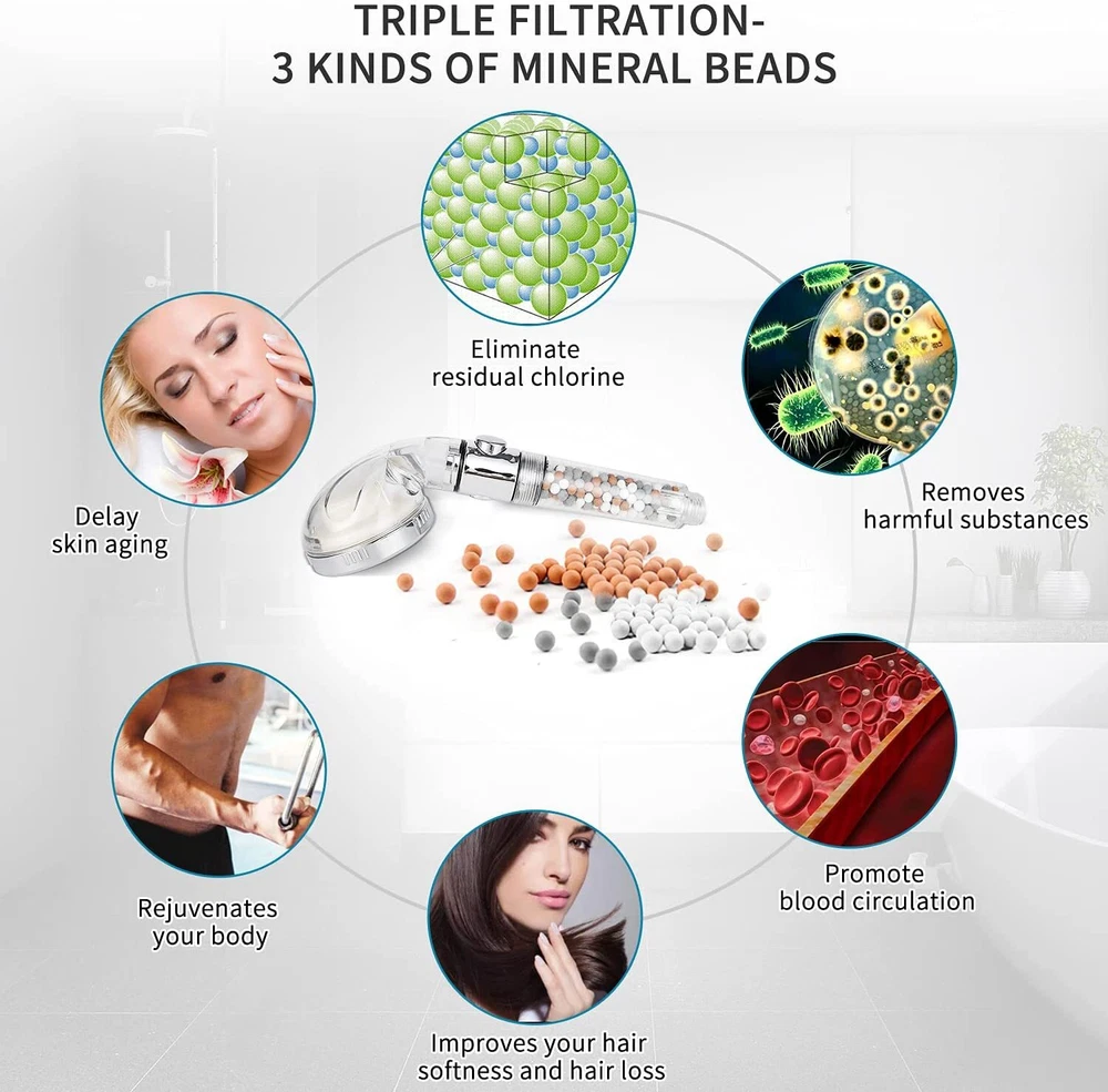 20-Stage Shower Filter with Cartridge, Universal Shower Head Filter for Hard Water Shower Water Filter Removing Chlorine Fluoride Heavy Metal Odor Advanced Features · 20-Stage Filtration : KDF 55, Alkaline Ceramic Balls, Activated carbon, Calcium Sulfite and other filtering materials ensures best effect of water quality purification. 20 Stages filter materials can effectively reduce chlorine, heavy metals, rust, sand and other sediments. · Replacement Cartridge : Capacity of each cartridge is 12,000 gallons of water, which provides clean and odorless water and can be used by a family of four for 2months/1Pack. · Essentials For Body Care : High output shower filter removes unpleasant odors & impurities, relieves fatigue quickly, slows down aging and makes your skin smooth. This shower filter water softener acts as a moisturizer, purifier, softens and provides the best feeling for sensitive skin. · Complete Compatibility : Universal shower filter can be installed in any home, it uses a standard 1/2" thread type. Fit for most rain shower heads, fix shower heads and hand showers. · Easy Installation Without Any Tool : Installation takes only a few minutes and no tools required even if you are not good at hand. We also supply free teflon tape and 2 rubber washers to avoid leakage. Package list: 1 * 20 Stages Shower Filter 1 * Teflon Tape 2* Water-proof Pads 1 * Instructions DB1 Filtered Shower Head with Pausing Switch High Pressure Hand Held Detachable and Removable Filter Showerhead Advanced Features ENJOY A COMFORT AND LUXURY SHOWER AT HOM E-New high pressure ionic filtration shower head,increase the activity of the water,and provide you with soft & good water,which could help you release the itchy feeling of dry skin,reduce the split hair,Get smoother skin,reduce oil secretion,increase cell viability,improved cleaning effect and hair loss prevention. Enjoy Spa experience with high pressure ionic filtration shower head! Unlike other product which have a close to 90° angle,The New Ionic Shower Head has a curved head which allows the spray to flow in a more vertical direction.The injection angle is more reasonable.The head is detachable but no longer separated,reducing the water leakage coefficient. Specifications: 3 modes:Rainfall, Massage and Jet Material:Stainless Steel,eco-friendly PC materials and bioactive mineral stones Dimensions:9.25 in* 3.15 in Weight:450g Package Contents: 1 xDB1 handheld filter shower head ( Hose not Included ) DB2 Filtered Shower Head – Handheld High Pressure Showerhead, Softens Hard Water, Filters Chlorine & Fluoride, Helps Dry & Itchy Skin, Purifies Rust & Dust, Standard Fit, Easy Installation Features PREMIUM QUALITY - Made of High Standard Scratch Resistant Chrome Plated Premium ABS Plastic, which is durable, lightweight, BPA free and heat resistant. The micro nozzle technology makes the outlet holes smaller and denser, increasing the speed of the water flow, thereby increasing 200% water pressure and steady the water flow. Up to 30% water saving than the ordinary showerhead. EXTRAORDINARY SHOWER - Unlike other showers, our filtered shower head removes chlorine, chloramines, significantly reduces fluoride, and softens well water by filtering up to 99.9% of sediments, heavy metals, dissolved solids present in hard water such as lead, rust, and iron TOOL FREE INSTALLATION - G1/2’’ fits any standard size hose and easy to install. Without tools and a handyman, it allows you to install the shower head as easily by yourself. REVITALIZING YOUR BODY - Our shower head attachment increases pH level and effectively helps hair loss, dry scalp, itchy skin, dandruff, and eczema. Shower with filtered water reduces stress, improves mood and sleep quality Package Included 1 x DB2 Filter Shower head(Filter Pre-installed) DB3 Vitamin C Filtered Shower Head & Replacement Filters, Universal Beauty Water Softener Filtered Shower Head - Chlorine, Hard Water, Fluoride Filter for Dry Skin, Hair Loss Vitamin C Shower Head is a powerful shower filtration system for your bathroom, designed to remove up to 99.9% of chlorine, fluorine, chloramines, sulfur, sediments, and heavy metals presented in hard water such as lead, chrome, copper, magnesium, and iron. Our shower filter softens your water, dramatically improves your hair, skin, nails condition as well as helps with hair loss and skin dryness. Showerhead purifier is made of abs plastic wand and 3 parts – scented filter cartridge with tourmaline stone and zeolite mineral stones. Special Features: - 4 Scented Replaceable Filters Set (Vitamin C, Lavender, Jasmine & Rose) - 1 Mineral Balls Set (Tourmaline, Zeolite, Ceramic Balls) - Aroma Filter Cartridge will need to be replaced every month - Mineral Beads Need to be Replaced Every 4 Months SUGGEST:Replace the lime balls every 4 months. DB4 Filtered High Pressure Shower Head, Handheld 3 Mode Function with ON/OFF Switch, Mineral Filter Shower Heads Soften Hard Water About this item 【 Soften hard water 】The filter stone of the eco-shower head is composed of minerals and anionic particles, forming a three-layer filter system, which can reduce the hardness of the water by 50%. It can improve the dry and allergic skin, prevent hair loss and make hair softer. Very suitable for use in hard water areas 【 Water saving and Pressure increase 】The shower head adopts a new type of micro-sprinkler technology to make the water outlet smaller and denser, increasing the water flow speed, thereby increasing the water pressure. Save up to 30% of water at the same time 【 3 Adjustable modes 】This powerful shower head has different adjustment modes (rainfull/Massage/Jettimg), each mode has a different water pressure, allowing you to enjoy the special SPA shower in the bathroom Experience 【 Unique ON/OFF Switch 】The unique switch function of the shower head can help you turn off the water flow when bathing, and will not affect the water temperature when it is turned on again, which
