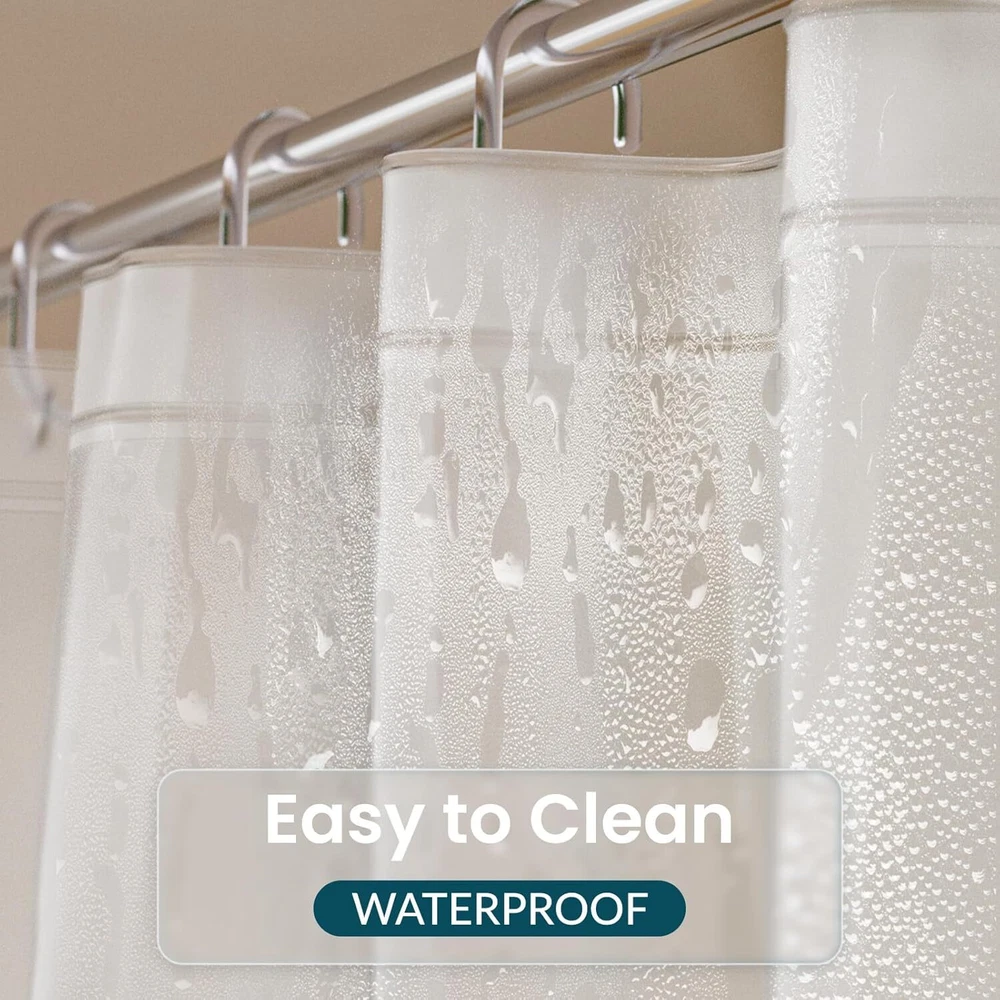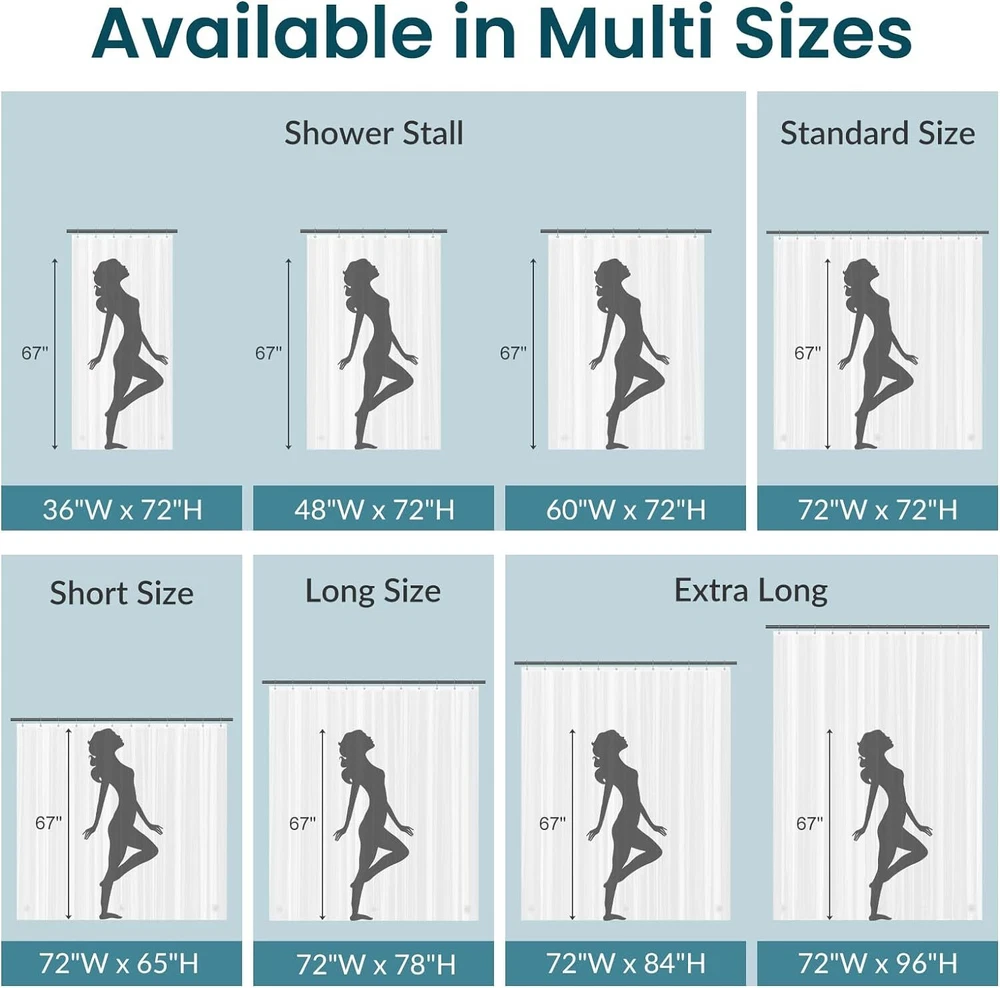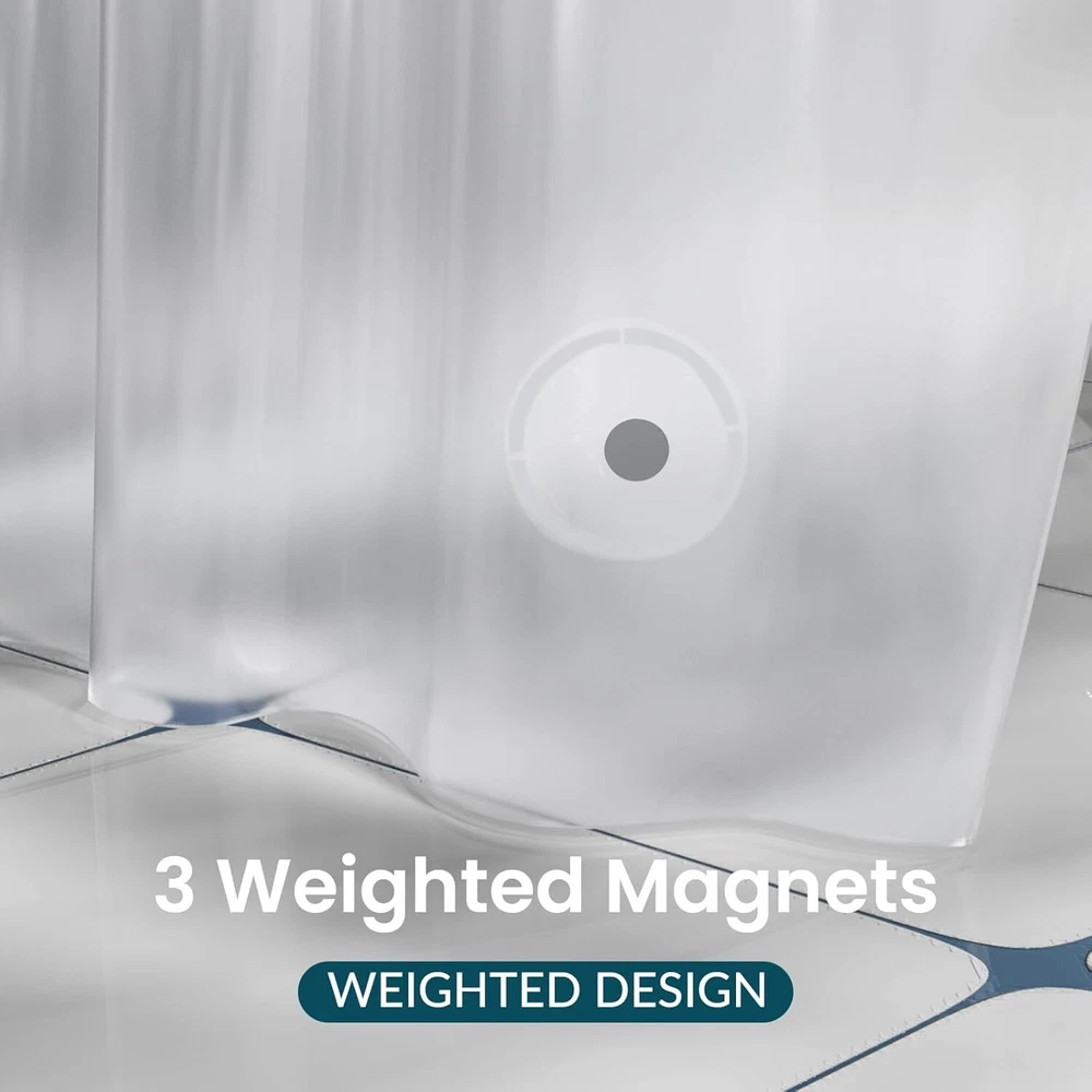 Lightweight and waterproof: The shower curtain liner is lightweight, which is easy to wipe. The smooth shower liner is waterproof and drained quickly, keeping your bathroom dry and clean. Sturdy and rustproof: The shower curtain liner can be hung and taken out easily because of 12 metal grommet holes. The plastic shower curtain liner can keep the liner from tearing. Compatible with many standard size shower rods. Magnets design: With 3 magnets at the bottom, the inside shower curtain liner will prevent water from seeping out into the rest of your bathroom and keep the bathroom curtain liner in place. Eco-friendly material: The shower curtain with liner is made of high quality and eco-friendly PEVA material, which can provide you a comfortable shower experience. Where to use: The shower curtain liner with magnets is great for your bathroom or dorms, hotels, and more. The shower curtain liner can be used alone or paired with a decorative shower curtain. Product Description Other Types of Shower Curtain Liners and Hooks Add to Cart Add to Cart Add to Cart Add to Cart Add to Cart Add to Cart Add to Cart Customer Reviews 4.4 out of 5 stars 14,807 4.4 out of 5 stars 14,807 4.4 out of 5 stars 14,807 4.4 out of 5 stars 14,807 4.4 out of 5 stars 14,807 4.6 out of 5 stars 7,498 4.5 out of 5 stars 16,031 Price $7.49 $ 7 . 49 $6.49 $ 6 . 49 $7.99 $ 7 . 99 $9.99 $ 9 . 99 $9.99 $ 9 . 99 $9.98 $ 9 . 98 $6.99 $ 6 . 99 Color Frosted Clear White Clear Clear Blue Grey Matte Black Size 72 x 72 Inches 72 x 72 Inches 72 x 72 Inches 72 x 72 Inches 72 x 72 Inches 70 x 72 Inches Quantity of 12 Material PEVA PEVA PEVA PEVA PEVA Fabric Metal Grommets Number 12 12 12 / / 12 Button Holes / Feature Lightweight, Waterproof Heavy Duty, Weighted stones Lightweight, Waterproof Weighted stones, Medium Weight Weighted stones, Medium Weight Waterproof Closing hooks