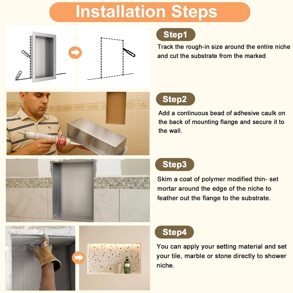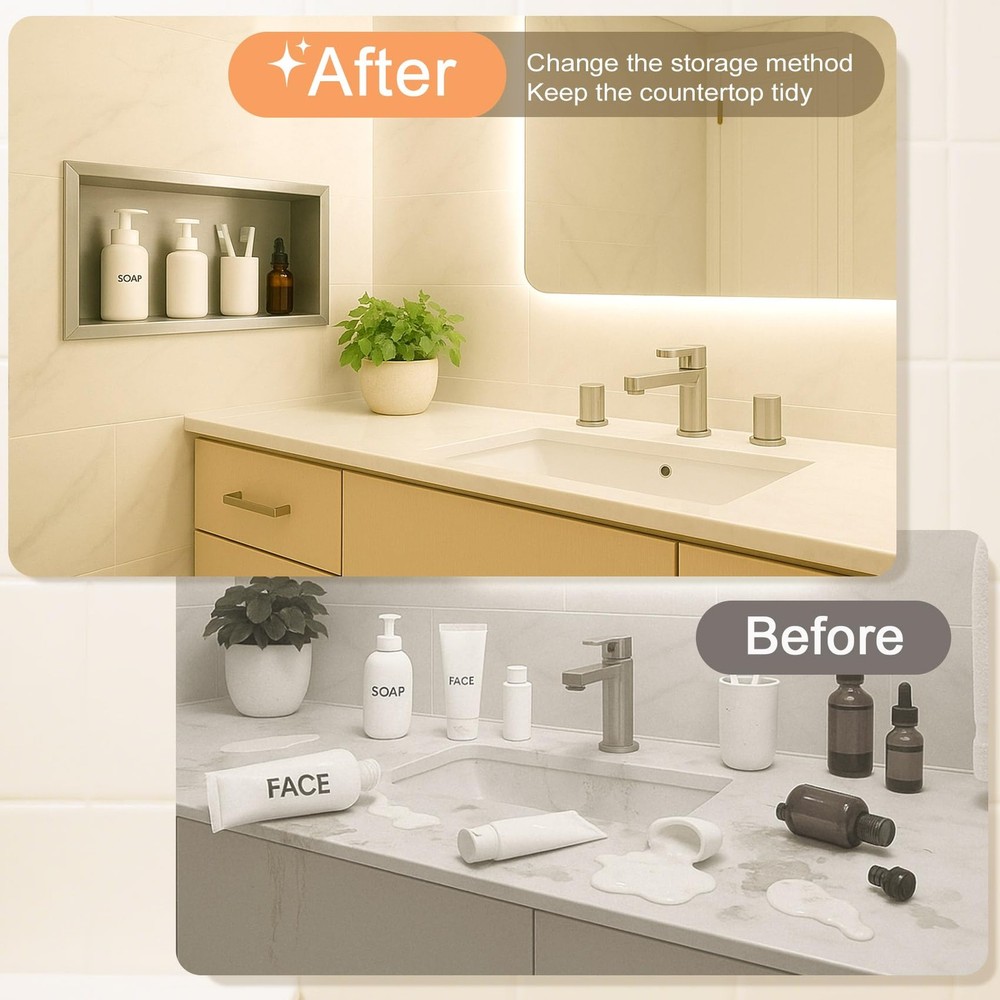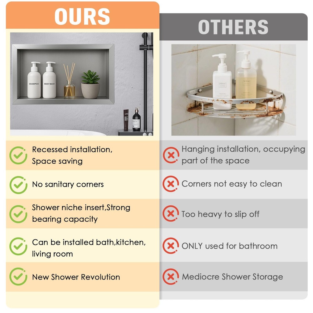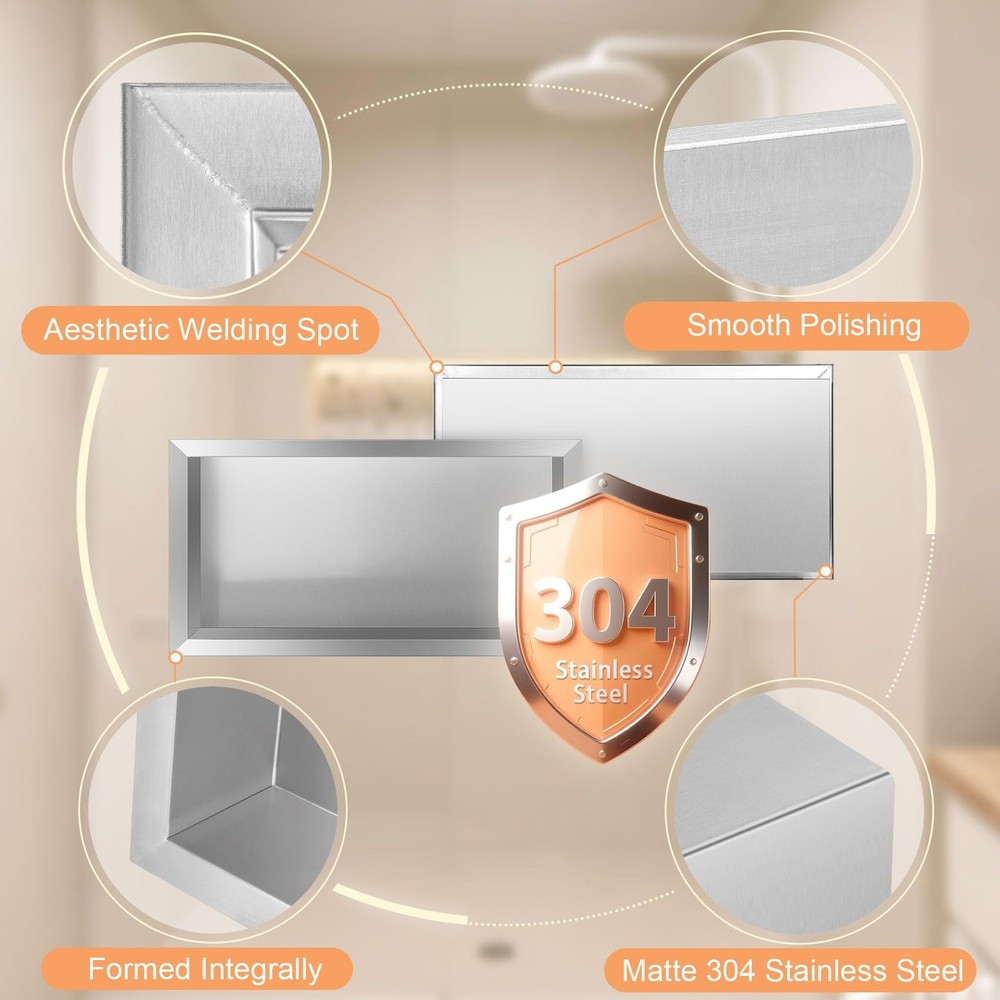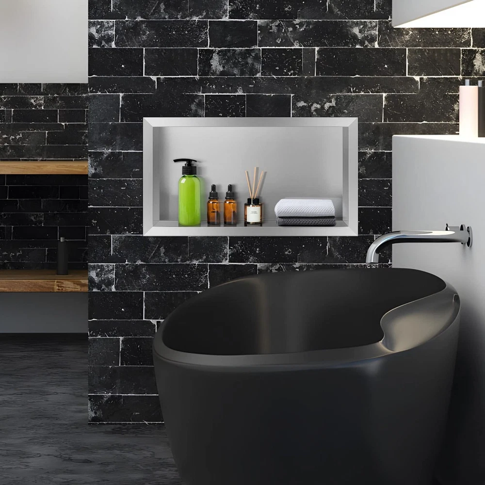 Niches not just for bathroom, also can be used for cupboards, bookshelves, kitchen, etc. It does not take up the building area, more convenient to use. The niche is a clear spot in the interior wall design, substitute for clunky bathroom shelves, as well as, other shelves and fixtures around your home. It can be used to improve the beautifying environment regardless of family or public environment. The niche recessed shelves give you streamlined, clutter-shower walls with no leaks. With muti-models to choose from, you will find a style to fit your space needs in your shower, bathroom and the rest of your home! Niche Size--Overall Dimension: 26.4"x14.3"x 4" | Inside Dimension:14" x 12" x 4",Color:Silver,large capacity to storage taller soap and shampoo bottles,shower shelf insert will save more space and be easier to take out the corner shelf,a whole new bathroom storage. Durable Material--Ready to tile niche is made of high-quality 304 Stainless Steel to withstand heavy-duty use;100% waterproof and leak-proof,surface and splicing of the niche are well brushed, and the edges will not scratch the hands. Elegant Shower Storage-- Shower niche is ideal for storing your personal items in the shower by conveniently storing your personal items in the shower so that the tabletop is no longer littered with bottles and jars and is ideal for placing your bathing supplies. The stainless steel material is stronger and has smooth polished edges, creating more safety for your shower. Easy to Install--The recessed wall niche easy to installation --Pre-fabricated shower niche that is fully sealed, hassle-, quick and simple installation. It can be install vertically or horizontally to suit your needs and design. Wide Usage--12x24 shower niche not just for bathroom, also can be used for cupboards, bookshelves, kitchen, etc. It does not take up the building area, more convenient to use. The niche is a clear spot in the interior wall design,substitute for clunky bathroom shelves,as well as, other shelves and fixtures around your home. It can be used to improve the beautifying environment regardless of family or public environment.