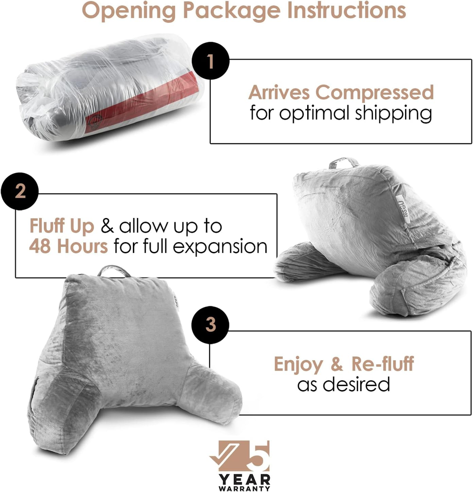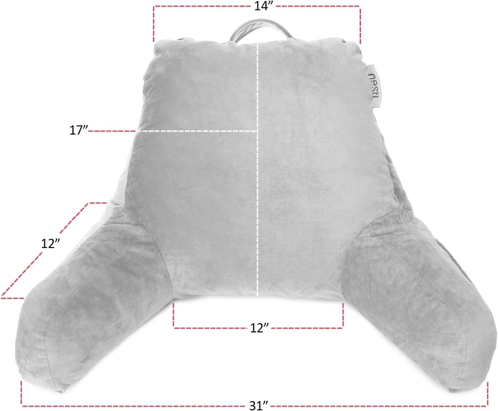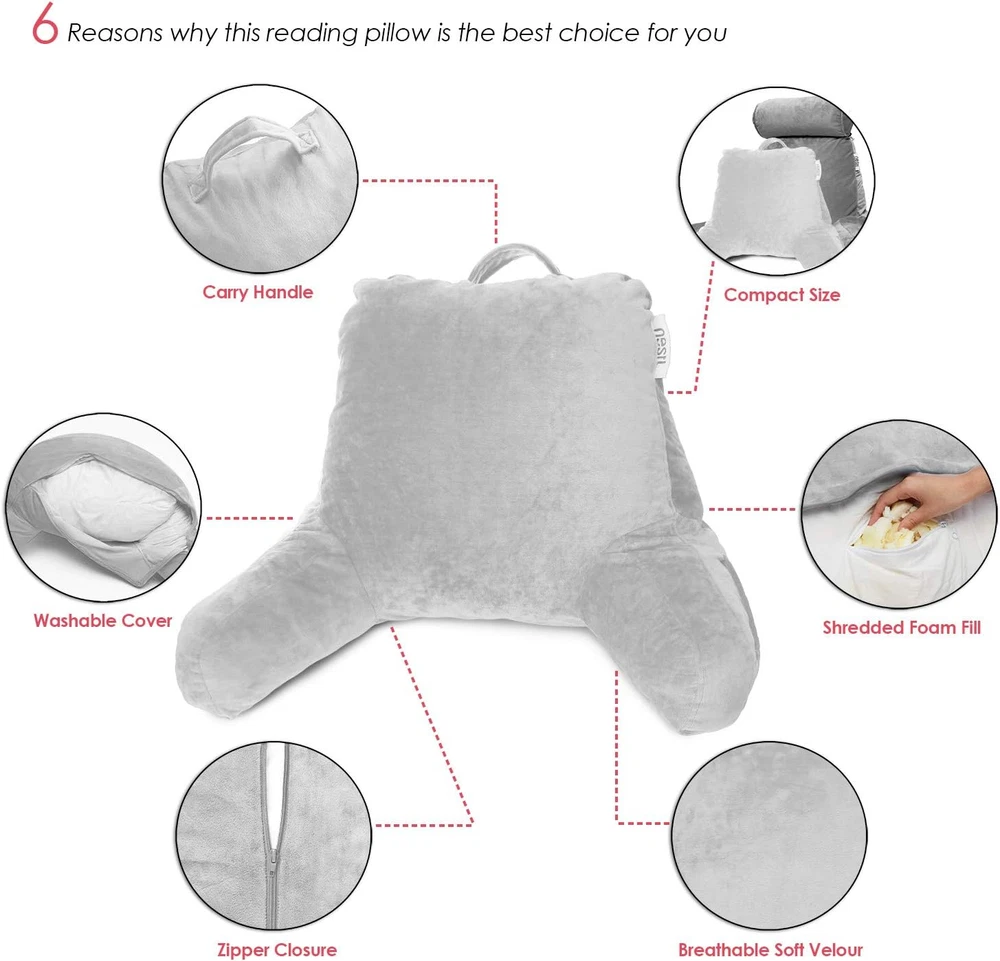 Plush Lounge in Comfort, Supported in Every Way - Whether you're reading, relaxing, or recovering, the Nestl reading pillow wraps you in cozy, customizable comfort. Plush arms, a supportive backrest, and gentle neck support turn your bed, couch, or dorm into your favorite lounging spot. Customizable Support for Back, Neck & Arms - No more slouching or back strain. Our back pillow for bed sitting up features adjustable shredded memory foam that you can shift, add, or remove for personalized firmness. Get the perfect angle whether you're working, recovering, or unwinding. Style That Elevates Your Space - Who says support can’t be stylish? With luxurious finishes, modern colors, and soft, plush fabric, this bed chair pillow adds decorative flair to any bedroom, dorm, or lounge area — blending seamlessly with your space and vibe. Contours to Your Comfort - Premium shredded memory foam molds to your body’s shape-cradling your back, neck, and arms in cloud-like support. Whether you love soft and squishy or firm and upright, this back rest pillow for sitting in bed molds to your exact needs. Everyday Features That Just Make Sense - Designed with your routine in mind: 2 side pockets for your phone or remote, 1 large back pocket for books or tablets, and a carry handle to take your backrest pillow anywhere. Plus, the ultra-soft cover is removable and machine washable for stress-free upkeep. Your Go-To Pillow for Every Activity & Age - From pregnancy and post-surgery recovery to gaming and college dorm life, this arm pillow for siting up in bed is built for it all. Available in Small, Standard, and Large sizes, it’s the perfect gift for readers, students, and comfort seekers of all ages. Safe, Smart & Ready to Fluff – Thoughtfully packed and safety-certified, your bed rest pillow arrives vacuum-sealed — just fluff it up and let expand for 24–48 hours to reach its full size. filled with CertiPUR-US certified shredded foam for cleaner comfort. A smarter, safer alternative to bean bags or solid foam pillows. (A mild foam scent is normal and will dissipate quickly.) Product Description VERSATILITY YOU CAN COUNT ON Whether you're recovering from surgery, expecting a little one, gaming late into the night, or settling into dorm life, this arm pillow is made to support you. It allows you to sit up comfortably and comes in three sizes—making it a thoughtful gift anyone who loves to relax in comfort. ADD COMFORT AND COLOR TO YOUR SPACE Available in over 20 rich and versatile colors, this reading pillow easily complements any room décor—from bold and modern to soft and neutral—so you can find the perfect match for your space. The video showcases the product in use. The video guides you through product setup. The video compares multiple products. The video shows the product being unpacked. Nestl Reading Pillow Merchant Video 1 Features That Matter 2 Lounge In Comfort 3 Cozy Meets Convenient My pillow isn’t expanding — what should I do? our pillow comes vacuum-sealed. To get it nice and fluffy, give it a good shake and fluff—focusing on loosening up the foam, especially around the arms and top. Let it sit for 24–48 hours to fully expand. A foam smell is normal and will fade quickly. Is the pillow adjustable? How do I make it softer or firmer? Absolutely! Everyone lounges differently, so we made our pillow fully customizable. Add or remove shredded memory foam pieces to create the perfect support for your back, neck, and arms. From soft and cozy to firm and upright, it’s all up to you. Will this pillow give me good back support? Nestl’s got your back—literally! It gently molds to your shape to help you sit up comfy and supported. Perfect if you’re dealing with reflux, recovering from surgery, nursing, or just relaxing every day. Can I wash the cover? Is it removable? Of course! The cover is fully removable and machine washable for easy cleaning. Just unzip, remove, and toss it in the washing machine—it’s fresh and clean again. No stress, no mess (wash cold, tumble dry low). What size should I get? What’s the difference between Small, Standard, and Large? Small is perfect for kids and petite teens. Standard fits most teens and adults. Large offers max comfort and includes a headrest + lumbar pillow—great for adults wanting full support. All sizes offer cozy back, neck, and arm support!