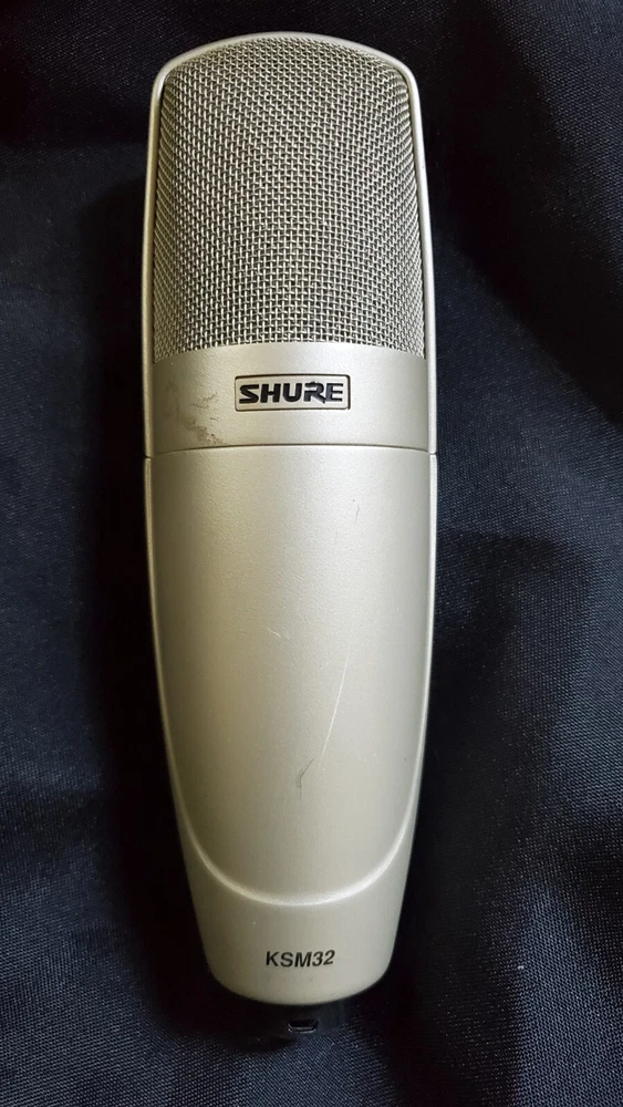 Used Shure Ksm32 champagne large diaphragm condenser microphone with shock mount and wind screen. Original shock mount bands have been replaced. Microphone works great but has a few scratches. Please see photos.
