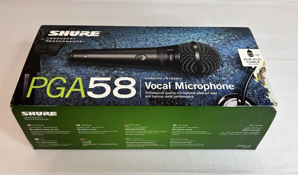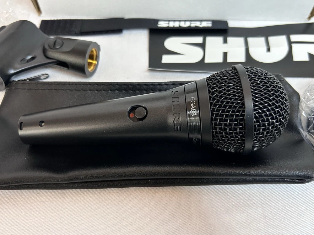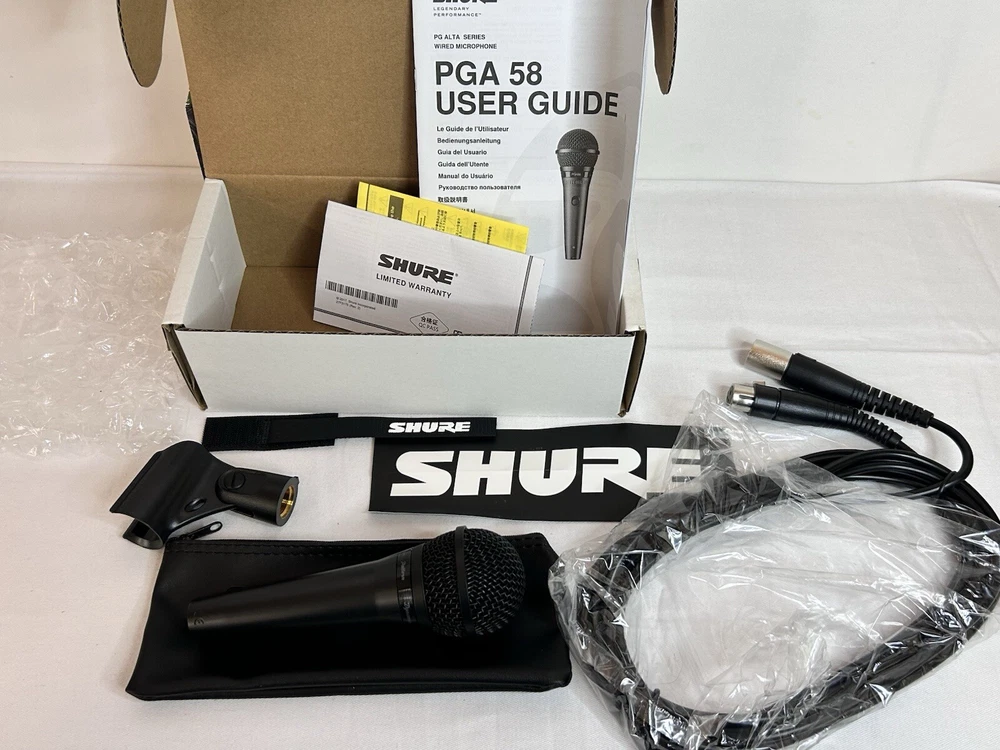 Shure PGA58-XLR Cardioid Dynamic Handheld Vocal Microphone with XLR 15 ft. Mic Cable. Break resistant Mike clip. Zippered bag. Shure sticker. Vocal microphone, professional quality, microphone, ideal for lead and backup vocal performance. Open Box. Box has corner damage as seen in photos. Photos are part of description. We make an effort to supply plenty of photos to assist in your buying decision. Lighting can impact appearance of colors. Seller welcomes communication and questions from potential Buyers. We operate under The Golden Rule....Do Unto Others, so please contact us through eBay if we can answer a question, provide more info, resolve an issue or improve your experience. It is our desire and plan to provide 5 Star service to every customer with fast shipping and accurate descriptions. We appreciate positive feedback. If there is a mistake, please allow us an opportunity to correct it before opening a ticket with eBay or leaving negative feedback. RETURNS: We offer a generous 30 Day return policy for items not as described or non-working unless otherwise described in listing so you can shop with confidence. We package carefully, so if an item is damaged during delivery, buyer will need to file a claim with carrier. Returns must be authorized and returned with all the same packaging and box. Seller paid shipping for authorized domestic returns. Customer to pay return shipping for any authorized returns from international locations, Hawaii, Alaska, Guam, Canada. SHIPPING: Shipping supplies have increased in cost. We try to obtain the lowest cost on supplies to keep shipping as reasonable as possible. There are many factors that affect shipping costs. When possible we try to upgrade shipping to Priority by using their supplies, facilitate faster shipping and insure package, especially for fragile items. We are happy to combine shipping with items purchased & paid the same day. Orders are always shipped out within one business day unless we are on published time away. Many times shipping will occur same day. Note: Due to attempted fraud, purchases made from Buyers with new accounts and/or no feedback may be cancelled and not shipped. We do not communicate outside of the eBay platform. International & Non Domestic Buyers: shipping will be handled through the eBay Global Shipping Program. Import duties, taxes, and charges are not included in the item price or shipping cost. These charges are the buyer's responsibility. Please check with your country's custom's office to determine what these additional costs will be prior to bidding or buying. We do not ship to P.O. Boxes. The Stanley Co will make every effort to make you a happy customer! Thanks for shopping with The Stanley Co! SEE ALL OUR EBAY LISTINGS HERE: TheStanleyCo.com