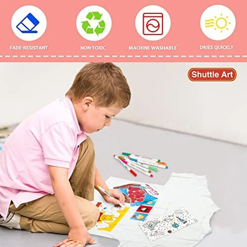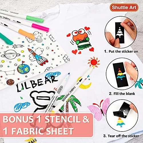36 Colors Fabric Markers, Shuttle Art Fabric Markers Permanent Markers for T-Shirts Clothes Sneakers Jeans with 11 Stencils 1 Fabric Sheet, Permanent Fabric Markers for Kids Adult Painting Writing MULTIPLE-COLORS: Shuttle Art 36 fabric markers set contains 36 bright colors including Red, Yellow, Blue, Green, Orange, Purple, Black, Pink and More! Fine bullet tip provides extremely precise control for underlining, outlining, writing, doodling or any DIY projects on fabric or paper. MULTIPLE-USES: These eye-popping colors have rich vibrant pigments for intense colors on almost all fabric and they can resist fading and water that makes your art project looks great for a long time without worrying about color fading. Perfect for clothing, sneakers,handbags and more! FREE BONUS: Free Stencil and Fabric sheet for coloring are coming with fabric markers set which can bring more fun and inspiration to your creations. SAFE: Shuttle Art fabric markers are Non-toxic, Acid-Free, and conforms to ASTM D-4236&EN71. SERVICE GUARANTEE: Your satisfaction is our top priority, please rest assured to purchase our products. If you are not satisfied with our products or have any questions, please feel free to contact us at any time.