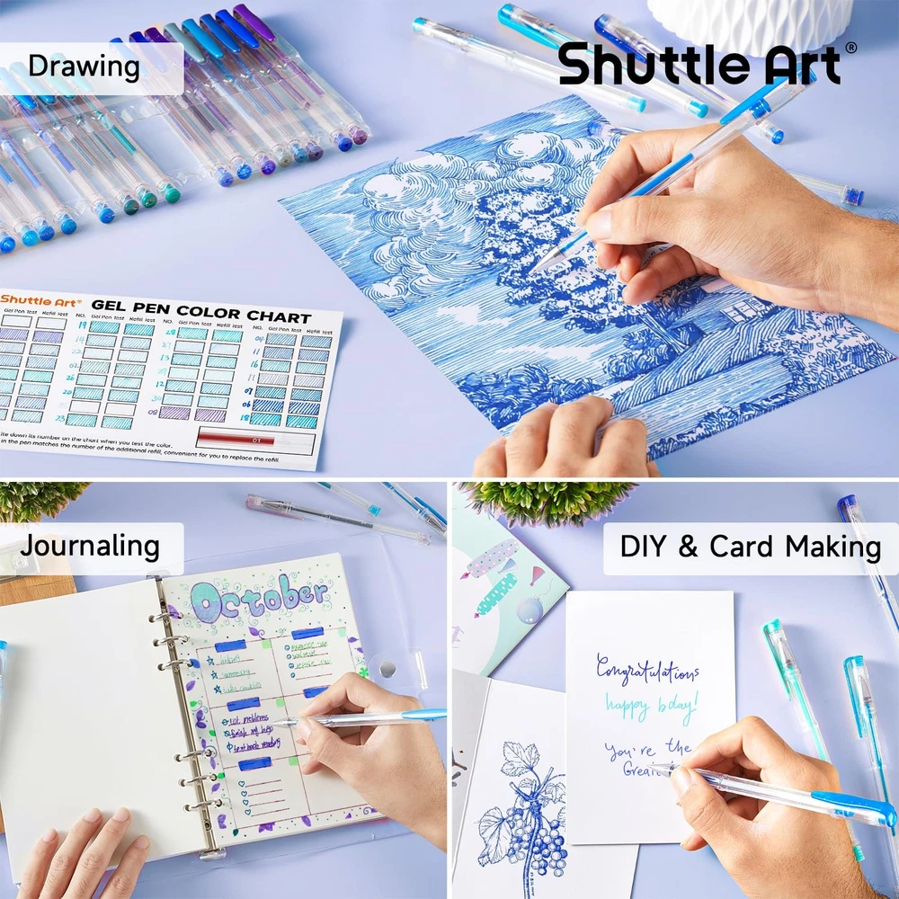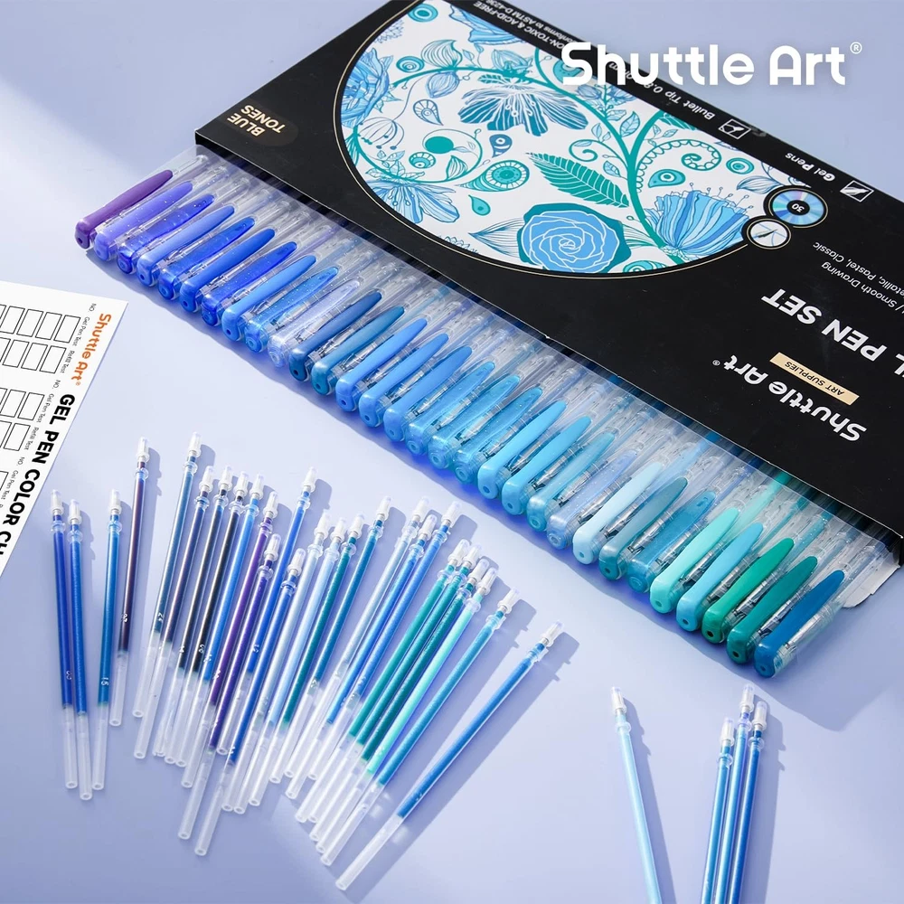 Shuttle Art 60 Pack Blue Tone Gel 1 Count (Pack of 60), 60 Product Features 60 PACK BLUE TONE GEL PENS: Shuttle Art gel pens set has 30 unique blue tone colors with 30 matched refills, including 4 color types: glitter, metallic, pastel, classic. Specific color tone is suitable for nature, landscapes, animals and so on. COLOR CODED: Refills are coded for easy identifying. Each refill in the pen matches the number of the additional refill, convenient for you to replace it. And there will be a bonus blank color chart, which will be more efficient for you to choose what you need. SMOOTH WRITING: Without skipping or bleeding, 0.8mm-1.0mm ballpoint tip can produce smooth and no skipping fine lines for coloring. Just enjoy the wonderful writing experience. VARIETY OF USES: The coloring gel pen set is non-toxic and acid-free. Conforms to ASTM-D4236. Great for bullet journaling, sketching, drawing, writing, coloring books and any other designs on Scrapbooks, School Projects, Party Invites, Greeting Cards, DIY Decor & Letters to Friends & Family. Shipping: Shipping is complimentary within the lower 48 US States. We Do Not Ship to PO/APO Boxes, HI or Alaska We Do Not Ship Outside of the Continental US All items ship within 24-72 hours of Payment For large items that require Freight shipping a valid phone number is required to call and schedule your delivery Terms of Sale and Feedback: Feedback is extremely important to us and eBay If you are satisfied with our transaction, please take a moment to leave Positive Feedback. YOUR Satisfaction is our #1 Priority! If there are any issues, PLEASE contact us BEFORE leaving a neutral or negative rating so that we may resolve any concerns. We PROMISE we can make you happy if you give us a fair chance. Returns / Concerns: All items qualify for returns within 14 - 30 days of receipt. Buyer is responsible for return shipping on any item that is not damaged Please be sure this is an item you want before making your purchase. Customer Satisfaction is our TOP priority! All items are IN STOCK at time of listing. Inventory on eBay changes constantly and it is impossible to maintain a perfectly accurate count of all items. Please do not penalize us if we have to issue you a refund! Thank You For Your Business!