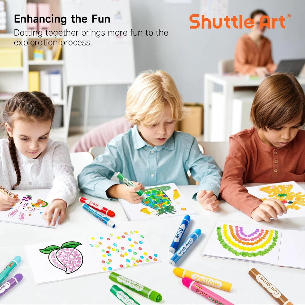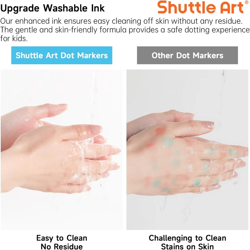 15 AMAZING FUN COLORS: This dot markers set contains 15 basic colors: red, orange red, orange, yellow, emerald green, green sky blue, blue, violet purple, caramel, sepia, light gray and black. The variety of colors is that kids can create and use their imagination to paint NON-TOXIC & ACID-FREE: These dot marker pens are completely safe for kids. We use non-toxic, acid-free ink that is gentle on the skin. The dot markers' materials conform to ASTM-D4236 standards FIT FOR SMALL FINGERS: Featuring 0.42 oz bottles, Shuttle Art dot markers are lightweight and easy for toddlers to grip. Designed to fit small hands, these markers are effortless for kids to hold, mix, and blend colors to create their masterpieces WASH UP EASILY: If your child accidentally gets ink on their hands or clothes, don't worry! Cleaning up is a breeze. Simply rinse with water and gently rub if needed. For stubborn stains, use hand soap or detergent for a thorough clean DOWNLODE UNIQUE PATTERNS: If your kids need some unique patterns for dot coloring, you can contact us to download PDF files for a dot coloring book with more patterns. Then you can print them and use them SERVICE GUARANTEE: Your satisfaction is our top priority, please rest assured to purchase our products. If you are not satisfied with our products or have any questions, please feel free to contact us at any time Product Description 1 MARKERS 2 PEN 3 PENCILS 4 PAINT 5 SCHOOL & OFFICE EASY GRIP & VIBRANT COLORS Easy to Hold Perfect for little hands to comfortably grasp and create. 15 Vibrant Colors Unleash kids' creativity with our dot markers, which are mess-free and feature washable ink. CREATIVE DOTTING & GAMES Innovative Dotting Creating unique and mesmerizing patterns with every dot. Game Play Ideal for engaging bingo games and endless fun. Dot markers Comparison Add to Cart Add to Cart Add to Cart Add to Cart Add to Cart Customer Reviews 4.2 out of 5 stars 1,150 4.1 out of 5 stars 66 4.5 out of 5 stars 2,359 4.5 out of 5 stars 2,359 4.5 out of 5 stars 2,081 Price $11.99 $ 11 . 99 $14.99 $ 14 . 99 $21.99 $ 21 . 99 $17.99 $ 17 . 99 $21.99 $ 21 . 99 Accessories 135 Unique Patterns PDF None 20 Patterns Activity Book 20 Patterns Activity Book 20 Patterns Activity Book Washable ✔ ✔ ✔ ✔ ✔ Non-toxic & Acid-free ✔ ✔ ✔ ✔ ✔ Volume 0.42 oz/12 ml 0.42 oz/12 ml 0.42 oz/12 ml 1.33oz/40 ml 1.33oz/40 ml Colors 15 Colors 15 Glitter Colors 30 Colors 12 Colors 14 Colors