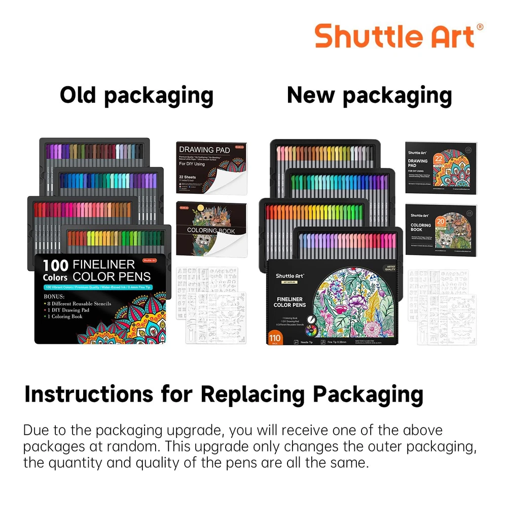 Shuttle Art Fineliner Colored Pens, 100 Colors 0.4mm Fine Point Pens with 8 Stencils & 2 Adult Coloring Books for Coloring, Drawing, Detailing, Writing Note Taking Calendar and Journal Art Projects THE GREAT FINELINER SET AVAILABLE: Shuttle Art Fineliner pack contains 100 unique, brilliant and gorgeous colors with 8 stencils and 2 adult coloring books making it the great set available on Amazon. Fineliner Pen have a 0.4mm extra fine fiber tip and great for sketching, card making, scrap booking, journaling and coloring. COMFORTABLE TO USE: Durable metal-clad tip and ergonomically round shaped barrel makes for a more comfortable grip. Artist quality ink is water-based, fast drying, odorless and blendable without bleeding. It’s safe as well, non-toxic. AMAZING CONVENIENT BOX PACKAGE: Fineliner Pens are organized in 4 individual black trays and stored in an exquisite cardboard box making them convenient to use and portable. Our Fineliner Pen Set is perfect for gift giving. BONUS COLORING BOOKS AND STENCILS: Includes a adult coloring book with stress relieving designs animals, flowers, paisley patterns and so much more. A DIY coloring book to locate colors for your project and free your art creation. 8 Different Stencils help to transform your boring pages into beautiful surprise SERVICE GUARANTEE: Your satisfaction is our top priority, please rest assured to purchase our products. If you are not satisfied with our products or have any questions, please feel free to contact us at any time.