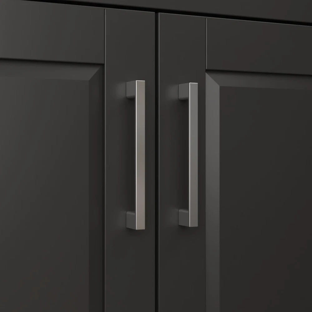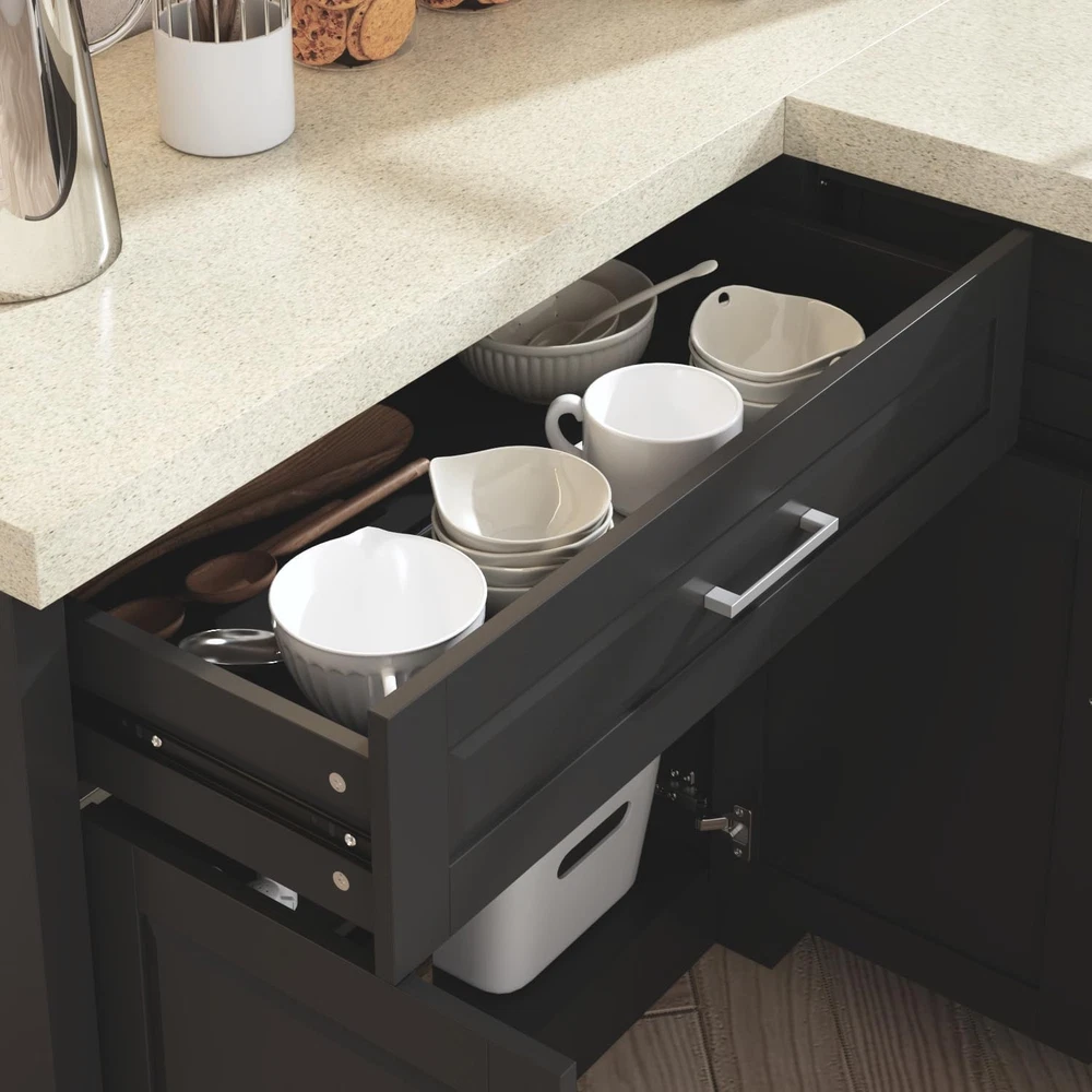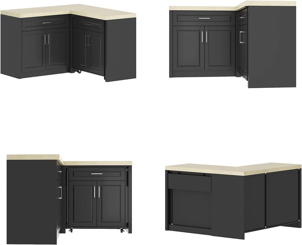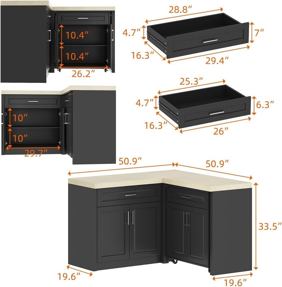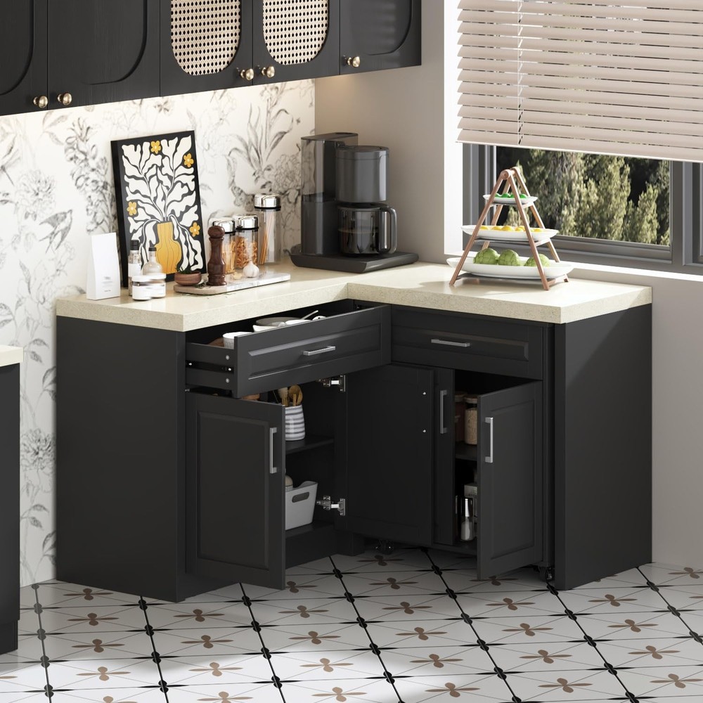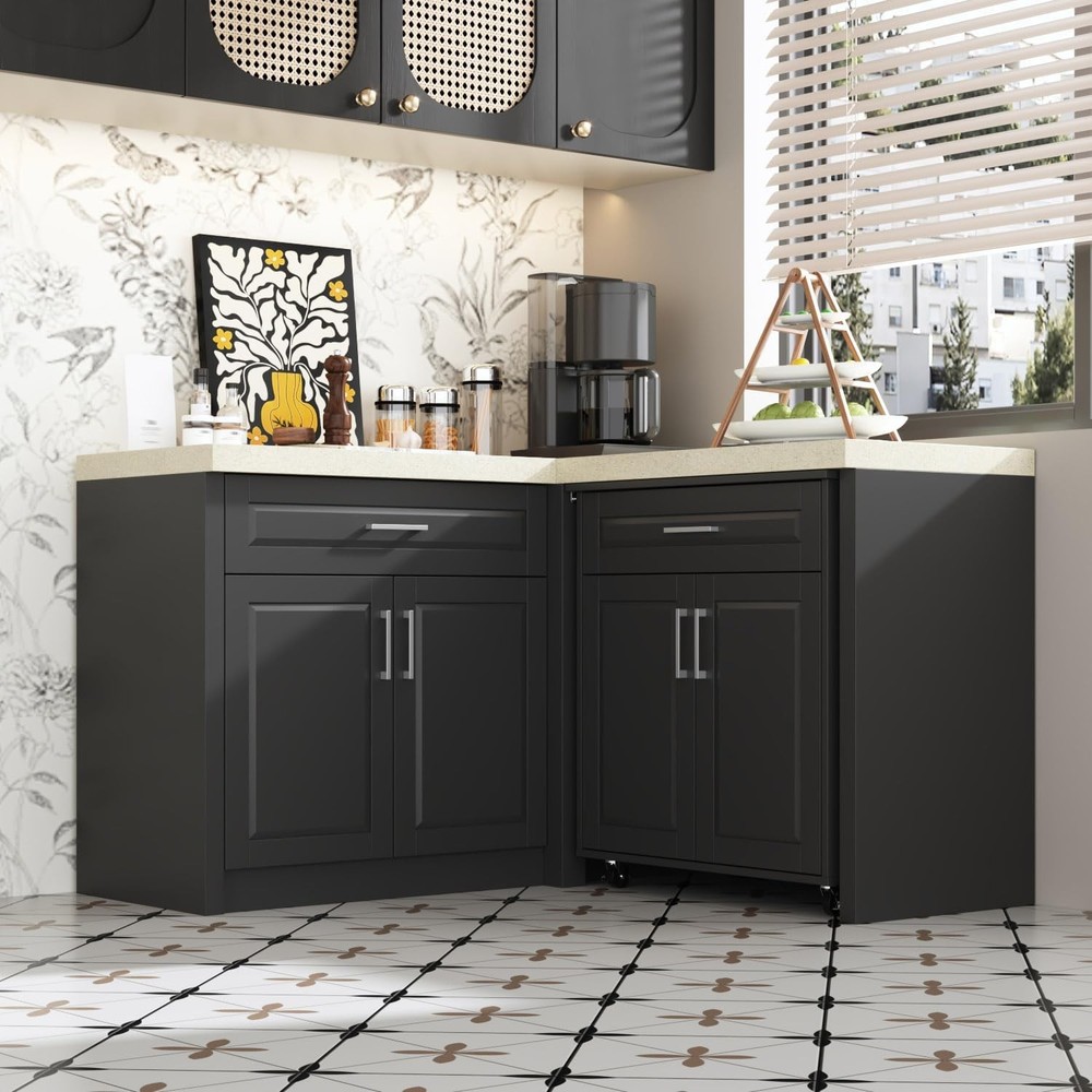 Product Description About this item Corner Sideboard: This corner kitchen cabinet adopts a modern exterior design. The main body of the cabinet is a steady black, while the countertop features an off-white stone-like pattern, creating a more layered visual effect. With silver handles, it exudes a simple and delicate charm Diverse Purposes: This cupboard can be placed in the kitchen. The cabinet can hold commonly-used kitchen utensils and tableware, and the countertop can be used for preparing food. The cabinet on the right has wheels at the bottom and can be used as a trolley in the living room and outdoors Sturdy Structure: This food pantry is made of P2 grade MDF, ensuring overall sturdiness and stability. The cabinet doors are equipped with metal hinges and metal handles for extra durability, and the drawers are equipped with metal slides for smooth opening and closing Ample Storage Spaces: This storage cabinet provides ample storage. It is composed of 2 drawers and 2 cabinets, with 2-tier shelves inside the cabinets. The spacious tabletop can hold various items, catering to your diverse storage requirements Simple to Assemble: Each component of this pantry is clearly labeled with its corresponding number. Therefore, you can follow the instructions in the manual step by step to assemble a practical and exquisite kitchen cabinet Sideboard Practical,Multi-functional,Sturdy Black dining cabinet with a clever corner design, combining practical storage and style, a beauty in the kitchen! Specifications: Material: MDF Color: Black + Beige Overall Dimensions: 50.9"D x 50.9"W x 33.5"H Large Cabinet Storage Drawers Metal Handles Wheels Sideboard Color Black + Beige Overall Dimensions 50.9"D x 50.9"W x 33.5"H Material MDF Package Includes 1 x Pantry ; 1 x Instruction On Aug 15, 2025 at 01:13:41 PDT, seller added the following information: