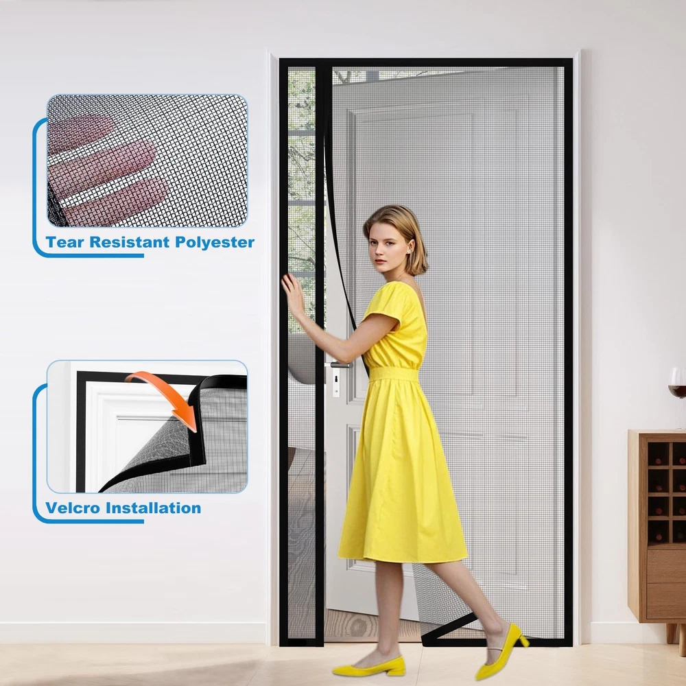 Reversible Left Right Side Opening Magnetic Screen Door Free Left&Right Opening Design:One reversible screen door mesh could open left and right at will, never worry about buying the wrong opening that doesn't fit the direction of your door opening. Multi-function Design:Let fresh air in while avoiding the entry of annoying creatures. Free your hands when going in and out. Pet-friendly, pets can easily enter and go outside the house. After passing,the magnet screen door curtain will close automatically. Magnetic Screen Door:Widely used for various door: front, patio, back, rear, interior, exterior, entry, deck, porch, balcony, glass, garage, sliding doors.BEFORE PURCHASING, please carefully measure your door size and order that size (ONLY door size,doesn't include door frame part). Hands Free Entry: Heavy duty magnets are sewn right into the seam to ensure a quick, automatic silent close every time. Even children and pets can easily walk through and open without using hands Left or Right Side Opening: Feature dual-sided hook & loop design, adjusting the side-opening direction based on your door handle position. your view is unobstructed and convenient for you and your family easy access Tear-Resistant Mesh: Made of heavy-duty polyester mesh, this material is tough enough to resist scratches, tears, and daily wear while staying breathable. It holds its shape in hot conditions and stands up to both curious pets' claws and harsh outdoor weather Magnetic Screen Door Size: Fits Doors 36" x 80" (Actual Mesh Size 38" x 81"), If your measured door size is equal to or slightly smaller than 36" x 80" (excluding door frame), the size is suitable. Please measure your door size before purchase to ensure fit Easy Installation: Simply use hook&loop to attach the magnetic screen to the door frame ,extra push pins are included for added security and strength; Easily remove the screen mesh and fold it for storage when not in use Wide Application: The door screen can keep the annoying creatures out and let you enjoy the fresh air and sunshine blowing in from outside; Suitable for patio door, front back door, balcony door, backyard door, sliding door, etc Quality Assurance: With a wide field of vision no longer has black lines from openings in the centre blocking your eyes, good light transmission and more durable performance. if you have any questions, Please feel free to contact us