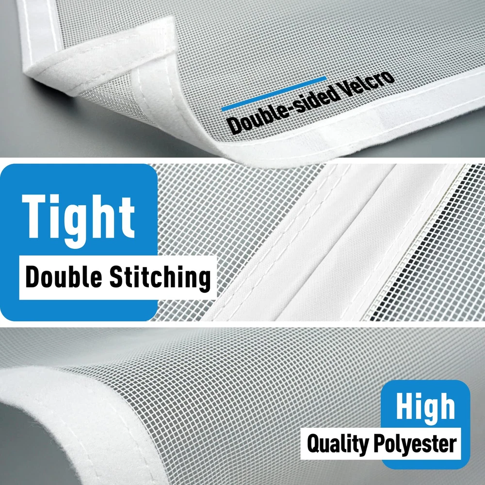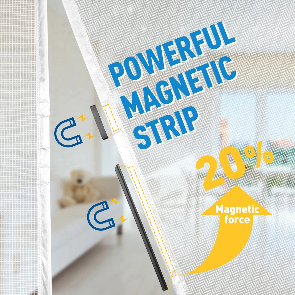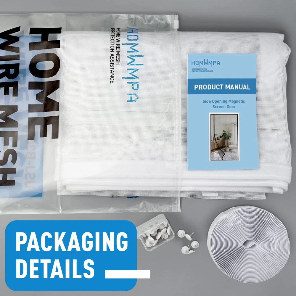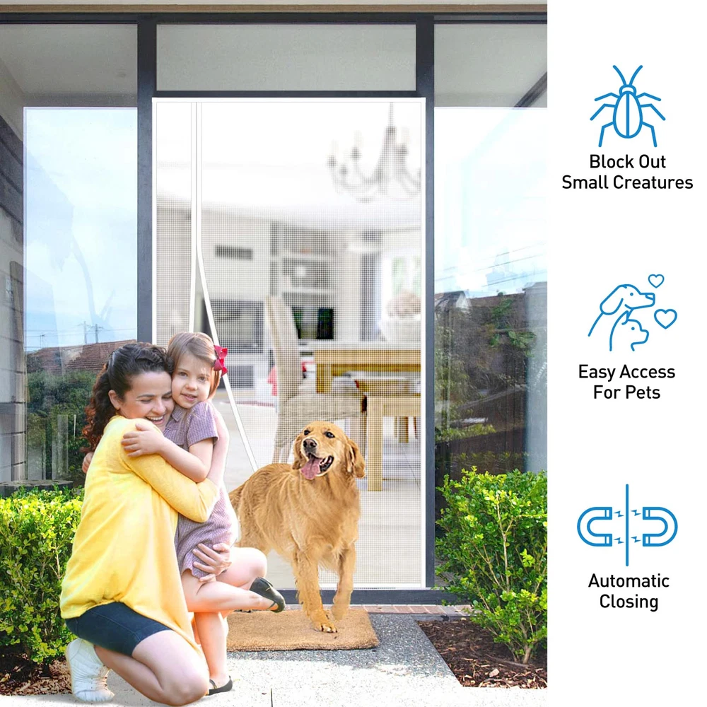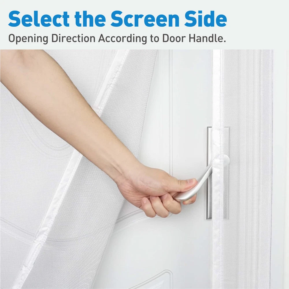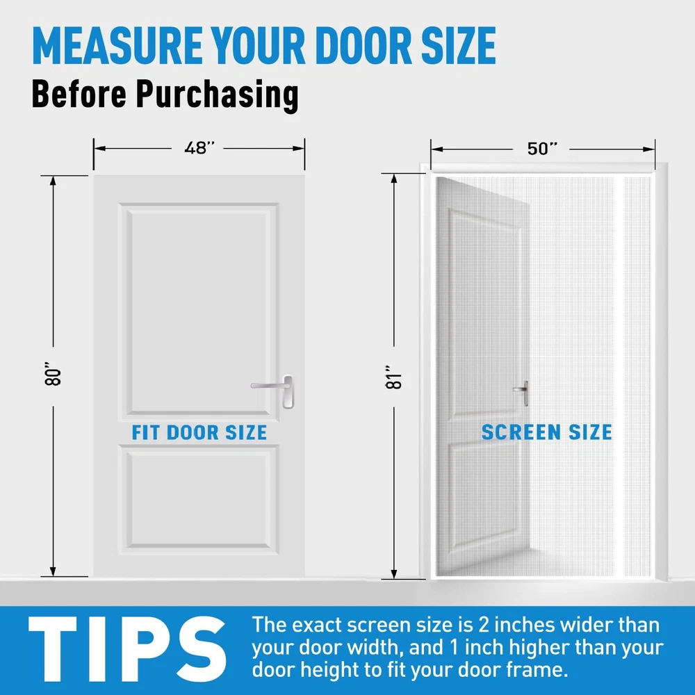 Left & Right Side Opening: The reversible design brings the opening closer to the doorknob and makes it easier to open the door, so you are free to choose either the left or right opening depending on the position of the doorknob Magnetic Screen Door Size: Screen door measures 50" x 81", Fits Door Sizes 48" x 80", If your measured door size is equal to or slightly smaller than 48" x 80" (excluding door frame), the size is suitable. Please measure your door size before purchase to ensure fit Screen Door Mesh Material: Made of soft plush edges, double stitched, with thicker threads used throughout the stitching process to ensure durability; The mesh screen is high tensile strength, abrasion resistance, sturdy and has a longer service life Open Easily & Close Automatically: Heavy duty magnets are sewn right into the seam to ensure a quick, automatic silent close every time. it is also lightweight, so even children and pets can easily walk through and open without using hands Easy Installation: Simply use hook&loop to attach the magnetic screen to the door frame ,extra push pins are included for added security and strength; Easily remove the screen mesh and fold it for storage when not in use Wide Application: The door screen can keep the annoying creatures out and let you enjoy the fresh air and sunshine blowing in from outside; Suitable for patio door, front back door, balcony door, backyard door, sliding door, etc Quality Assurance: With a wide field of vision no longer has black lines from openings in the centre blocking your eyes, good light transmission and more durable performance. if you have any questions, Please feel free to contact us