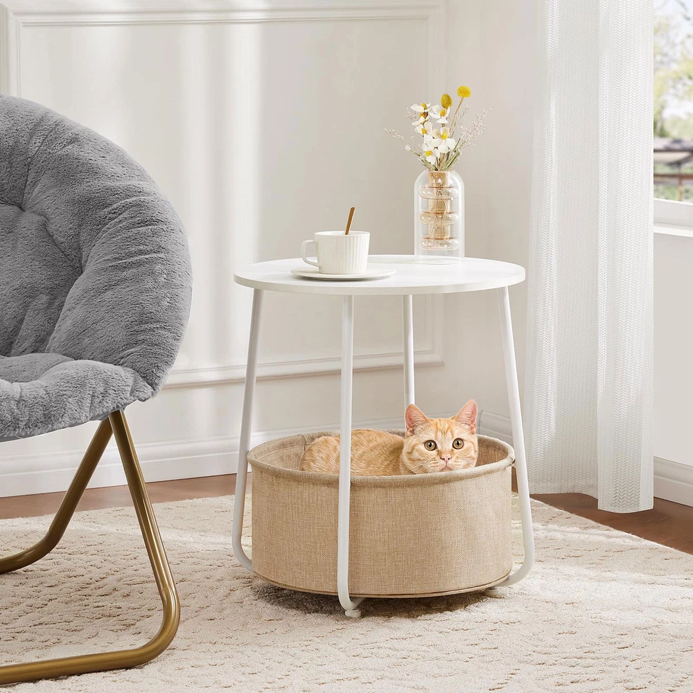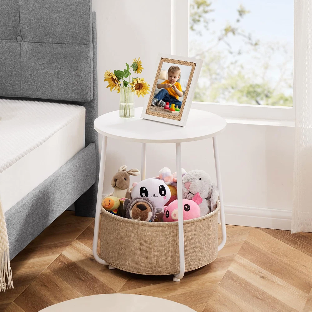 End Table boasts a classic and functional design that exudes sophistication. The durable linen basket not only enhances its aesthetic appeal but also provides ample storage space for various items, from toys and blankets to magazines and more. Versatile and Space-saving: Round small table is the perfect solution for small spaces, serving as a versatile bedside table, accent table, or mini table. Its compact design, measuring 19.3''x19.9'', allows it to fit seamlessly into various spaces, making it an ideal addition to your living room, bedroom, nursery, and more. Classic and Functional Design: With its simple yet beautiful design, this living room tables adds a touch of elegance to any room. The table features a durable linen basket that not only enhances its sophistication but also provides convenient storage space for toys, blankets, magazines, game consoles, and even as a cozy bed for your pet. Sturdy and Reliable: Crafted from sturdy particleboard and supported by an integrated U-shaped base, our end table offers unrivaled stability and durability. The adjustable support feet at the bottom ensure stability while protecting your floors from scratches. Rest assured, this table is built to withstand everyday use. Seamless Integration: round end table is designed to seamlessly integrate with your existing furniture. The versatile design allows you to mix and match it effortlessly, creating a cohesive and stylish look in your home. Whether you need a functional bed side tables, a chic accent piece, or a practical storage solution, our round end tables is the perfect choice. Easy Installation: We value your satisfaction and strive to provide excellent . Our nightstand comes with a detailed installation manual and all necessary tools for easy assembly.