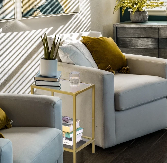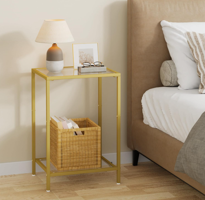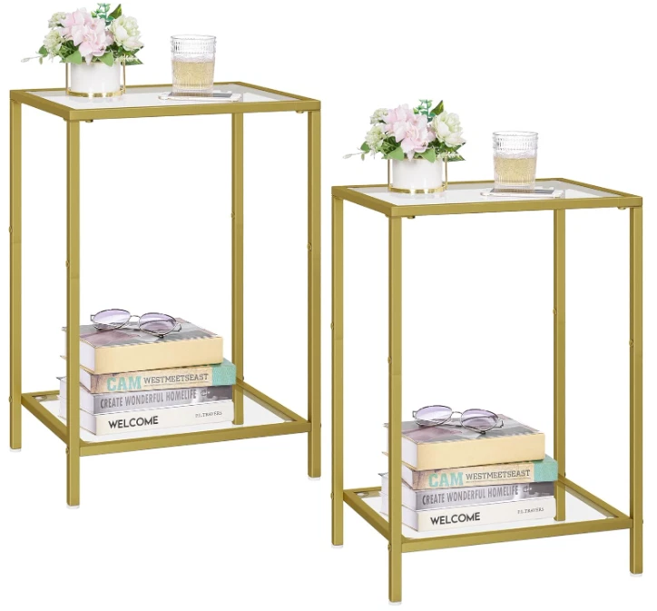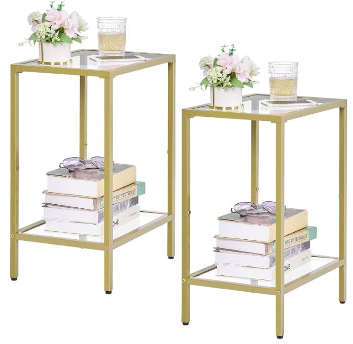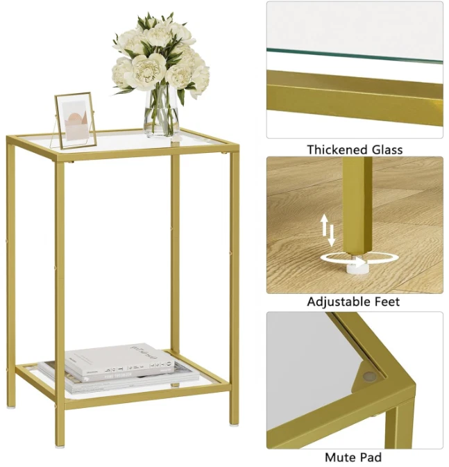 Side Tables Set of 2, End Tables with Tempered Glass, 2-Tier Nightstands, Golden Modern Design: Modern style minimalist design, made of gold colored metal and clear tempered glass, suitable for your home. Two-layer storage can hold more items; small size makes it easy to move around without taking up too much space Practical and Multi-functional: Product dimensions 11.8"D x 15"W x 21.7"H, it is suitable for placing beside sofas and leisure chairs with magazines, coffee, small table lamps, etc. You can also put it in the bedroom as a nightstand with books and a small lamp on it. Easy to Assemble: With detailed instructions, numbered parts, simple structural design, you can easily assemble it in 20 minutes Also great for gardens, it can be placed on the sides of camping chairs and outdoor sofas Safety Design: Polished edge treatment will ensure your safety. The narrow end table has four plastic adjustable feet, which can keep balance even on uneven floor and protect the floor from scraping Strong and long-lasting: The small side table is made of tempered glass and strong metal frame, which is sturdy and easy to clean. A single shelf can bear up to 20 lbs and you can use it both indoors and outdoors Terms of Sale and Feedback: Feedback is very important to us and eBay. If you are satisfied with our transaction, please take a moment to leave positive feedback. YOUR satisfaction is our number one priority! If there are any problems, PLEASE contact us BEFORE leaving a neutral or negative rating so we can resolve any concerns. We PROMISE that we can make you happy if you give us a fair chance.