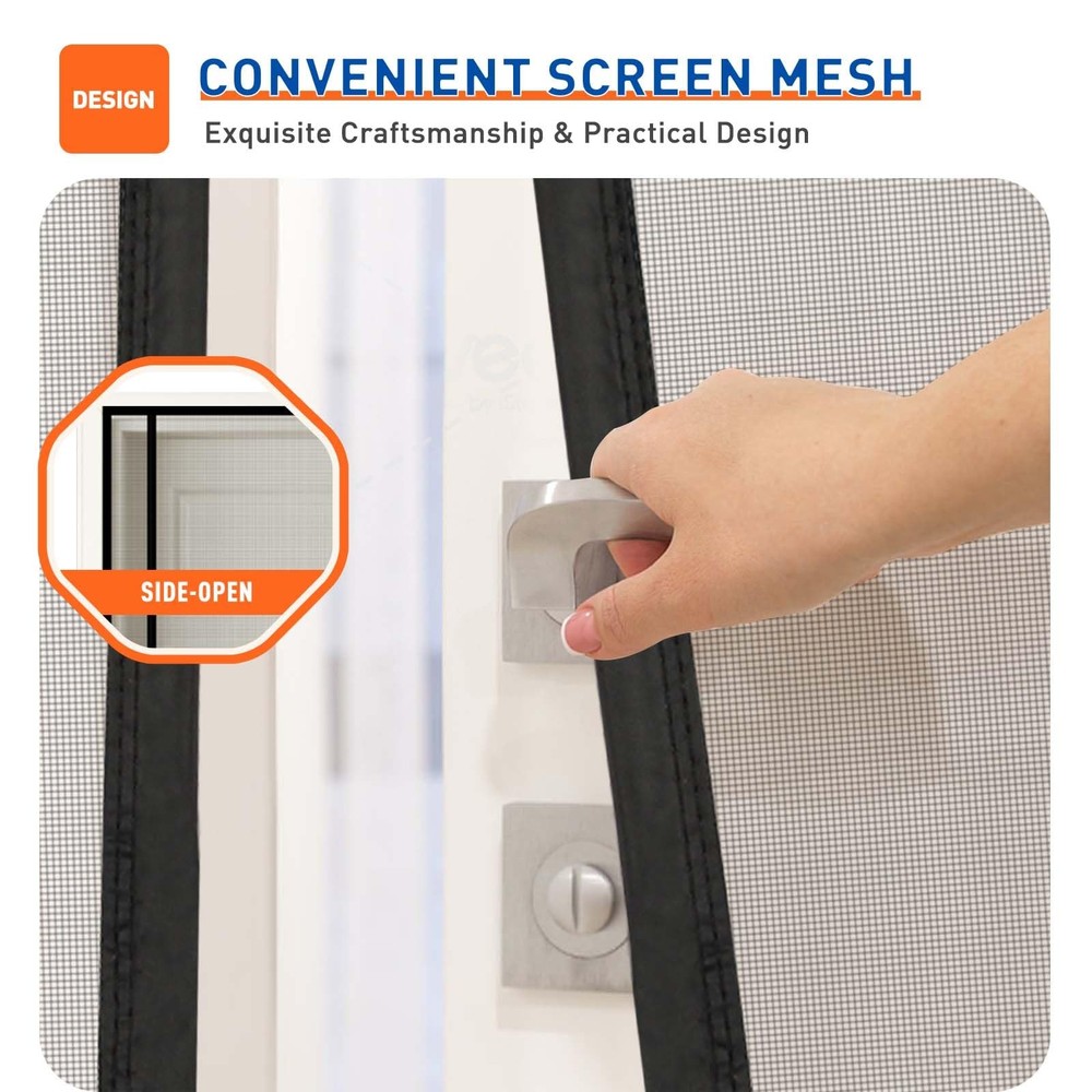 SUITABLE SIZE - Actual Screen door size: 38 x 81 inch, Fit door size: 36 x 80 inch. Before purchasing, please carefully measure your door size (not include door frame part) and order that size; REVERSIBLE OPENING DESIGN - The magnet screen door with full-frame loop strips on both sides, so you can turn the screen over to adjust the opening side you need. Enjoy a convenient and comfortable life! SUITABLE SIZE: Actual magnetic door screen size: 38 x 81 inch, fit door size: 36 x 80 inch. Before purchasing, please carefully measure your door size (not include door frame part) and order that size REINFORCED MAGNET & HANDS-FREE: The door screen magnetic closure with 99% enhanced performance are sewn right into the seams to offer you an enjoyable experience with hands-free opening and quietly automatic closing LEFT/RIGHT SIDE-OPEN DESIGN: The open side of the screen door mesh can be switched reversibly by the positon of door handle due to the door net screen can be attached with hook & loop tape on both sides. You can easily get a full view STURDY FIBERGLASS MATERIAL: The mesh screen door is made of fiberglass material which is superior than other mesh. It also has excellent performance in durability, windproof, and has a high tensile strength VENTILATED SCREEN DOOR SOLUTION: With this magnetic screen door mesh, you can bring fresh air in to your home everyday, and still keep the unwanted creatures out KIDS & PETS FRIENDLY: The mesh screen doors with magnets pet friendly are lightweight enough for kids and pets to walk through. You can enjoy peace of mind, as there's no need to constantly monitor the open - close state of the screen EASY TO INSTALL: The door mesh screen can be installed easily without tools. First, clean the door frame simply. Second, attach the door screen and included hook & loop strip to the frame. Last, pins are used to fix PACKING LIST & AFTER-SALES SERVICE: The patio screen door comes with full-frame hook & loop tape, a pack of drawing pins and an instruction manual. If you have any questions about the product or the installation process, please feel free to contact us