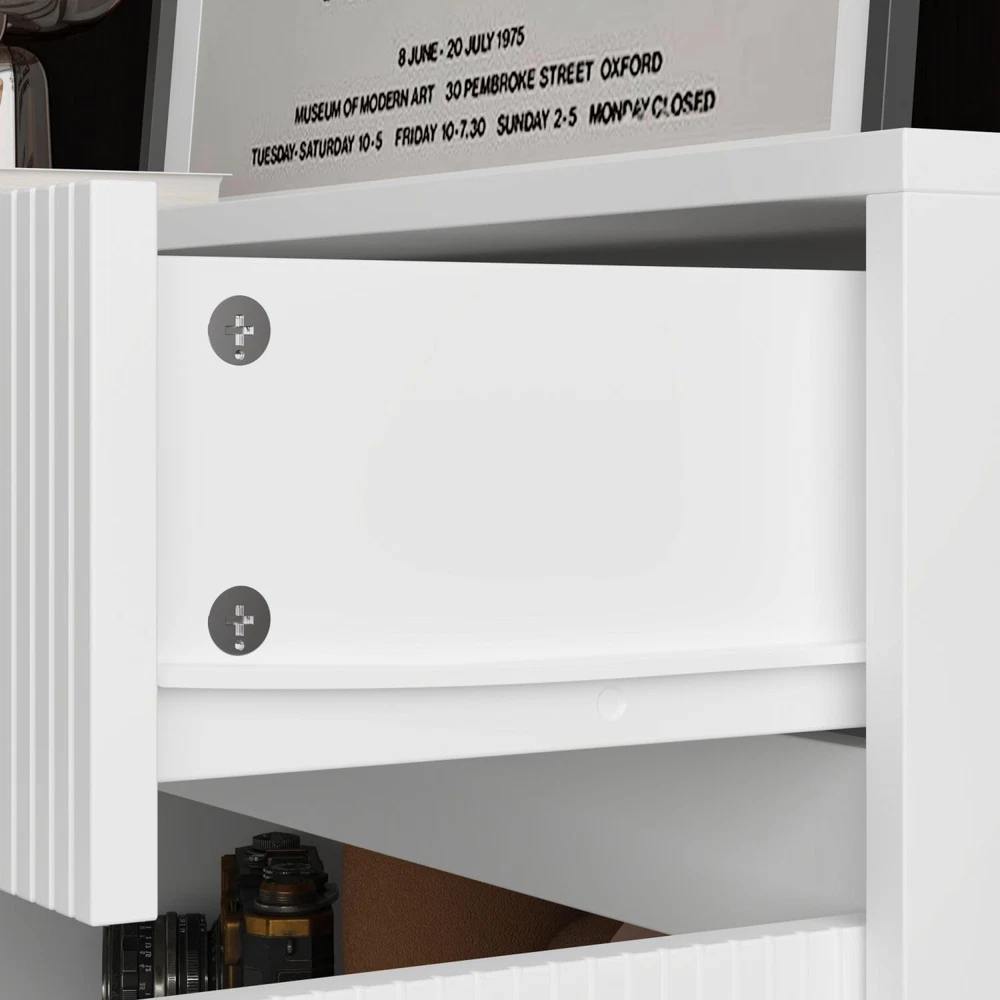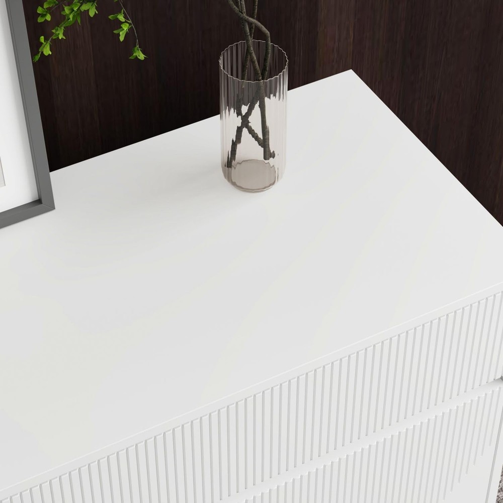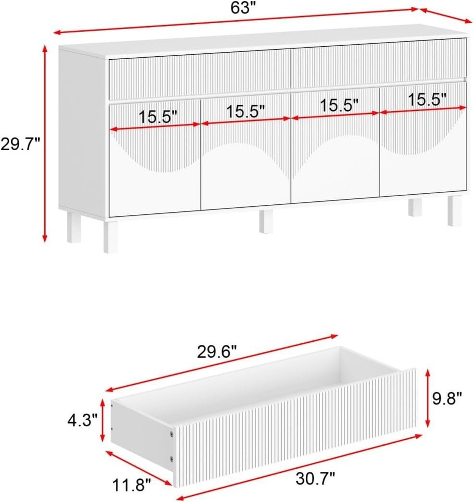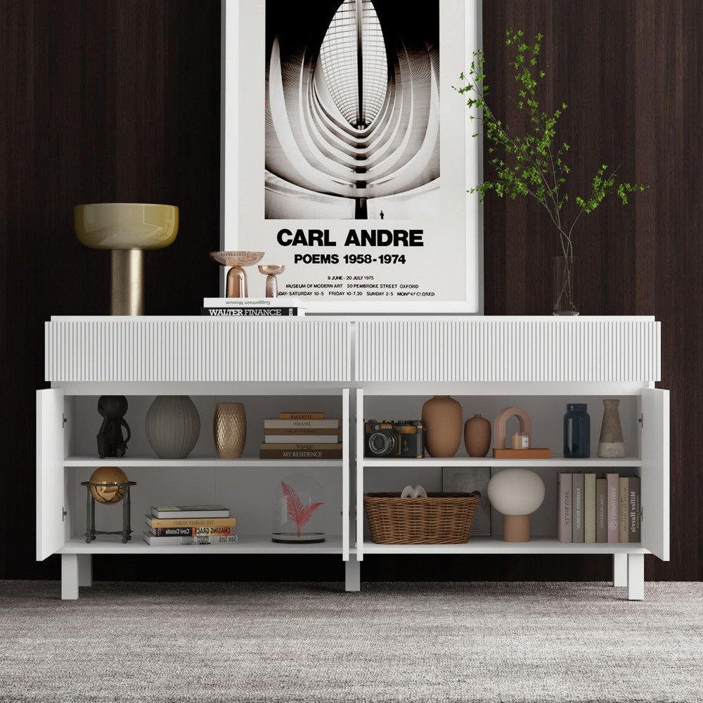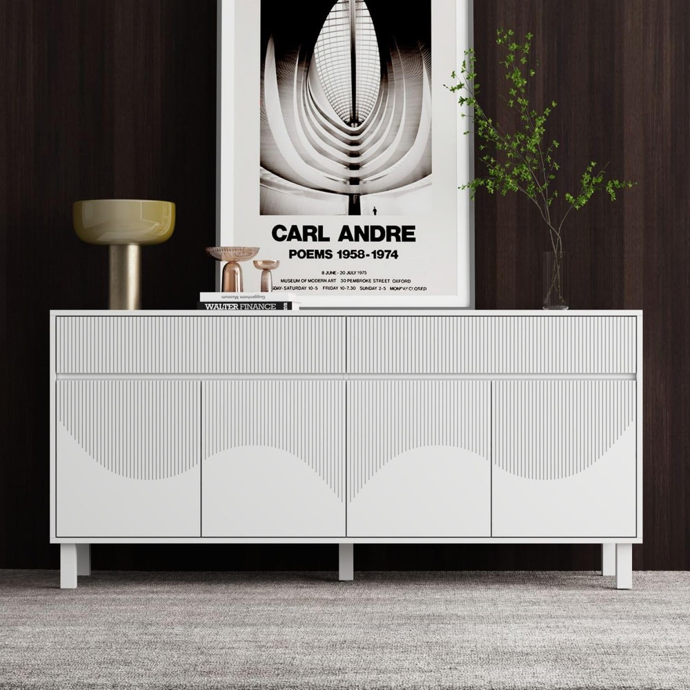 Product Description About this item • Modern Style - This sideboard cabinet features carved design on doors. Carved lines form beautiful patterns, adding a sense of exquisite art. While hidden handle design allows this modern buffet cabinet presenting a stylish and minimalist appearance. It will fit to many decor. • Sideboard Cabinet with Storage - Buffet sideboard possesses 2 wide drawers and cabinets with adjustable shelves, offering ample storage to store books, ornaments, tableware, CDs and more. 63” W tabletop is spacious that can hold coffee machine, cups and some decorations. • Multipurpose Cabinet - The white sideboard is multipurpose to use. Chic wave carved design will add a touch of elegance to your rooms. Practical storage function makes it be suitable for living room, hallway, entryway and kitchen, helping to organize various belongings. • Stable to Use - Mainly crafted from MDF, our white sideboard is built to last. It is equipped with sturdy wood legs and anti-tipping devices, enhancing its stability. The middle support leg is adjustable, allowing it stand stably on uneven floor. Dimension: 15.7”D x 63”W x 29.7”H. • Assembly - This modern buffet table will come with a detailed instruction and necessary hardware. All accessories are labeled. Please check out that all parts are received and intact before assembly. We recommend 2 person to setup it together for a smoother process. Sideboard Storage Cabinet with 4 Doors & 2 Drawers, No Handles, Modern Buffet Sideboard with Shelves, Buffet Cabinet with Wood Legs, White, for Living Room Kitchen, 15.7”D x 63”W x 29.7”H On Aug 13, 2025 at 20:25:23 PDT, seller added the following information: