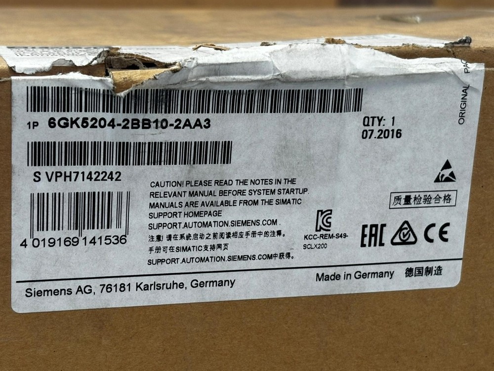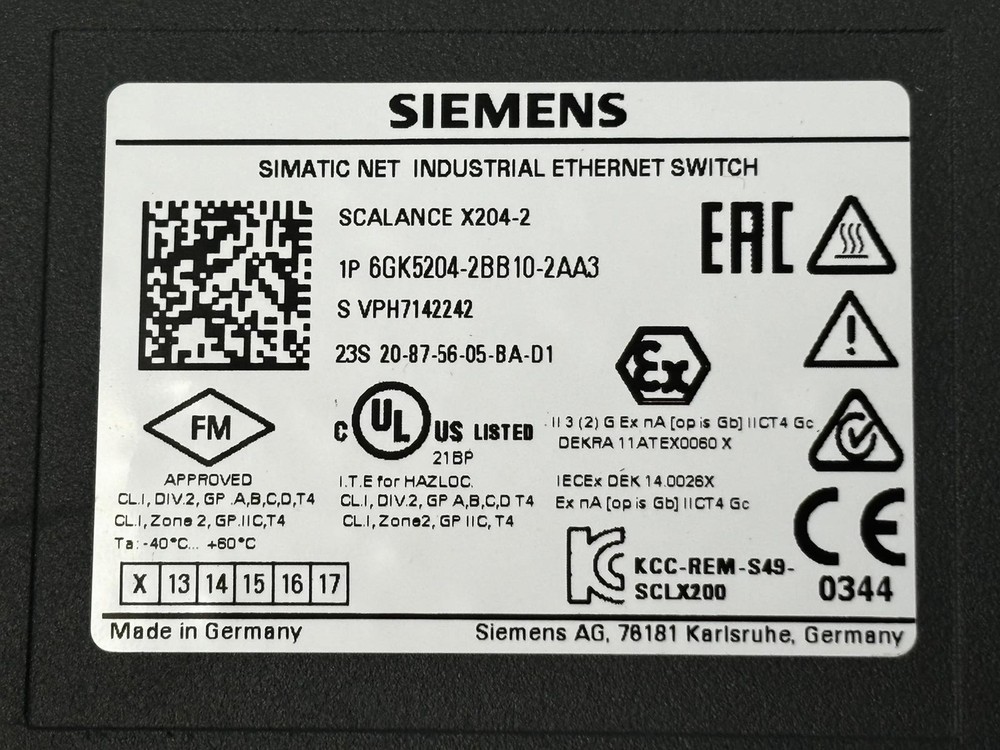 Condition / Zustand: Appears unused, in original packaging. No signs of use. Comes from surplus inventory of a closed factory – therefore sold as untested, no guarantee of being brand new. Sieht unbenutzt aus, in Originalverpackung. Keine Gebrauchsspuren. Stammt aus dem Lagerbestand einer stillgelegten Fabrik – daher als ungetestet verkauft, ohne Garantie auf Neuware. Technische Daten (DE): Hersteller: Siemens Serie: SCALANCE X Typ / Bestellnummer: 6GK5204-2BB10-2AA3 Produkt: Industrial Ethernet Switch Modell: X204-2 Zertifizierungen: CE, UL, FM, EAC, KCC, ATEX, IECEx Temperaturbereich: –40 °C bis +60 °C Herkunft: Made in Germany Lieferumfang: Gerät mit Originalverpackung Technical Data (EN): Manufacturer: Siemens Series: SCALANCE X Model / Order No.: 6GK5204-2BB10-2AA3 Product: Industrial Ethernet Switch Type: X204-2 Certifications: CE, UL, FM, EAC, KCC, ATEX, IECEx Temperature range: –40 °C to +60 °C Country of origin: Made in Germany Scope of delivery: Unit with original packaging