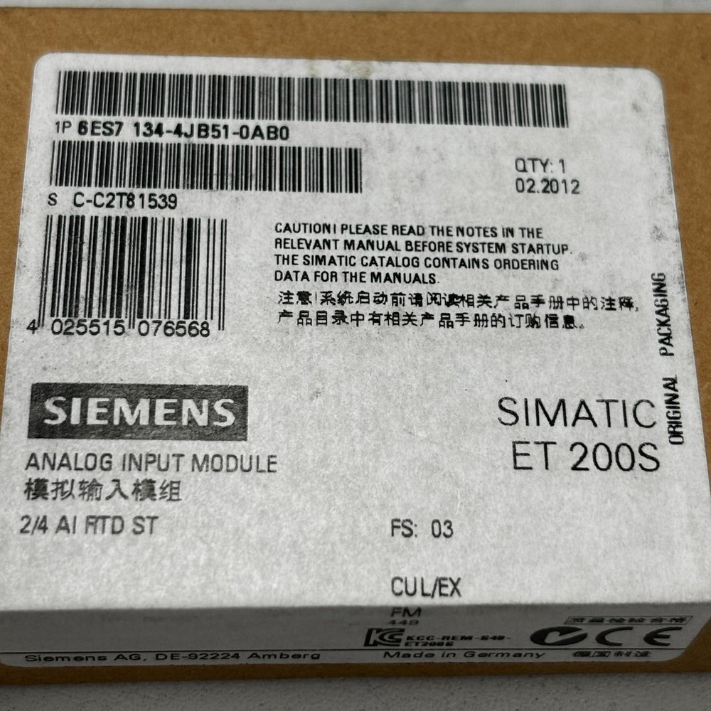Condition / Zustand: New, factory sealed. The item comes from surplus stock of a closed factory. Neu, originalverpackt und versiegelt. Der Artikel stammt aus einer Lagerüberbestandsauflösung einer geschlossenen Fabrik. Technical Data (EN): Manufacturer: Siemens Product line: SIMATIC System: ET 200S Module type: Analog Input Module Description: 2/4 AI RTD ST Part number: 6ES7134-4JB51-0AB0 Inputs: 2 / 4 analog inputs Sensor type: RTD (Resistance Temperature Detector) Functional Safety: FS: 03 Approval: CULUS / EX Quantity: 1 piece Country of manufacture: Germany Technische Daten (DE): Hersteller: Siemens Produktlinie: SIMATIC System: ET 200S Modultyp: Analogeingabemodul Bezeichnung: 2/4 AI RTD ST Artikelnummer: 6ES7134-4JB51-0AB0 Eingänge: 2 / 4 analoge Eingänge Sensortyp: RTD (Widerstandsthermometer) Funktionale Sicherheit: FS: 03 Zulassung: CULUS / EX Menge: 1 Stück Herstellungsland: Deutschland Hinweis für EU-Geschäftskunden: Unsere eBay-Angebote enthalten standardmäßig deutsche Mehrwertsteuer (19 %). Wenn Sie als Unternehmen mit gültiger USt-IdNr. aus einem anderen EU-Land einkaufen möchten und die Reverse-Charge-Regelung nutzen wollen, kontaktieren Sie uns bitte vor dem Kauf . Wir passen das Angebot dann auf Nettopreis (0 % MwSt.) an und stellen Ihnen eine entsprechende Rechnung aus. Notice for EU business customers: All our eBay listings include German VAT (19 %) by default. If you are an EU company with a valid VAT ID and wish to purchase under the reverse charge mechanism, please contact us before placing your order . We will then adjust the listing to a net price (0 % VAT) and provide you with the correct invoice.