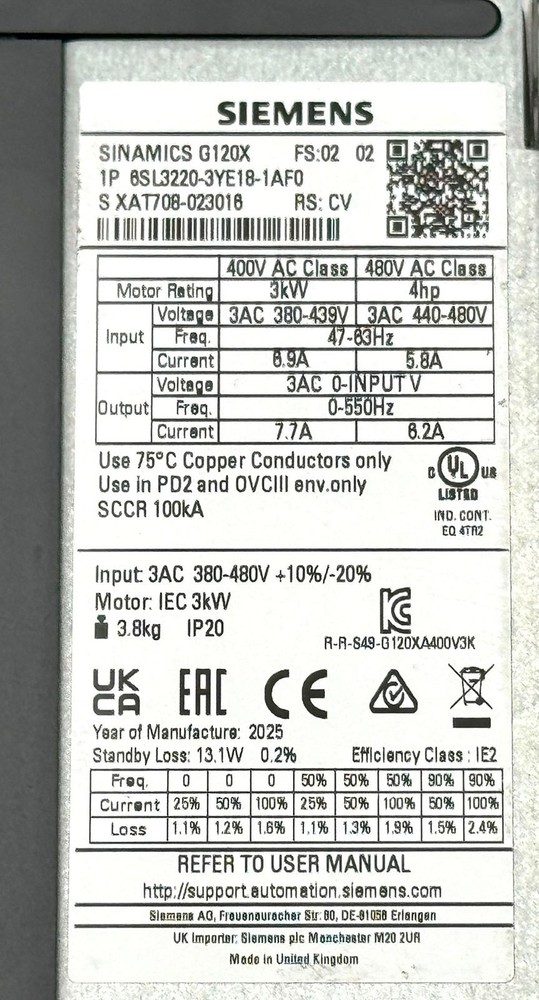 Siemens SINAMICS G120X 6SL3220-3YE18-1AF0 3kW FS:02 Inverter -Unused-