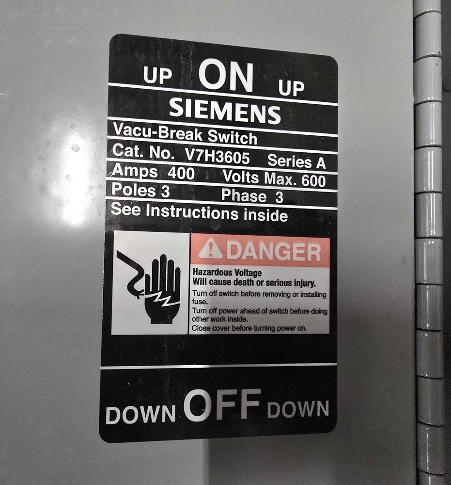 Siemens V7H3605 Vacu-Breaker Panelboard Switch 400A 3P 600V 3PH 400 Amp Item pictured will be exact item you receive unless multiple quantities listed. Please review all pictures carefully. Please ask any questions prior to purchase. Fast Shipping: We strive to ship all orders same day if placed before 3:00 PM EST. If you need next-day or other expediting shipping please contact us for a shipping quote. Warehouse location: Anthony