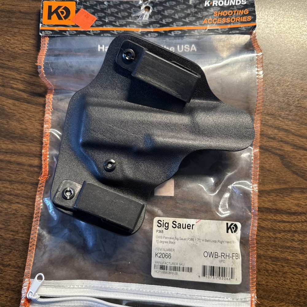 The K Rounds Sig Sauer P365 OWB Pancake Holster is designed for right-handed shooters and made of Kydex material in a black color. It features a level 1 retention system with a forward cant, suitable for tactical use. The holster can accommodate a SIG SAUER P365 pistol in 9mm Luger caliber, offering a secure and lightweight carry option for shooting activities. It is waterproof, weather-resistant, and can be attached to a belt for convenient carry at the 2, 3, 4, or 5 o'clock positions. Made in the United States, this holster is a reliable choice for those looking for a durable and functional holster option.