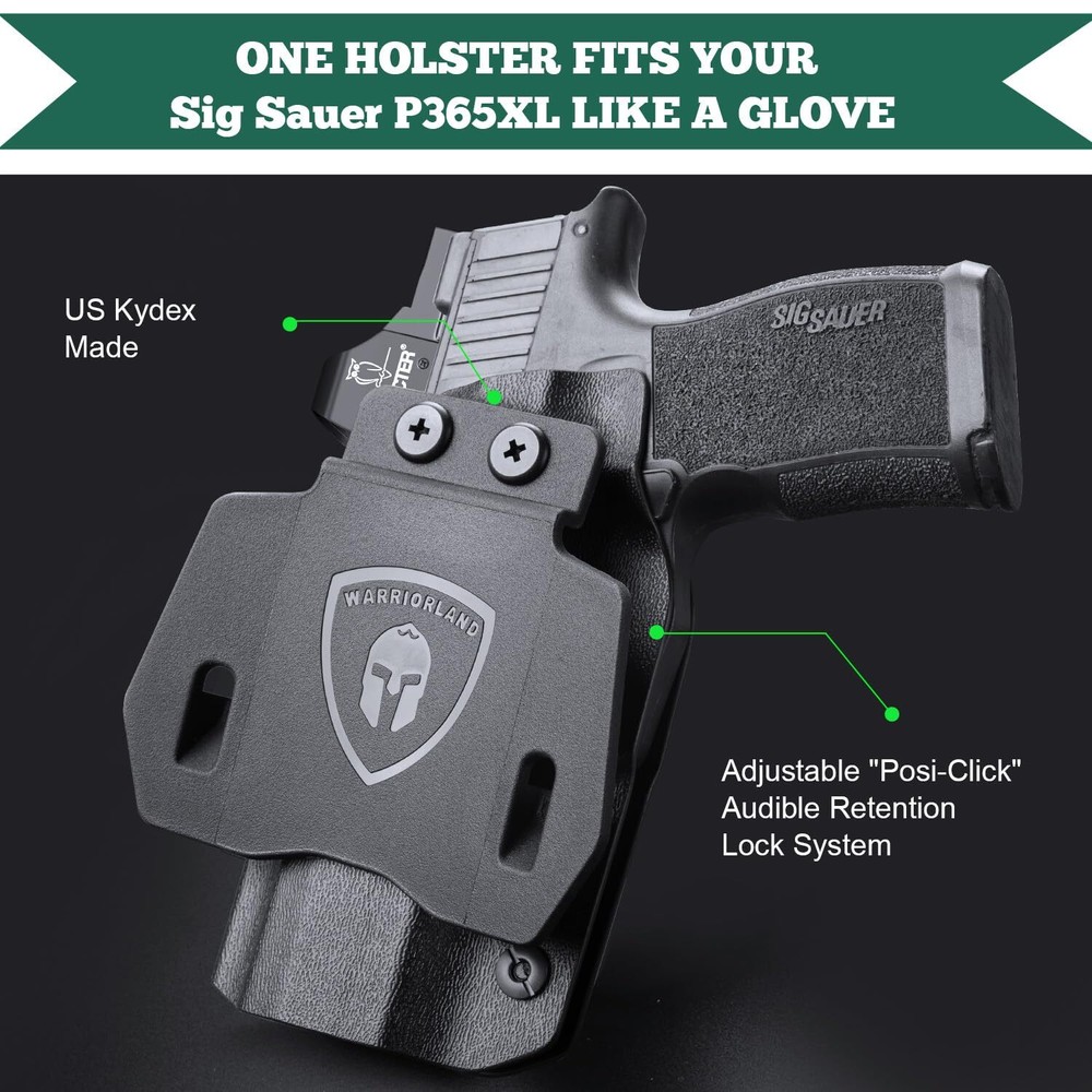 P365XL Holster, OWB Kydex Holster Fit: Sig Sauer P365 XL Pistol, Outside Waistband 1.75 Inch Paddle Holster Sig P365 Open Carry, Posi-Click Audible Retention Lock, Optic Ready, Right Hand COMPATIBILITY - Compatible with Sig Sauer P365XL pistol outside waistband open carry - accommodates variety of optics - Incompatible any Laser/Light COMPENSATOR & OPEN MUZZLE CUT - Sig P365 XL holster OWB can accommodate with various compensators - Over-Cut open muzzle accommodate with threaded barrel 0.08 INCH US KYDEX MADE - OWB holster for P365XL is made of .08" (2mm) US Kydex material, which possess rugged, durable, waterproof, washable and lightweight characters - Super suitable for daily concealed carry HAND POLISHED EDGE & SMOOTH INNER STRACTURE - All WARRIORLAND Kydex holsters edge are polished by hand - Smooth inside structure ensure no scratch nor wear 1.75 DURABLE PADDLE - P365 XL holster Paddle is suitable for 1.5 and 1.75 inch belt, with hook in bottom, it stick firmly in your belt when drawing and holding ADJUSTABLE POSI-CLICK AUDIBLE SYSTEM - You can hear a clear "CLICK" sound when firearm was firmly seated - Retention are adjustable with Philips Screwdriver for suitable tightness LIFETIME WARRANTY - ALL WARRIORLAND holsters possess lifetime warranty, if for any reason you are unsatisfied, please feel free to contact our 24/7 Customer Services, we stand behind the quality of our work!