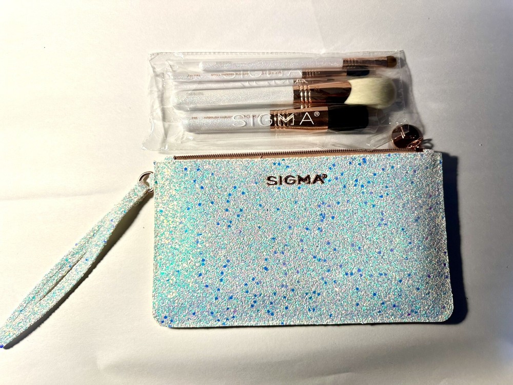 Sigma Beauty Holiday Glam 5-Piece Brush Set & Beauty Bag BRAND NEW! Please note that there are several creases on the box, as well as ripping at the top. Also, there are remnants of a price sticker that was peeled off on the back of the box (refer to photos for further details). “Get your winter wonder-glam on with this stunning brush set, featuring 5 icy cool brushes inside a matching Beauty Bag. Whether you’re enjoying a cozy staycation or traveling somewhere exiting, this festive brush set has everything you need to create a complete look. Includes: -F85 Airbrush Kabuki: soft apply + blend foundation -F44 Powder Sculpt: sculpt with powder products -E55 Eye Shading: evenly apply color across entire lid -E45 Max Small Tapered Blending: soften + blend crease color -E75 Angle Brow: create hairlike brow strokes -Beauty Bag: chic storage for touch-ups on the go. The bag has a peach satin interior and rose good hardware. ——————- Returns accepted within 30 days. The product should be shipped in same condition/packaging/seal that it was sent. Thank you for checking this listing! 🎁