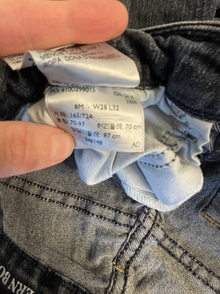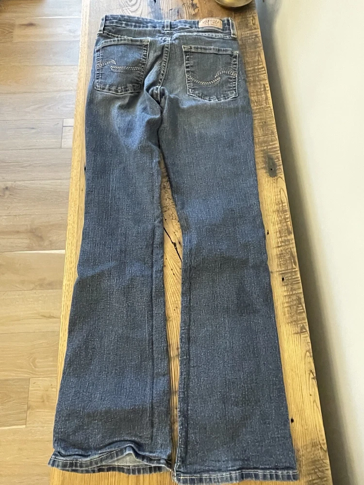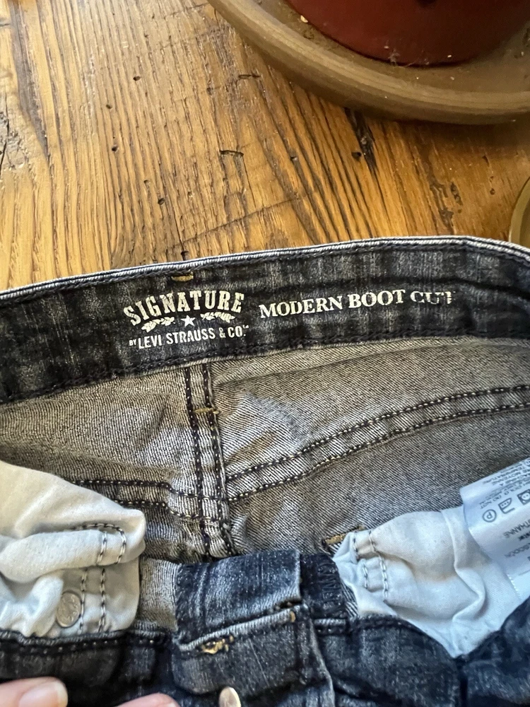 This is a pair of women's boot cut jeans in a modern style by Signature by Levi Strauss & Co. The jeans are in a solid blue color, made of a cotton blend denim fabric with stretch for comfort. They have a mid-rise waist of 28 inches and a size 6 regular fit, with a 32-inch inseam. The jeans feature a zipper closure and are designed for a flattering silhouette with a boot cut style.