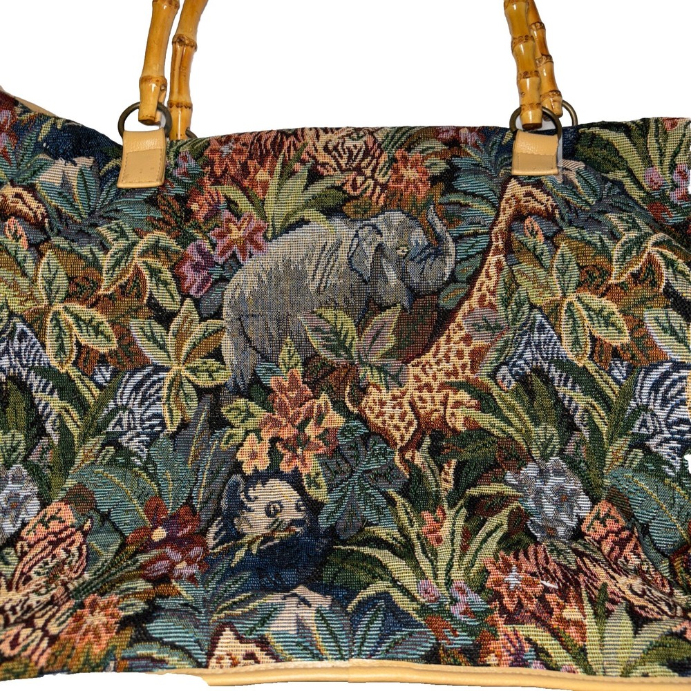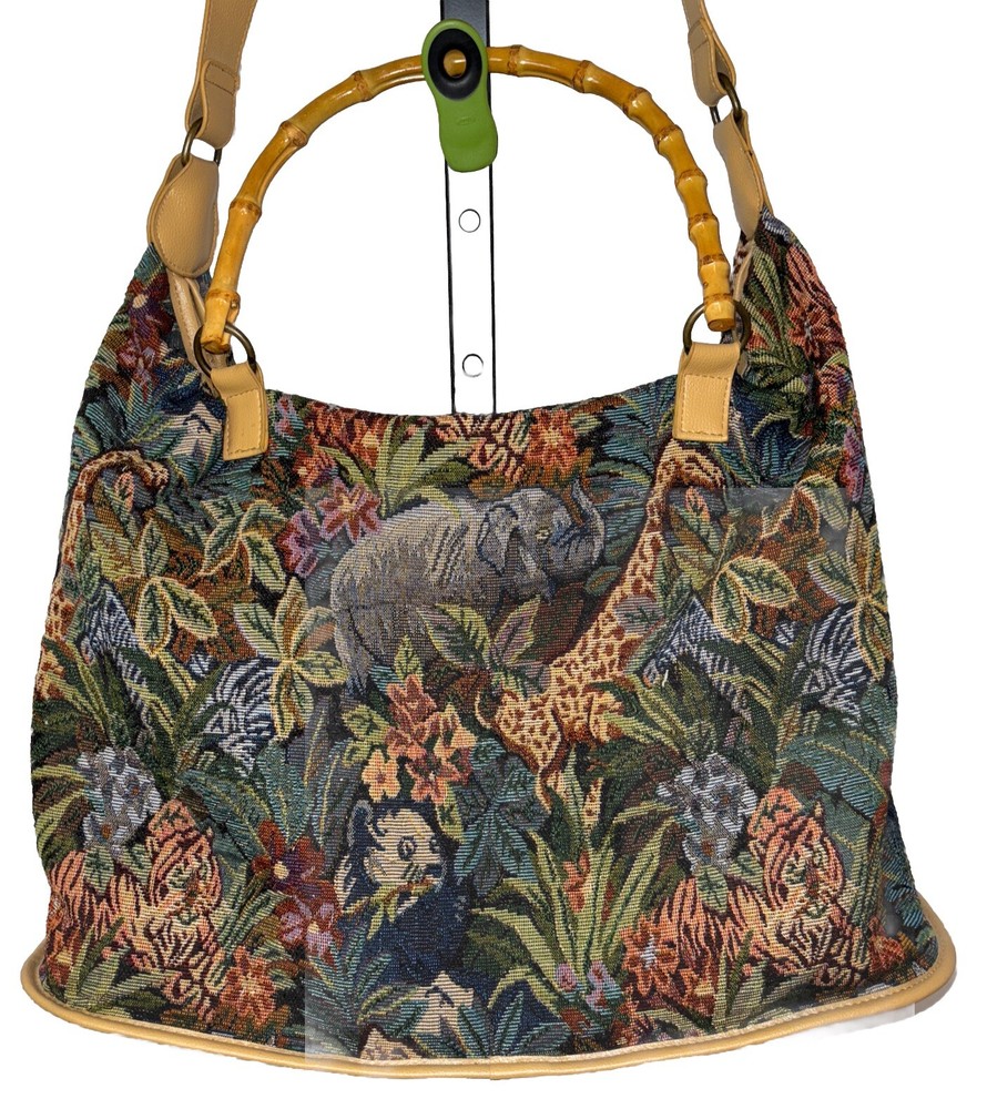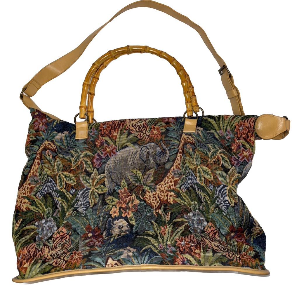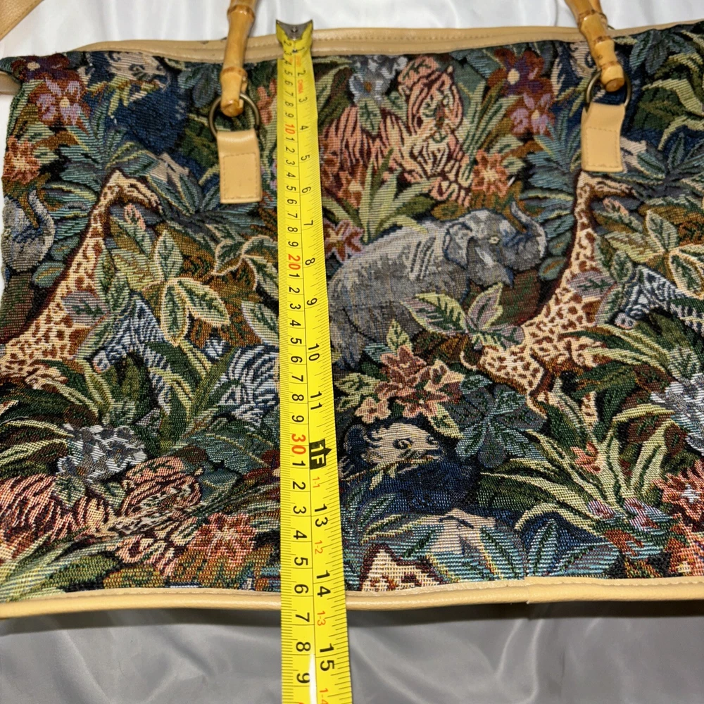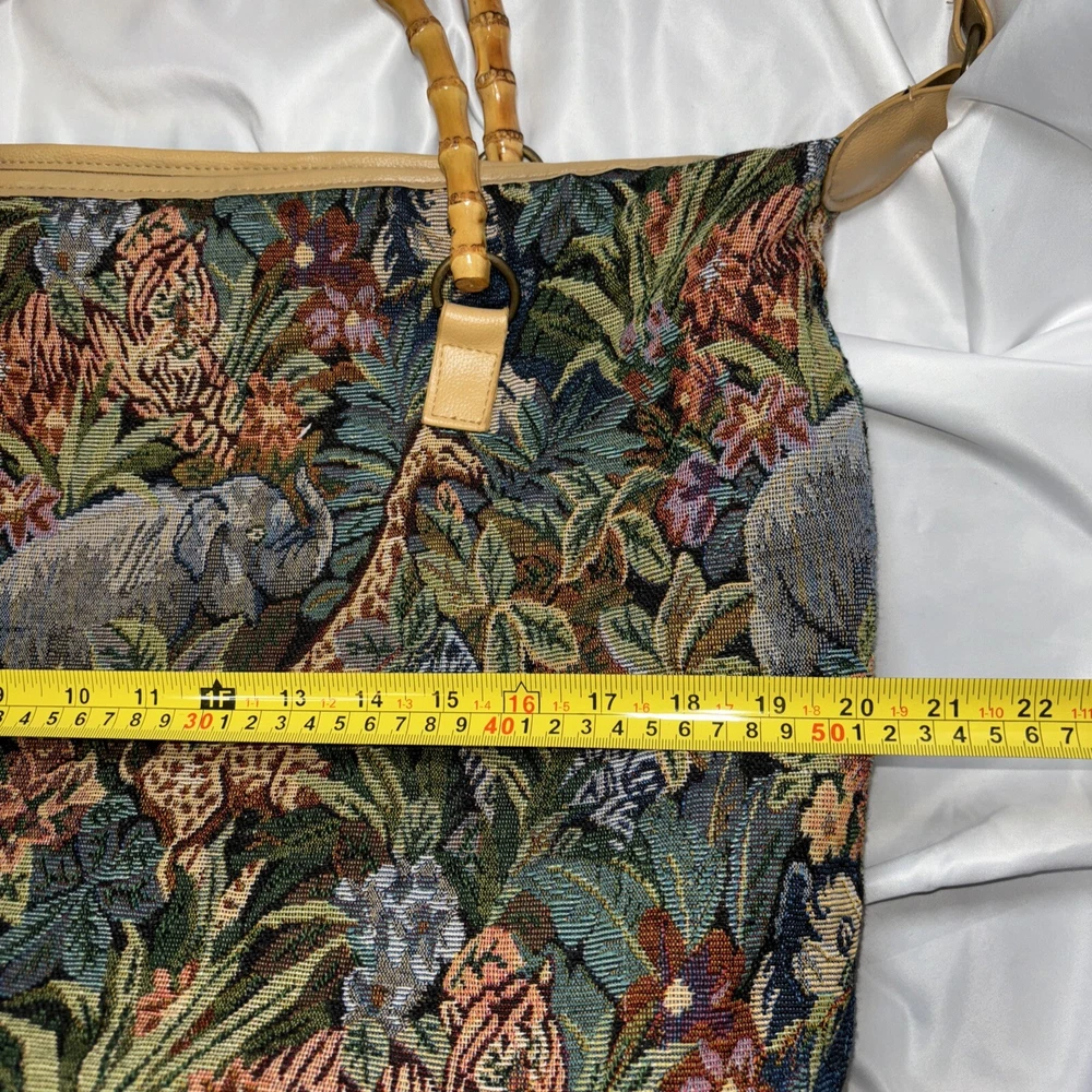 This beautiful tote bag from Signature Club A features a stunning jungle theme with embroidered accents and a colorful floral pattern. The bag is made of high-quality faux leather straps and bottom and has a spacious interior with inner pockets, making it perfect for travel, parties, or casual outings. The bag has a rectangle shape with double handles made of bamboo and faux leather, while the closure is a sturdy zip. The hardware color is beige, adding a touch of elegance to the overall look. The bag is lightweight and easy to carry, with a satin lining that complements the black lining color. Ideal for women who are looking for a stylish and functional bag that will make them stand out. Please look at the pictures for the item for sale. I have tried to capture the condition as much as possible but if you would like more pictures, please feel free to contact me and I will try to accommodate as best I can. Fast shipping always! Thank you for looking! *Offers that are asking close to 50% or more off of the listed price will automatically be declined. All listed items are constantly decreased in price the longer they sit.