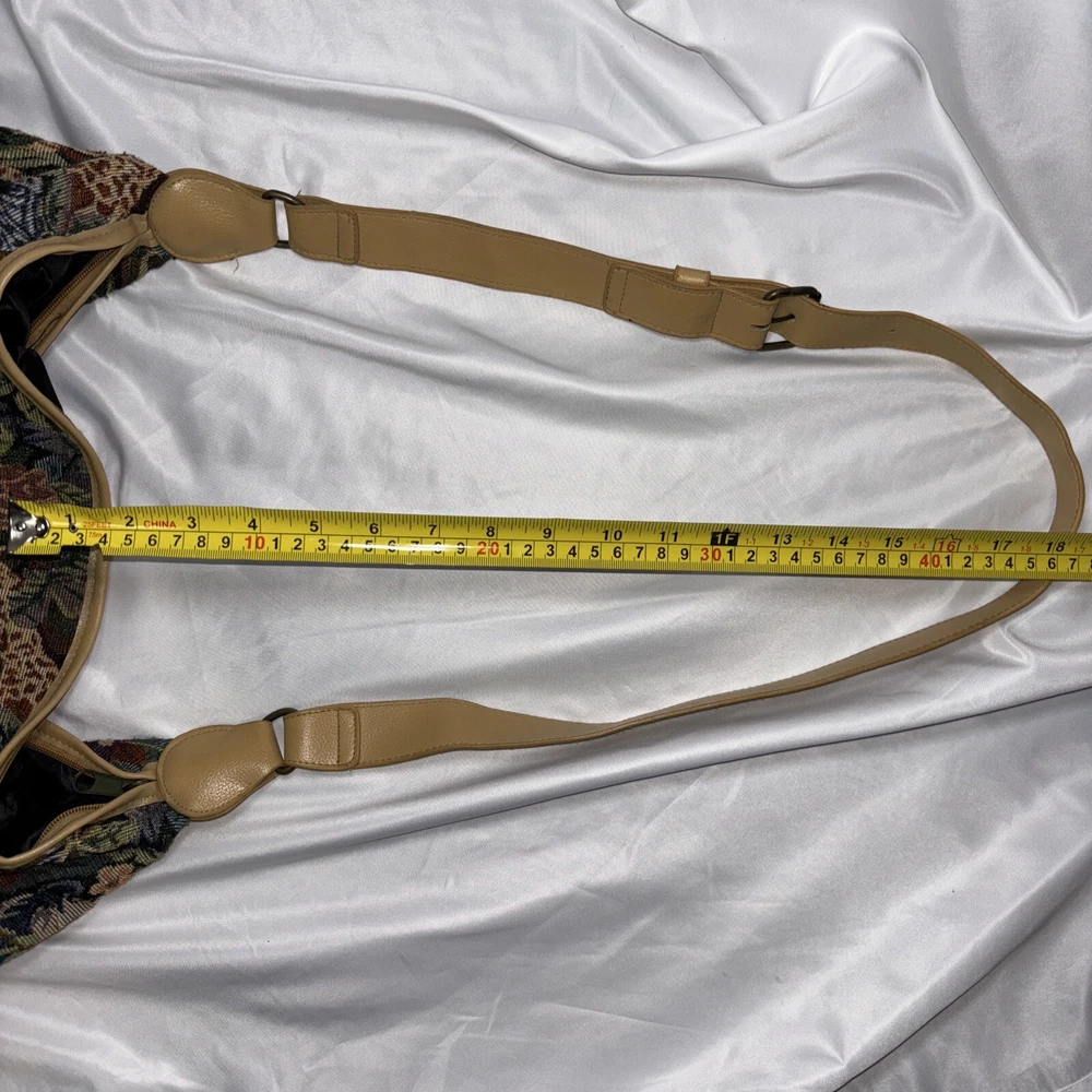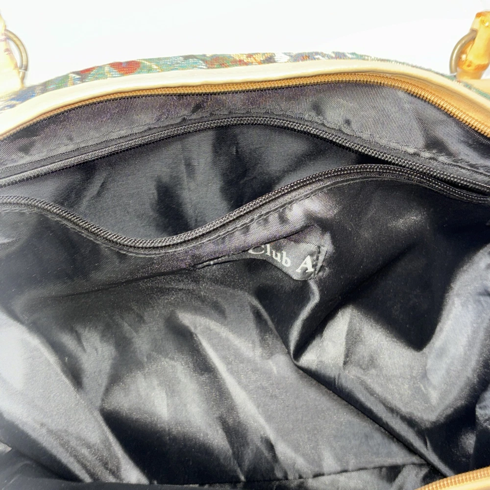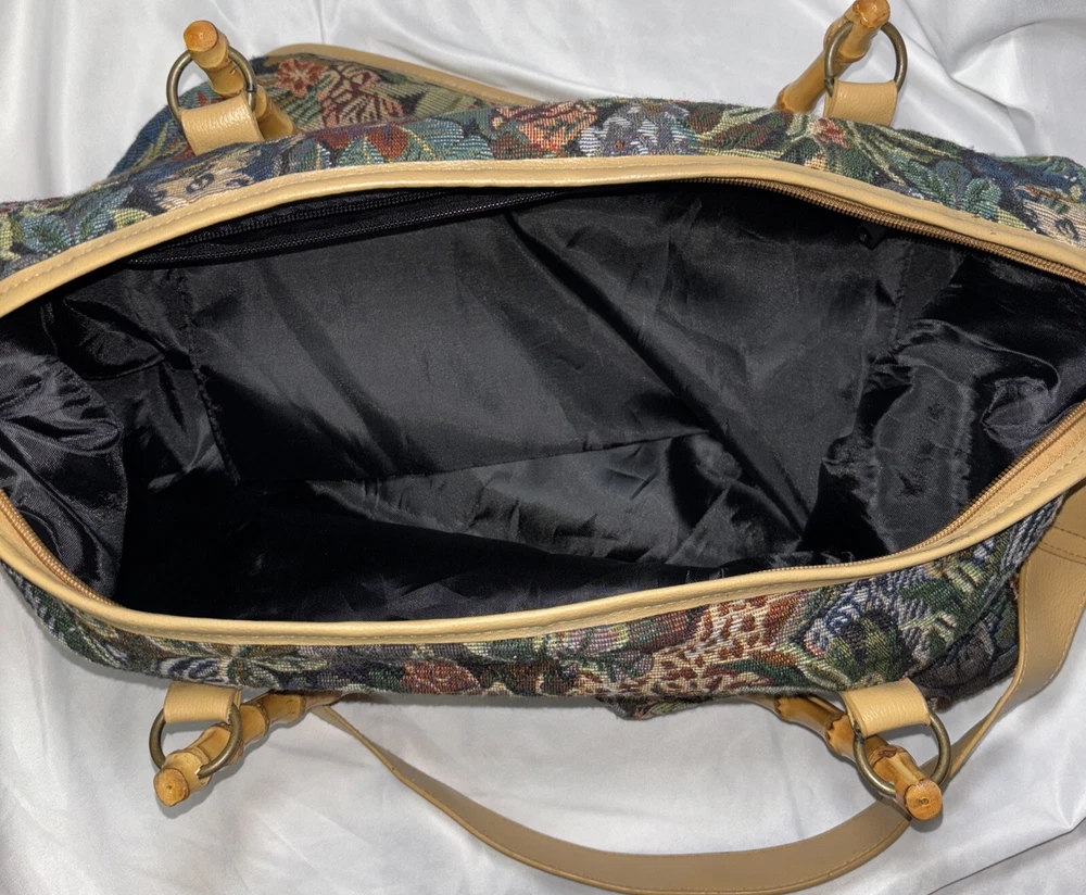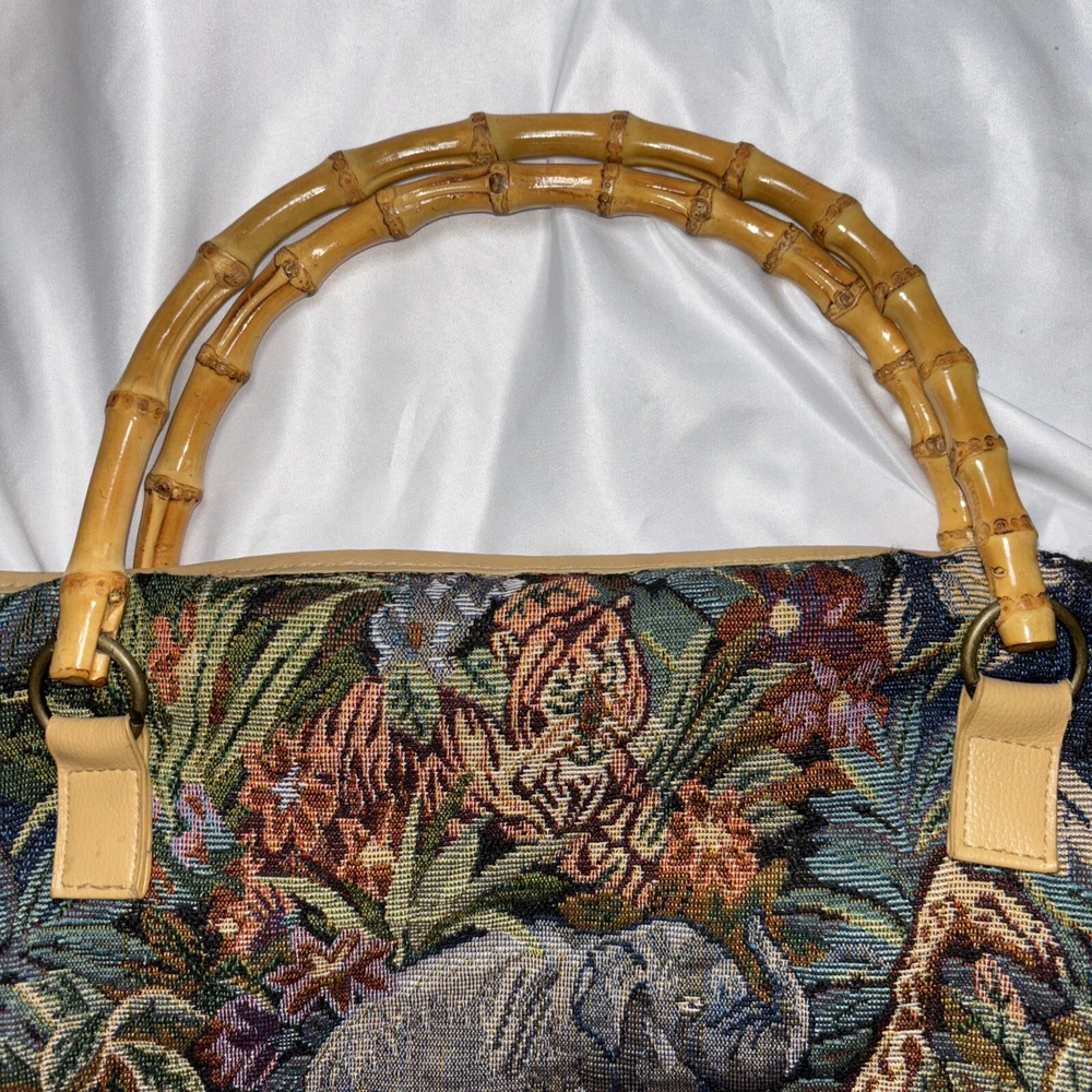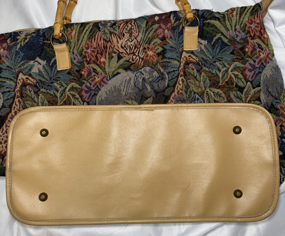 This beautiful tote bag from Signature Club A features a stunning jungle theme with embroidered accents and a colorful floral pattern. The bag is made of high-quality faux leather straps and bottom and has a spacious interior with inner pockets, making it perfect for travel, parties, or casual outings. The bag has a rectangle shape with double handles made of bamboo and faux leather, while the closure is a sturdy zip. The hardware color is beige, adding a touch of elegance to the overall look. The bag is lightweight and easy to carry, with a satin lining that complements the black lining color. Ideal for women who are looking for a stylish and functional bag that will make them stand out. Please look at the pictures for the item for sale. I have tried to capture the condition as much as possible but if you would like more pictures, please feel free to contact me and I will try to accommodate as best I can. Fast shipping always! Thank you for looking! *Offers that are asking close to 50% or more off of the listed price will automatically be declined. All listed items are constantly decreased in price the longer they sit.