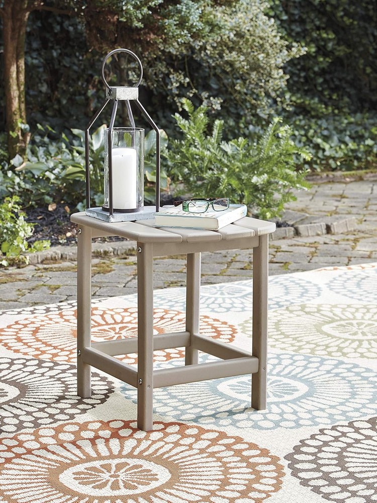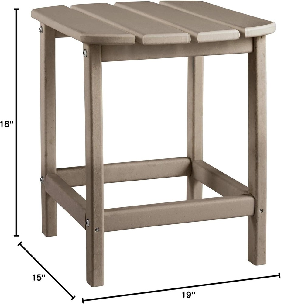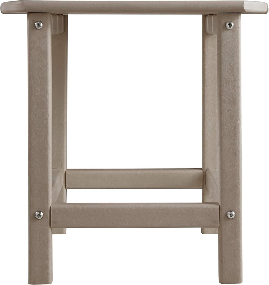 Signature Design by Ashley Sundown Treasure Outdoor Patio HDPE Weather Grey Product Details Brand: Signature Design by Ashley Product Dimensions: 15"D x 19"W x 18"H Color: Grey Product Care Instructions: Wipe with Dry Cloth Recommended Uses For Product: Outdoor storage and surface use Item WeightFrame Material: 9 PoundsPlastic Top Material TypeShape: Plastic/ResinSquare OUTDOOR END TABLE: Need a little extra storage outdoors? This end table is just the thing you need with a design that weathers all the seasons and a slatted top for extra style DURABLE DESIGN: Made of virgin high density polyethylene (hard plastic) material with a textured grain finish. Designed to shed rainwater easily TRENDY NEUTRAL: The textured grain in a grayish brown strikes such a stylish pose anywhere it's placed. Paired with your favorite decor accent or a pitcher of lemonade, this table's sure to please VERSATILE USE: Measuring 19" W x 15" D x 18" H, this side table is great set on any patio, deck or pool area ASSEMBLY REQUIRED: Easy-to-follow instructions, hardware and tools included DIRECT FROM THE MANUFACTURER: Ashley Furniture goes the extra mile to package, protect and deliver your purchase in a timely manner BUY WITH CONFIDENCE: Designed and manufactured by Ashley Furniture Industries. The trusted source for stylish furniture, lighting, rugs, accessories and mattresses. For every taste and budget Add cottage-quaint charm to your outdoor oasis with this outdoor end table in grayish brown. Made of MEGA TUFF™ high-density polyethylene material, it’s sure to weather the seasons beautifully. Designed to shed rainwater, the table’s slatted top with gently rounded corners provides exceptional form and function. With a variety of styles and materials, accent tables can provide storage in a living room or give guests a spot to rest their drinks. They can add subtle drama to your decor by presenting a place for artwork, a lamp or a plant. We have a wide selection of coffee tables, console tables and occasional tables, from rustic farmhouse designs to modern openwork styles. They come in a multitude of sizes, too, so you will find one that fits just where you need it.