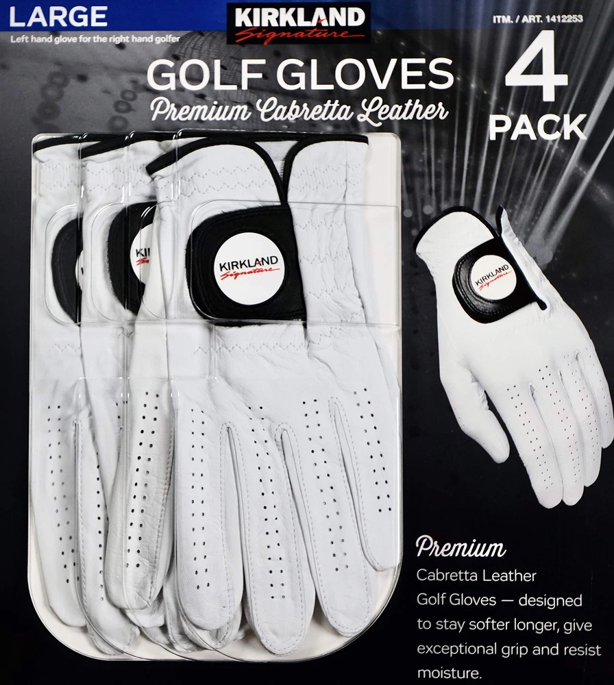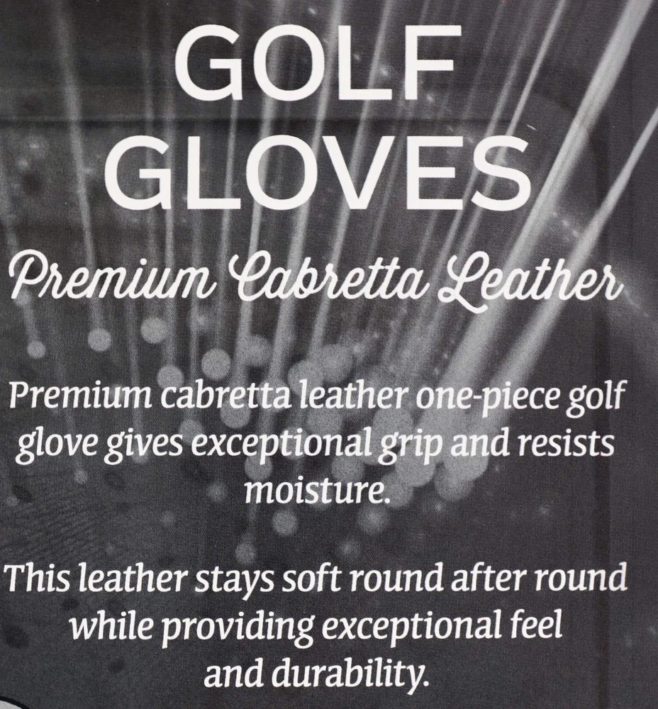 Introducing the Signature Premium Cabretta Leather Golf Glove. Premium Cabretta Leather "One Piece" Glove gives exceptional grip and resists moisture. This leather stays soft round after round while providing exceptional feel and durability. The closure tab provides comfort and a perfect fit. Left Hand Glove for the Right Handed Golfer Premium Cabretta Leather One-Piece Glove. Resists Moisture Closure Tab Size: Large