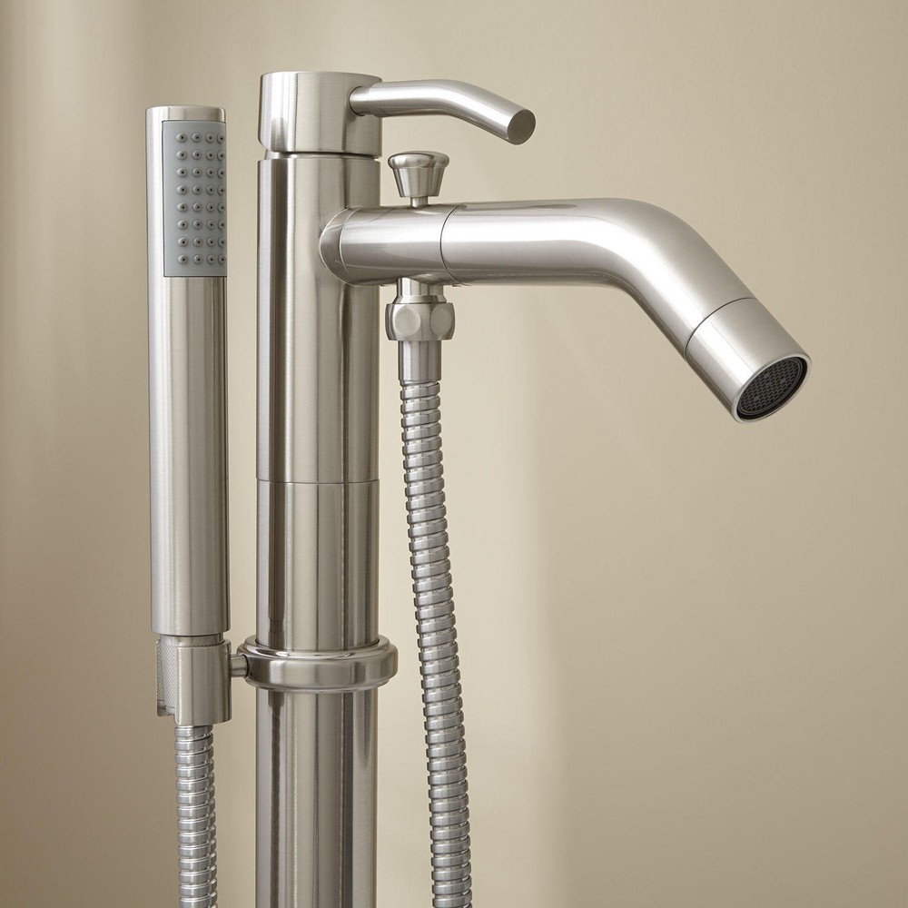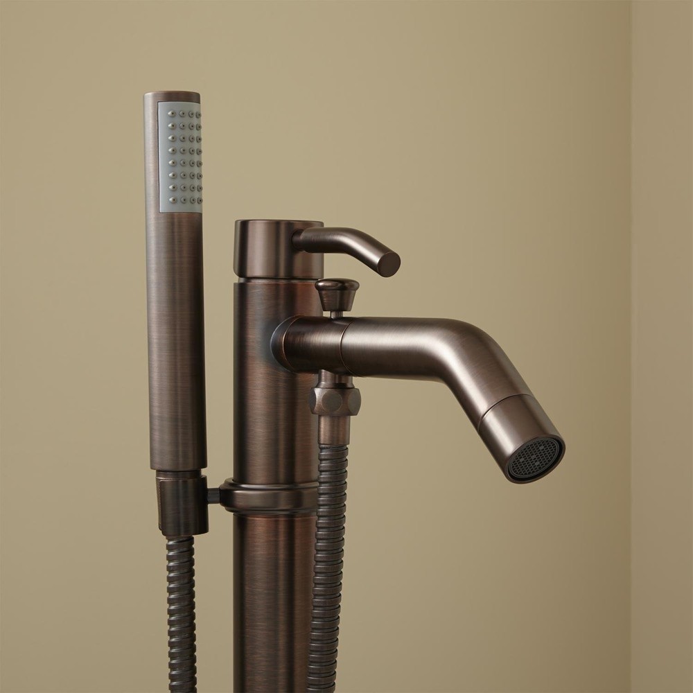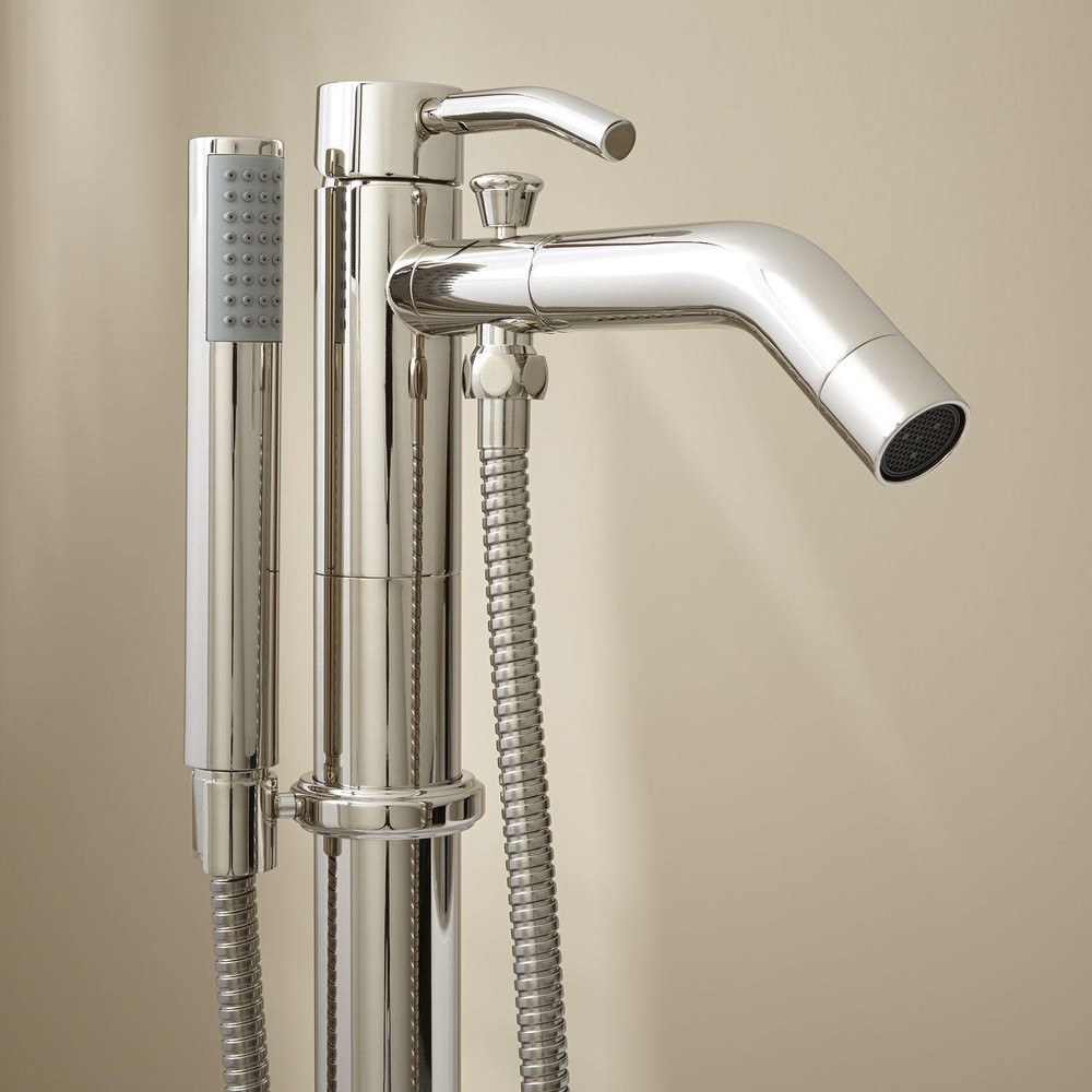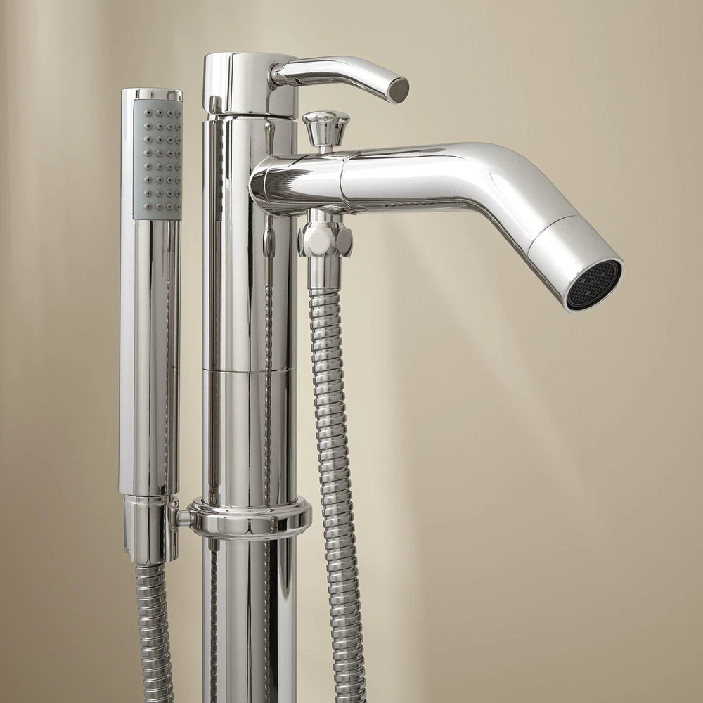 Signature Hardware 926635 Caol Floor Mounted Tub Filler- Includes Hand Shower About Signature Hardware 926635: The Caol Freestanding Faucet fittingly complements a sleek contemporary tub with the added benefit of a hand shower. This tub filler's minimalist design is accented by an angled lever and spout. The faucet's tubular hand shower is connected with a long, flexible hose that allows for convenient rinsing. Signature Hardware 926635 Features: Floor mounted / freestanding tub filler Covered under Signature Hardware's limited lifetime warranty Constructed of brass, ensuring durability and dependability Brass is highly resistant to corrosion and an excellent choice to withstand high temperatures Coordinates with products from the Caol line seamlessly Freestanding design mounts to wood or tile floor with included mounting plate Includes hand shower - single function hand shower handy for rinsing down the tub or just rinsing off after a bath Integrated diverter included - located on the tub spout Includes flexible supplies for under-floor hookup Underfloor access is required for proper installation - Installation on a concrete slab will require cutting and concrete removal Signature Hardware 926635 Specifications: Height: 37-1/4" (bottom to top) Spout Height: 33" (deck to spout outlet) Spout Reach: 8-1/4" (center of faucet body to center of spout outlet horizontally) Hand Shower Hose Length: 60" Shipping We offer FREE shipping on all orders! We ship within Three business days of payment, usually sooner. We use a selection of shipping services such as UPS, FedEx, USPS etc. We only ship to the lower 48 states, no APO/FPO addresses or PO Boxes allowed. Local pickups and combined shipping options are not provided at this time. Return You can return a product for up to 30 days from the date you purchased it. Any product you return must be in the same condition you received it and in the original packaging. Please keep the receipt. Payment We accept payment by any of the following methods: PayPal Please pay as soon as possible after winning an auction, as that will allow us to post your item to you sooner! Feedback Customer satisfaction is very important to us. If you have any problem with your order, please contact us and we will do our best to make you satisfied. Contact Us If you have any queries, please contact us via ebay. We usually respond within 24 hours on weekdays. Please visit our eBay store to check out other items for sale! Thank you for shopping at our store.