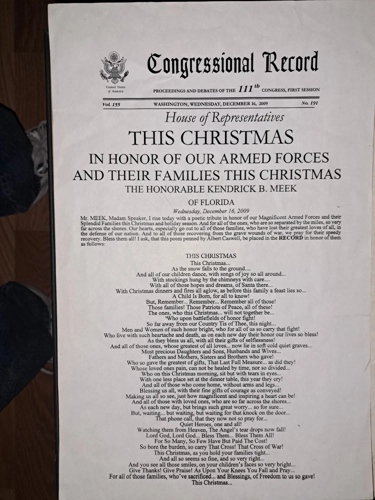 Poem in library of Congress 2009 with signatures of members of Congress including John McCain and many, many others