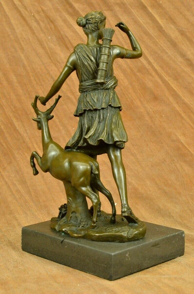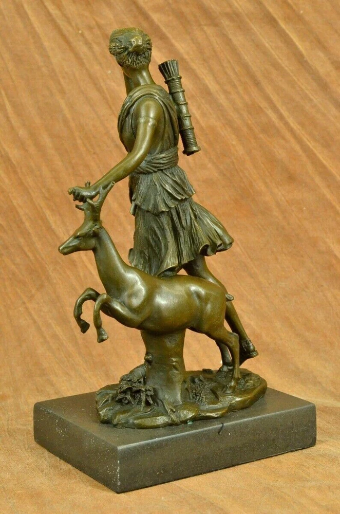 Signed Cast Bronze Diana The Huntress Art Deco Nude Sculpture Statue Mythical Signed Cast Bronze Diana The Huntress Art Deco Nude Sculpture Statue Mythical Condition : This sculpture is in perfect condition. Bronze Dimensions with Marble Base: Height 12" x Width 7 " Marble Dimensions: 7" X 5" Height without base: 11" Weight: 10 LBS Inventory: 90YRD9465709 Honoring the revered goddess of the hunt, woodland, and the moon, this sculpture pays homage to Diana, also known as Diana Nemorensis or Artemis. A goddess worshipped in various forms across ancient cultures, she held sway over the realms of animals and the wilderness. Shrines dedicated to Diana still stand in places like Capua and Aricia near Rome, with her sanctuary at Lake Nemi earning her the title Diana Nemorensis, emphasizing her connection to the woods. This bronze masterpiece captures the essence of the beloved goddess, depicting her wielding a mighty spear while standing atop a wild boar. Her flowing dress flutters in the wind, revealing her curvaceous and voluptuous form, her hair cascading wildly as she exudes both strength and femininity. Crafted with meticulous attention to detail, this 100% handmade bronze sculpture embodies the rich symbolism associated with Diana. The brown patina finish, achieved through the revered "Lost Wax Method," not only enhances the sculpture's aesthetic appeal but also serves as a testament to the precision and artistry involved in its creation. Mounted on a sleek black marble base, the sculpture becomes a striking centerpiece, inviting viewers to contemplate the timeless qualities of beauty, strength, and chastity that Diana represents. Bearing the signature of the esteemed artist Pierre le Faguays, this sculpture is more than a representation of a goddess; it is a celebration of feminine power and resilience throughout history. Diana has transcended the boundaries of mythology to become a symbol of empowerment and femininity. Over time, she has garnered recognition as a feminist figure, embodying beauty, strength, and chastity. This bronze portrayal, with its intricate details and expert craftsmanship, stands as a tribute to the enduring allure and significance of Diana, inviting observers to connect with the timeless qualities embodied by this revered goddess. Art Deco Artemis Diana the Hunter Huntress with Stag Deer Bronze Sculpture Statue YRD-946 Video will open in a new window Using the eBay App? Paste link into a browser window: [isdntekvideo] Shipping Terms : Most of our items are shipped via USPS (United States Postal Service) mail or UPS. Most orders are shipped within 24-48 hours of purchase. Please be aware that not all items are available for USPS shipping due to size and weight. We do ship to Hawaii, Alaska, Canada, Puerto Rico, APO/AE, and U.S. Virgin Islands, however, an additional charge may be required. Please contact us before making any purchases in these areas. For Non-USA customers, you may be responsible for all duty, tax, brokerage fees that may be due upon delivery (shipping costs cover freight charges only). We also ship internationally. Please refer to the "Shipping and Handling" chart for the rates for each area. Payment : We accept just about any form of payment. PayPal, Master Card, Visa or American Express credit cards. Money orders, cashiers checks, and even personal or business checks. For governmental institutions, we will also accept a purchase order. Please understand that for personal or business checks we have to wait for the check to clear (usually 7 days) before shipping. Condition : New Detailed Hand Crafted Hot Cast Bronze Satisfaction Guaranteed. This is Stock Photo, Slight Color Variation!! Listing and template services provided by inkFrog