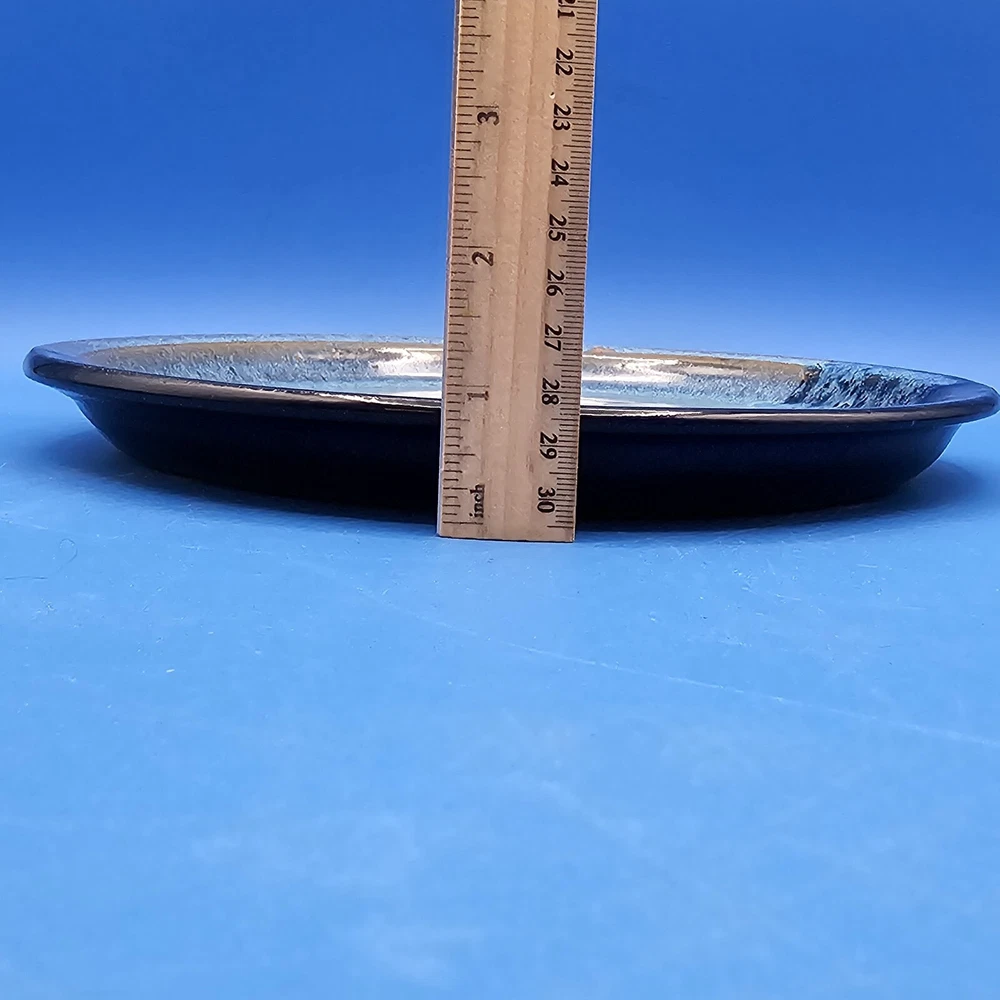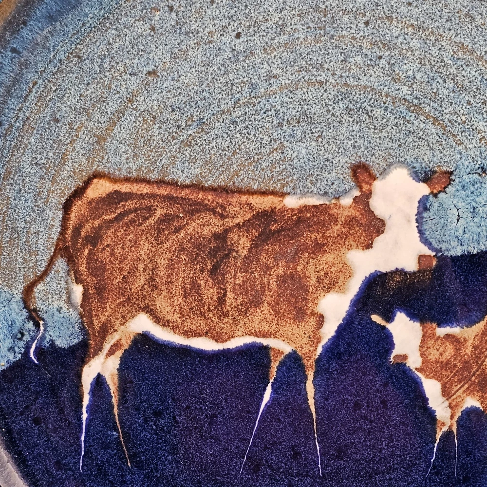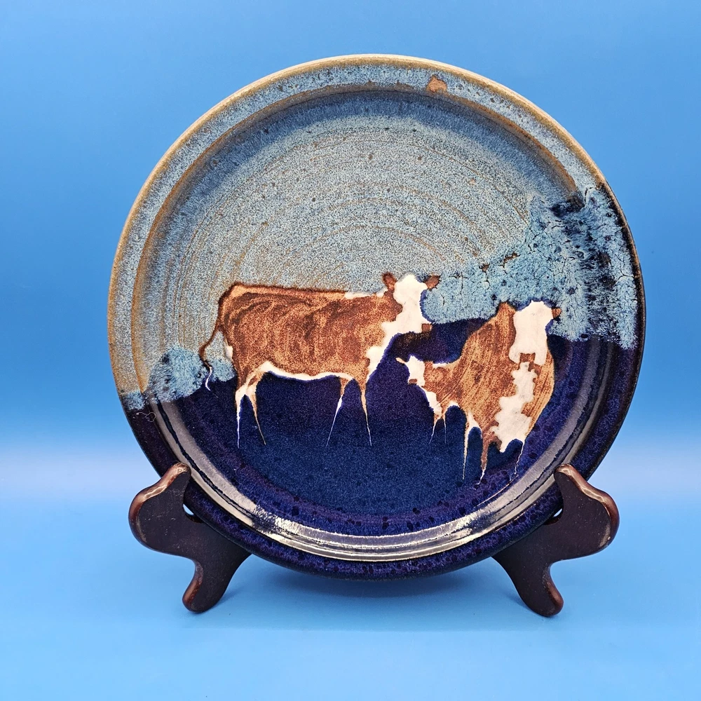 This beautiful 10-inch dinner plate from Blue Cow Pottery features a stunning drip glazed ceramic design with a cow pattern in blue color. The plate is handmade with clay material and has a glossy finish. It is a vintage item from the 2000s, but still in excellent condition. The plate is perfect for all occasions and adds a decorative touch to any table setting. Care instructions are included for hand washing only. This original, studio crafted plate is a one-piece set and weighs 1 lb 5 oz. It is a great addition to any collection and produced in the United States.