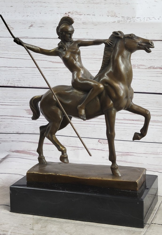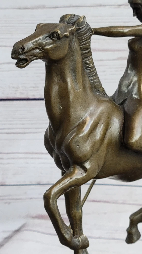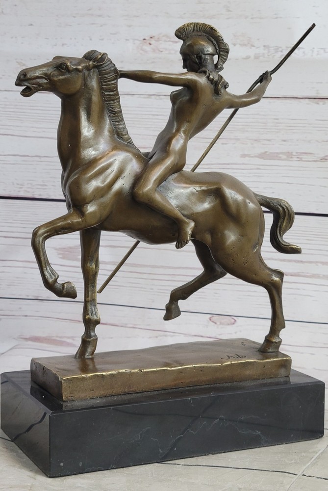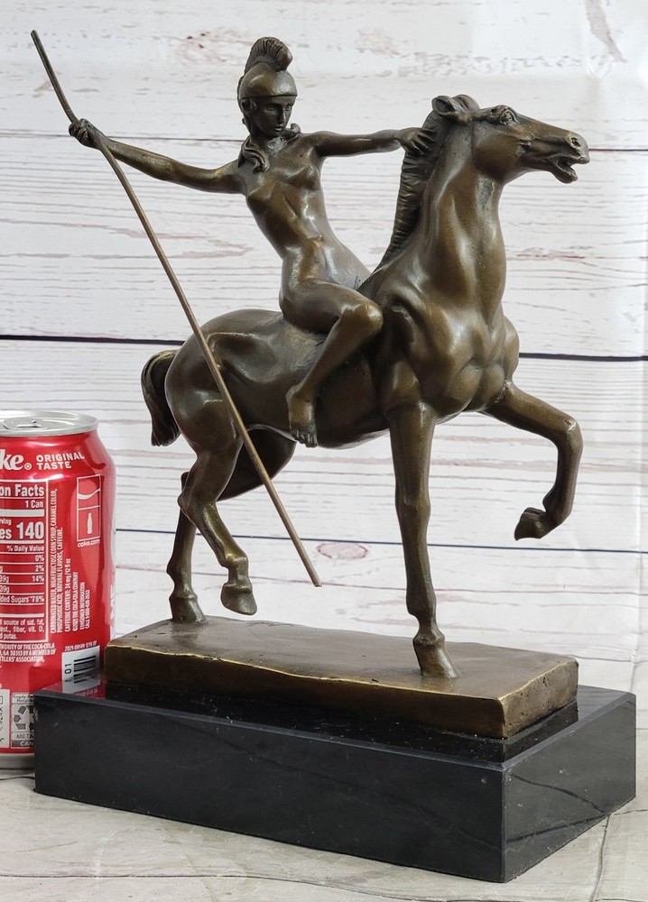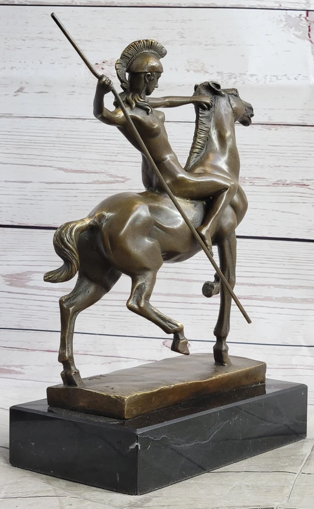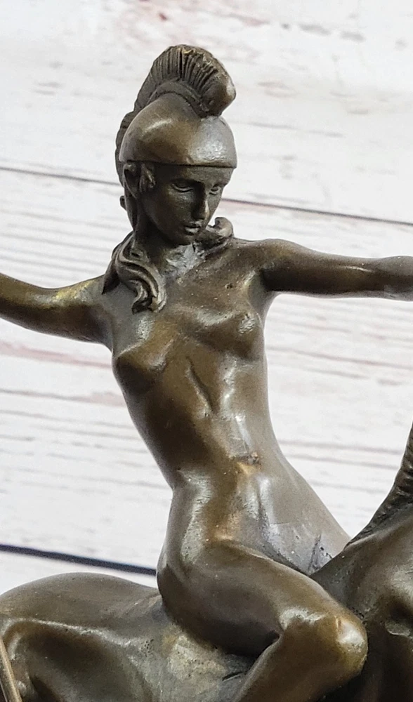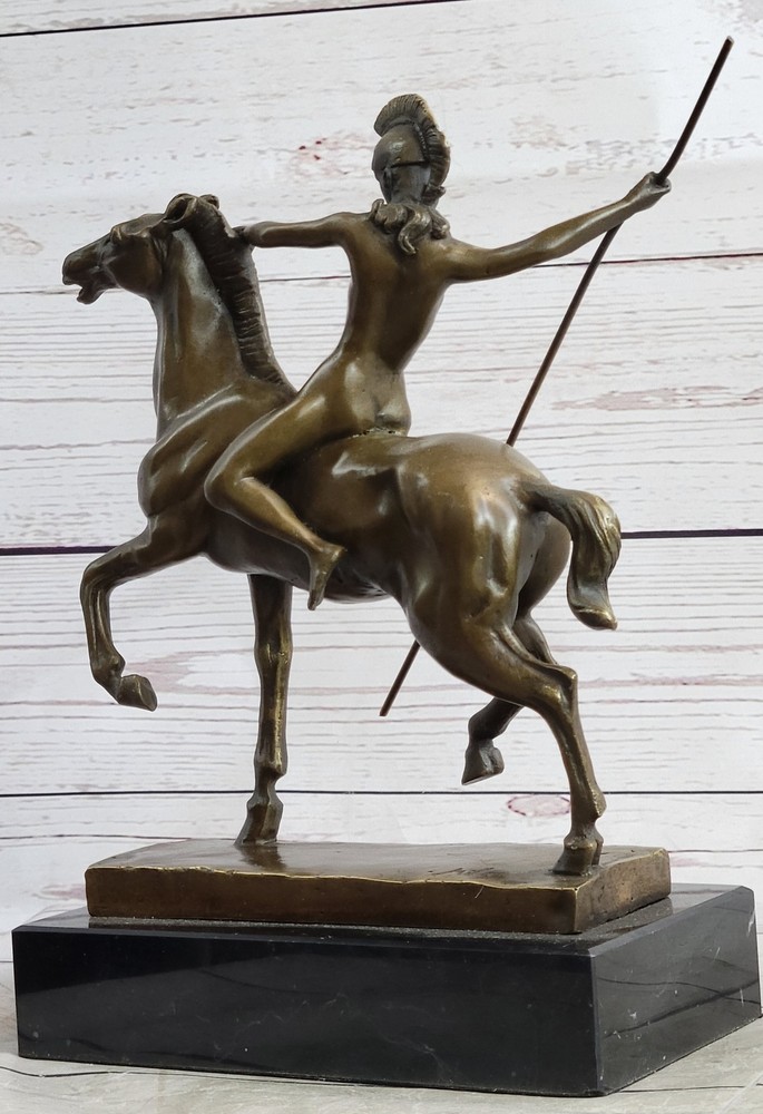 Condition : This sculpture is in perfect condition. Bronze Dimensions with Marble Base: Height 10" X Width 9" Marble Dimensions:7 " X 4" Height without base:8 1/2" Weight:10 LBS Inventory:47YCN0614874 Introducing a captivating bronze sculpture that embodies the essence of freedom and liberation. This exquisite piece portrays a nude woman fearlessly riding through the forest, embodying a sense of unburdened joy and embracing the possibilities of a new life. With an unrestrained spirit, she leaves the past behind, galloping towards a future full of endless possibilities. Crafted with utmost skill and precision, this sculpture was created using the esteemed lost-wax method of casting, ensuring the finest quality and intricate details. Made entirely of bronze, it showcases the artist's mastery in capturing the human form and evoking a powerful emotional connection. The sculpture is adorned with a rich brown patina, accentuating its depth and adding a timeless allure to the artwork. This remarkable piece stands proudly upon a sleek black marble base, providing a striking contrast and further elevating its visual impact. The sculpture bears the signature of the talented artist Milo, guaranteeing its authenticity and artistic value. With its expressive portrayal and profound symbolism, this bronze masterpiece invites viewers to embrace the freedom of letting go and embarking on a journey of self-discovery and renewal. inkfrog terapeak Hippolyta Amazon Warrior Princess Nude Girl on Horseback Bronze Statue Sculpture YCN-061 Video will open in a new window Using the eBay App? Paste link into a browser window: [isdntekvideo]
