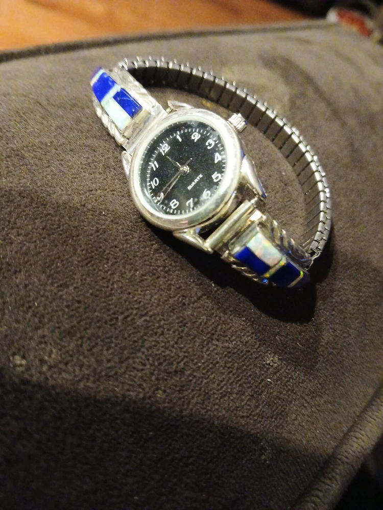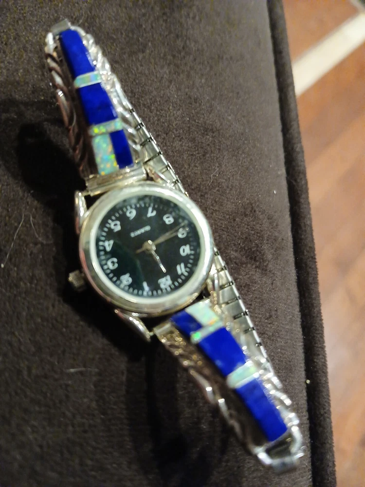 Add a touch of classic elegance to your wrist with these Navajo opal inlay watch tips. Handmade by Native American artisans, these tips are made of sterling silver and feature beautiful white opal stones. The vintage design and ethnic origin make these tips a unique addition to any jewelry collection. The watch band is perfect for women and the tips are compatible with any wristwatch. The CB brand ensures quality and the watch tips are a great accessory for any occasion. Whether you're dressing up or down, these tips will add a touch of sophistication to your outfit. Watch will need battery its new it was part of a collection not used