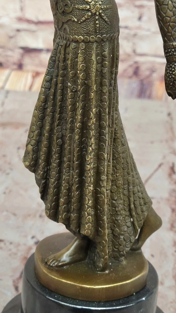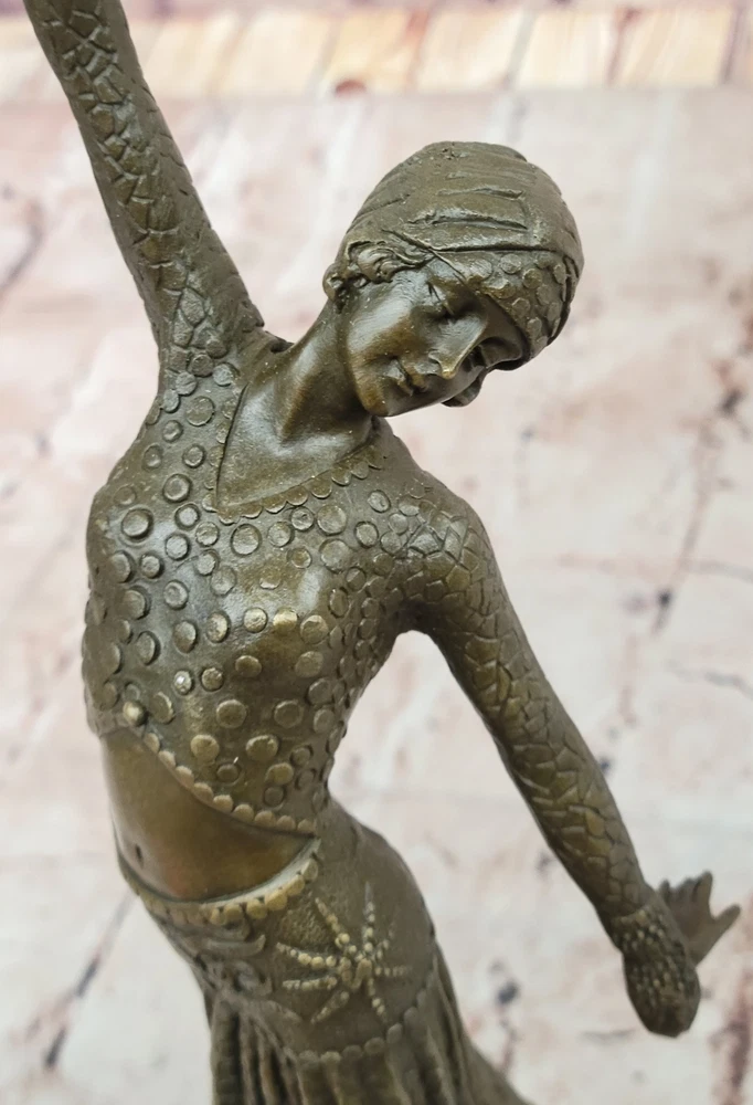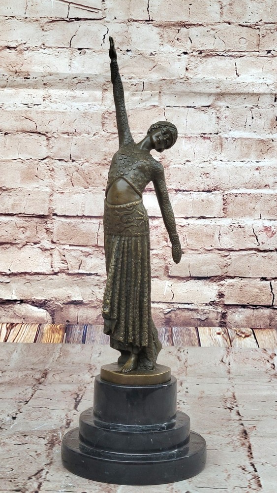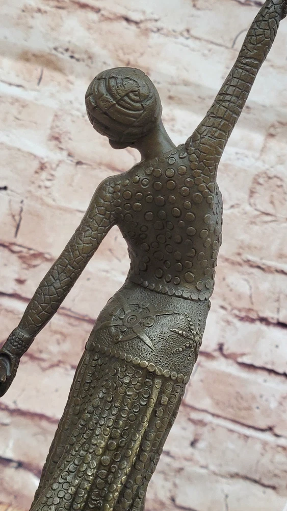 Condition : This sculpture is in perfect condition. Bronze Dimensions with Marble Base: Height 15" X Width 5" Marble Dimensions: Diameter 5" Height without base:12" Weight:8 LBS Inventory:3126SA04713 Introducing an exquisite bronze sculpture that captures the essence of an elegant dancer in all her grace and beauty. This stunning piece portrays a mesmerizing figure adorned in a captivating long flowing skirt, meticulously crafted with intricate scale-like details that add depth and texture to the artwork. With arms gracefully reaching towards the sky and earth, the dancer exudes a sense of harmony and balance. Every movement she makes radiates poise and elegance, captivating the viewer's attention. Her tilted head and exposed belly imbue her with a touch of vulnerability, revealing her emotional depth and sensitivity. Delicate facial features enhance her gentle expression, inviting a sense of connection and admiration. Completing her ensemble is a matching head wrap, which further enhances her allure and adds a touch of sophistication to her appearance. The attention to detail in every aspect of this sculpture showcases the artist's dedication to capturing the essence of the dancer's elegance and grace. Created with utmost precision and craftsmanship, this sculpture is the result of the meticulous "Lost Wax Method." This time-honored technique ensures that every nuance and detail of the original sculpture is faithfully preserved, resulting in a truly exceptional piece of art. The beautiful brown patina finish adds warmth and depth, highlighting the intricate details and bringing the sculpture to life. This remarkable artwork bears the signature of renowned artist D.H. Chiparus, representingnbsp; its quality and artistic merit. Embrace the beauty and artistry of this exquisite bronze sculpture, a testament to the captivating world of dance and the talent of its creator. Perfect for art enthusiasts, collectors, or anyone who appreciates the grace and elegance of the human form, this sculpture will become a cherished centerpiece in any space it graces. Chiparus, a celebrated Romanian Art Deco era sculptor, made Paris his home and artistic center. Born in Romania, he honed his craft under the guidance of esteemed sculptors Raffaello Romanelli, Antonin Mercie, and Jean Boucher. Demetre Chiparus, who passed away in 1947, rests in eternal peace at Bagneux cemetery, located just south of Paris. This exquisite bronze sculpture pays homage to his enduring legacy. 15'' TALL CLASSIC DANCER VITALEH BRONZE FIGURINE STATUE SIGNED FIGURE HOT CAST SA-047 Video will open in a new window Using the eBay App? Paste link into a browser window: [isdntekvideo]