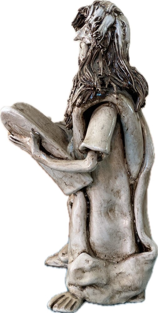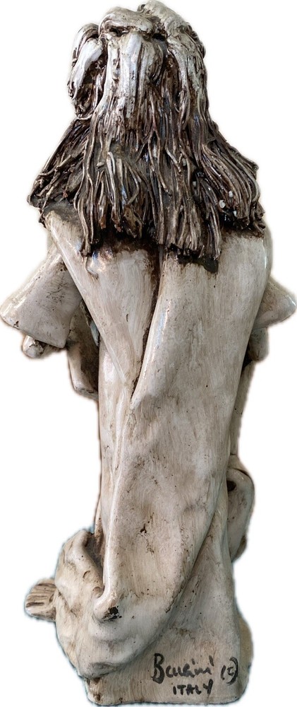 This exquisite sculpture by Dino Bencini depicts Moses holding the 10 Commandments in clay medium. The piece is signed by the artist and boasts an unknown style and production technique. The statue stands at 9.5 inches tall and 3.75 inches wide, making it a perfect addition to any collection. The sculpture is an original piece and is not a licensed reproduction. The item is located in Italy and is perfect for art collectors and enthusiasts alike. See pictures for condition of sculpture. There is cracking on the bottom of the right foot which does not affect the piece. This may have occurred during the sculpting process.