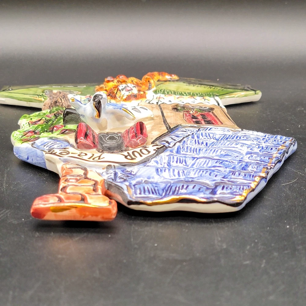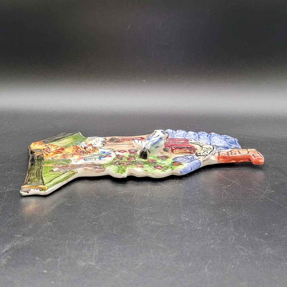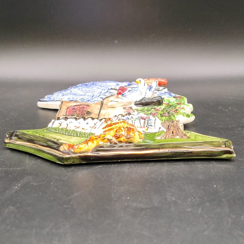 Add a touch of whimsy to your home with this charming 3D ceramic wall plaque featuring a playful cat and bird design. Perfect for adding character to any space, this piece makes a delightful gift for new home owners and animal lovers. (stand not included) • Ceramic material • Whimsical design • Cat and bird motif • Ideal for home decor • Perfect gift for new home owners and animal lovers Good used condition with some scuffs on the bird and edge of the roof. One minor chip on the back that isn't visible from the front. Please see photos for details.
