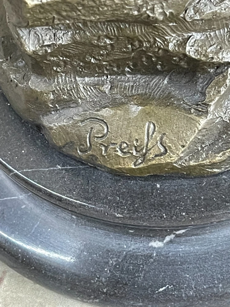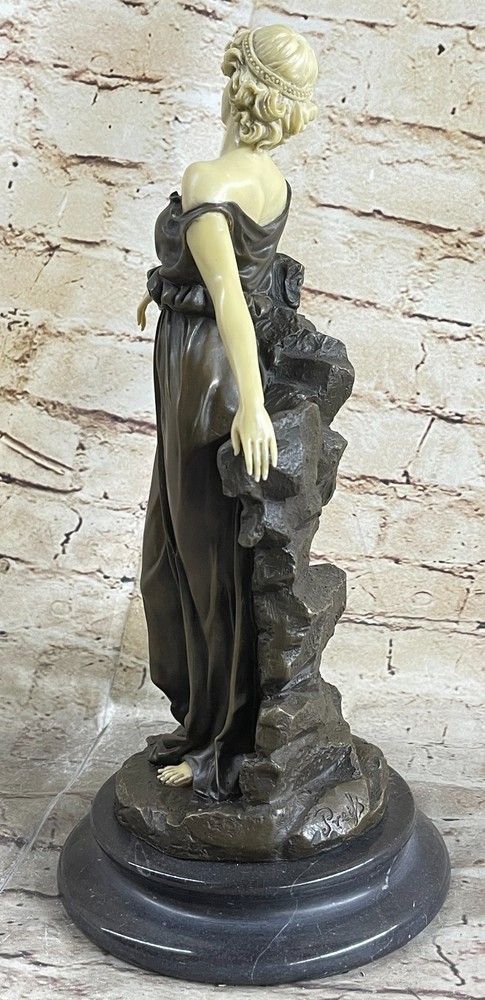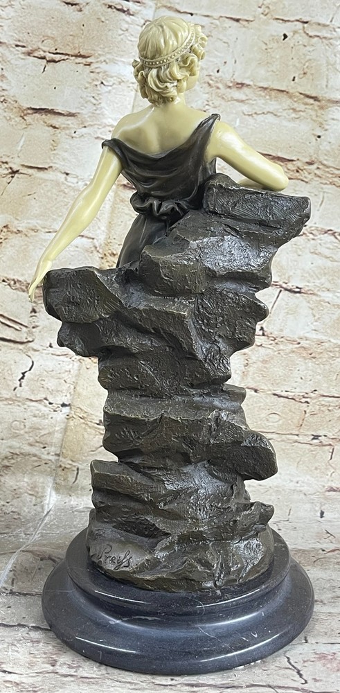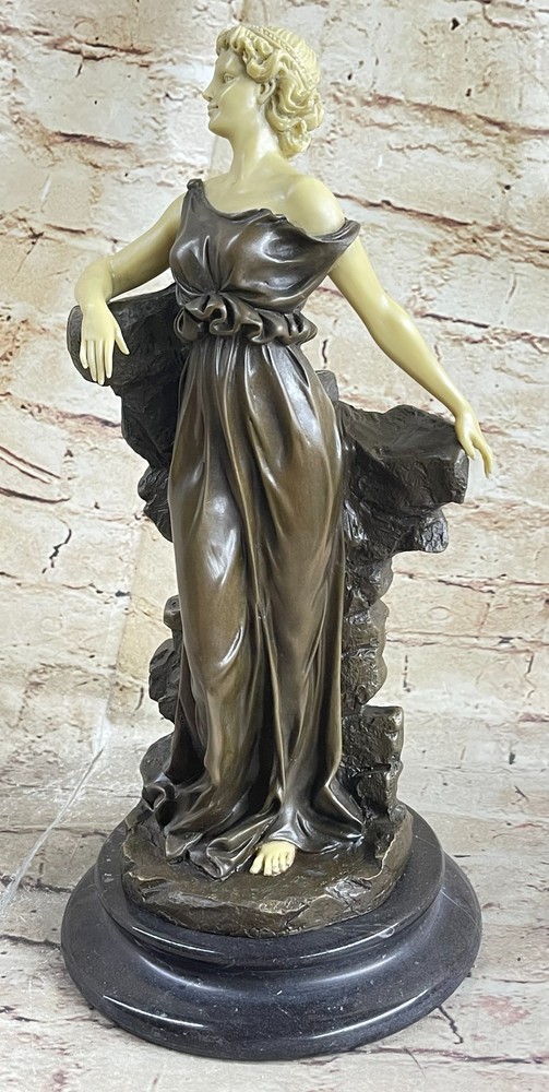 Condition : This sculpture is in perfect condition. Bronze Dimensions with Marble Base: Height 12.5" X Width 6" Marble Dimensions: Diameter 6" Height without base:11.5" Weight:9 LBS Inventory:63XQ06636 This striking sculpture portrays a captivating woman standing gracefully beside a unique and intriguing tree. She is adorned in a stunning gown that drapes elegantly over her figure, with one shoulder exposed for a touch of allure. Her gaze is turned towards her left side, as if lost in deep contemplation, adding an air of mystery to her demeanor. The woman's hair is meticulously styled, with soft curls cascading under a delicate headband, framing her face with effortless sophistication. The intricate details of her attire and hairdo are expertly captured, showcasing the skill and artistry of the sculptor. Crafted with precision using the ancient Lost-Wax Method, this sculpture boasts exceptional quality and craftsmanship. Mounted on a striking black and fire red marble base, it commands attention and makes a bold statement in any space. Signed by the artist Preiss, this piece is a testament to the beauty and timeless elegance of the female form, destined to be admired and cherished for generations to come. Additionally, the hand and arms of the sculpture are crafted from resin, enhancing its durability and lifelike appearance. 13" Western art deco bronze Roman god of wine and plants Girl Bacchus sculpture Video will open in a new window Using the eBay App? Paste link into a browser window: [isdntekvideo]
