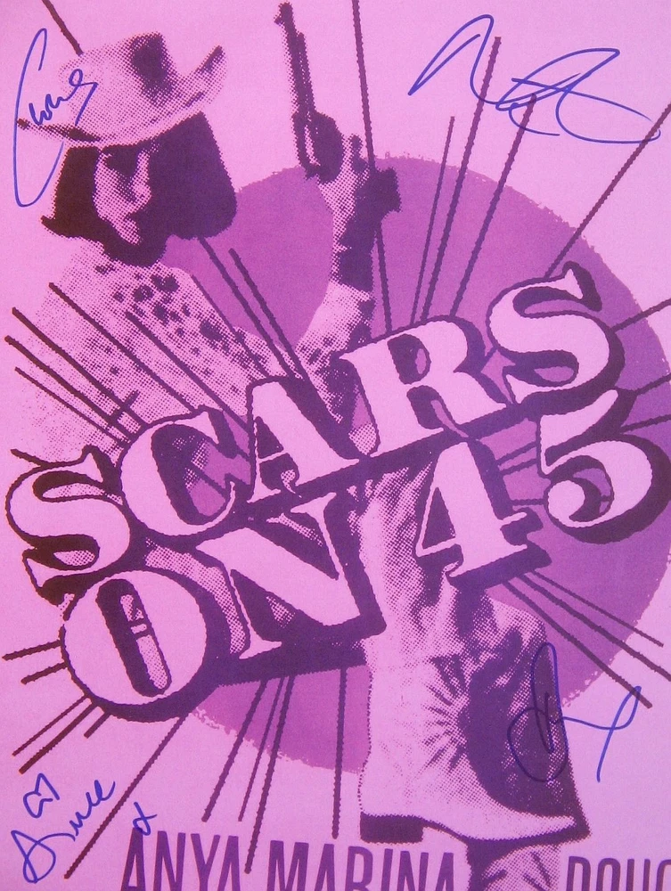 SCARS ON 45 band members autographed this gig poster in person for me at an appearance. Using blue sharpies, each signed his/her name. Signing were Danny Bemrose, Aimee Driver, David “Nova” Nowakowski, and Chris Durling. The only band member who didn't sign was Stuart Nichols, who was NOT on their current tour at the time. Upon request, buyer will receive a Certificate of Authenticity (issued by me) detailing signing information. This poster itself is hard-to-find since it was a promo only available at ticket outlets and music stores to promote a 2012 previous concert. Size is 11” by 17”. It’s in great condition for display, at least Mint/Near-Mint. It will be shipped rolled in a sturdy tube. Note, for authentication purposes, I am displaying a picture in this listing showing the band performing at the appearance. Buyer will receive the autographed poster, but will not receive a copy of the picture (it’s for informational purposes only). However, if you want the 4" by 6" photo (rolled into tube), price is an additional $3.50. See my EBAY Store and current listings to save shipping on multiple items. Shipping includes private insurance.